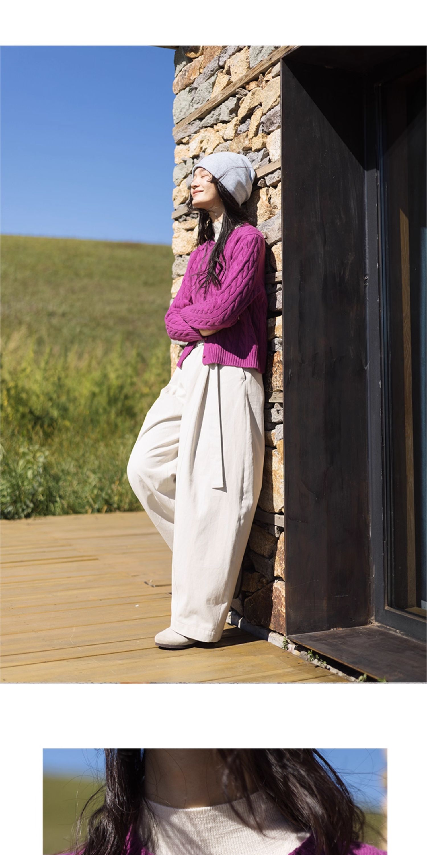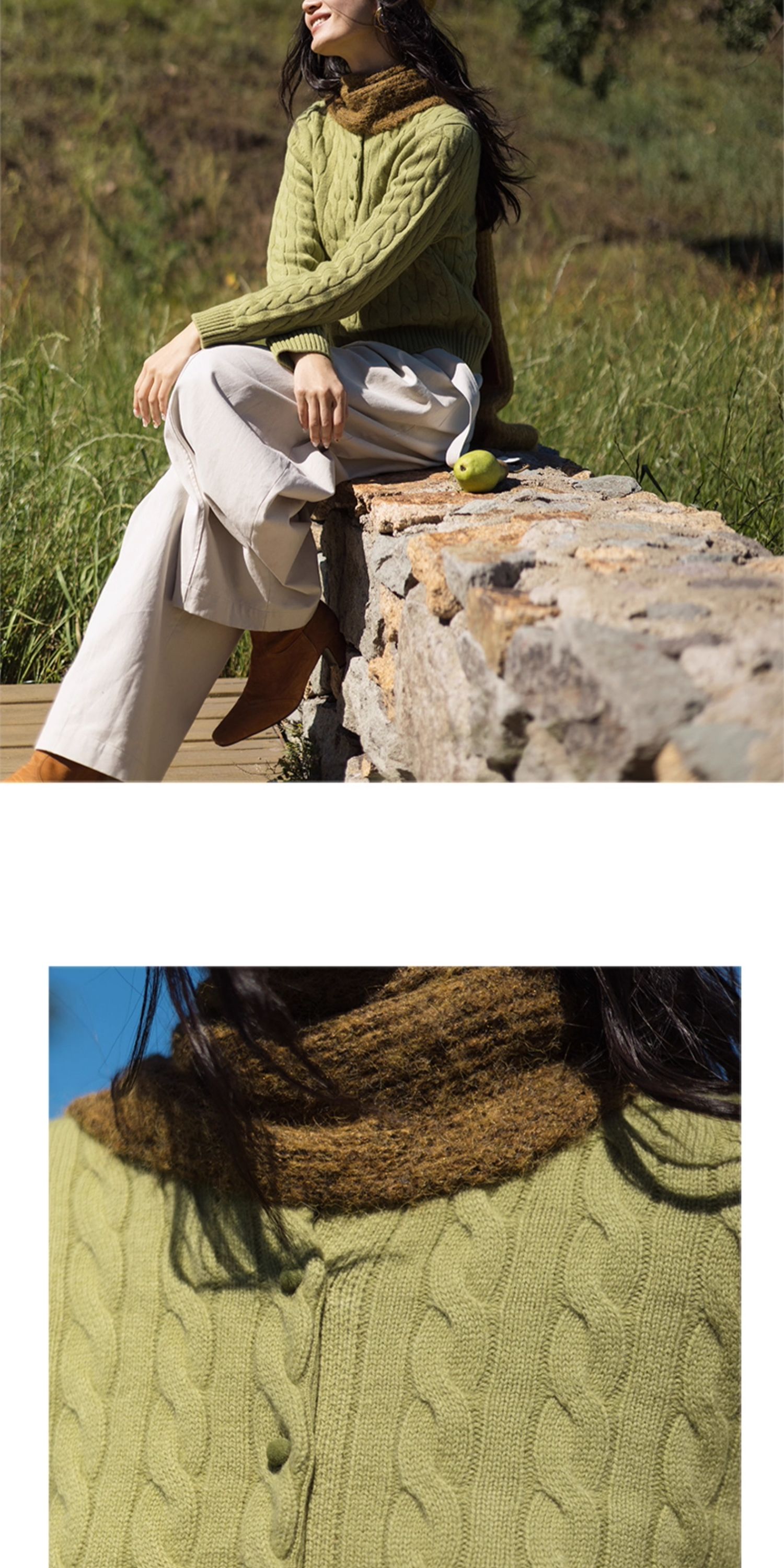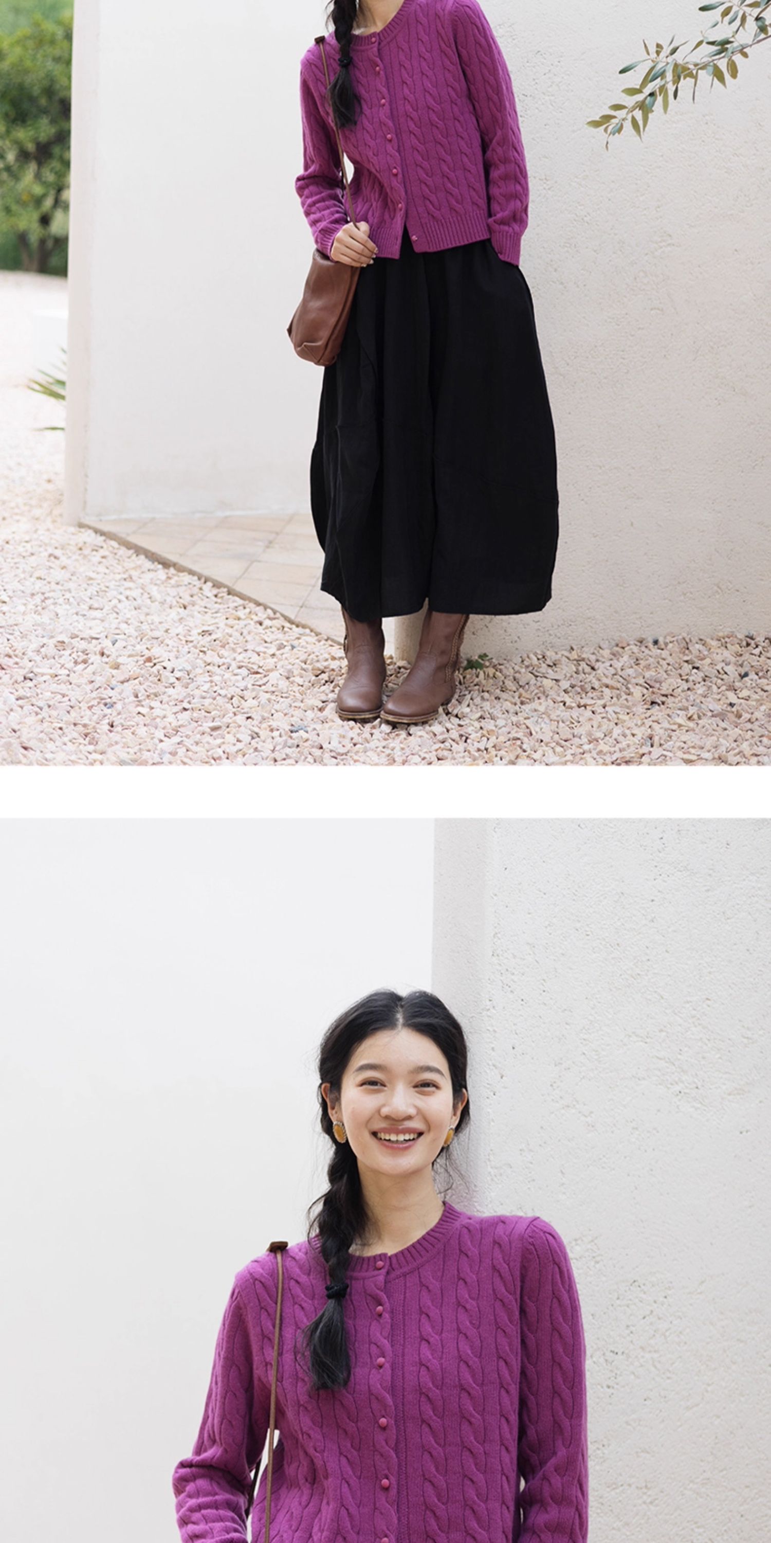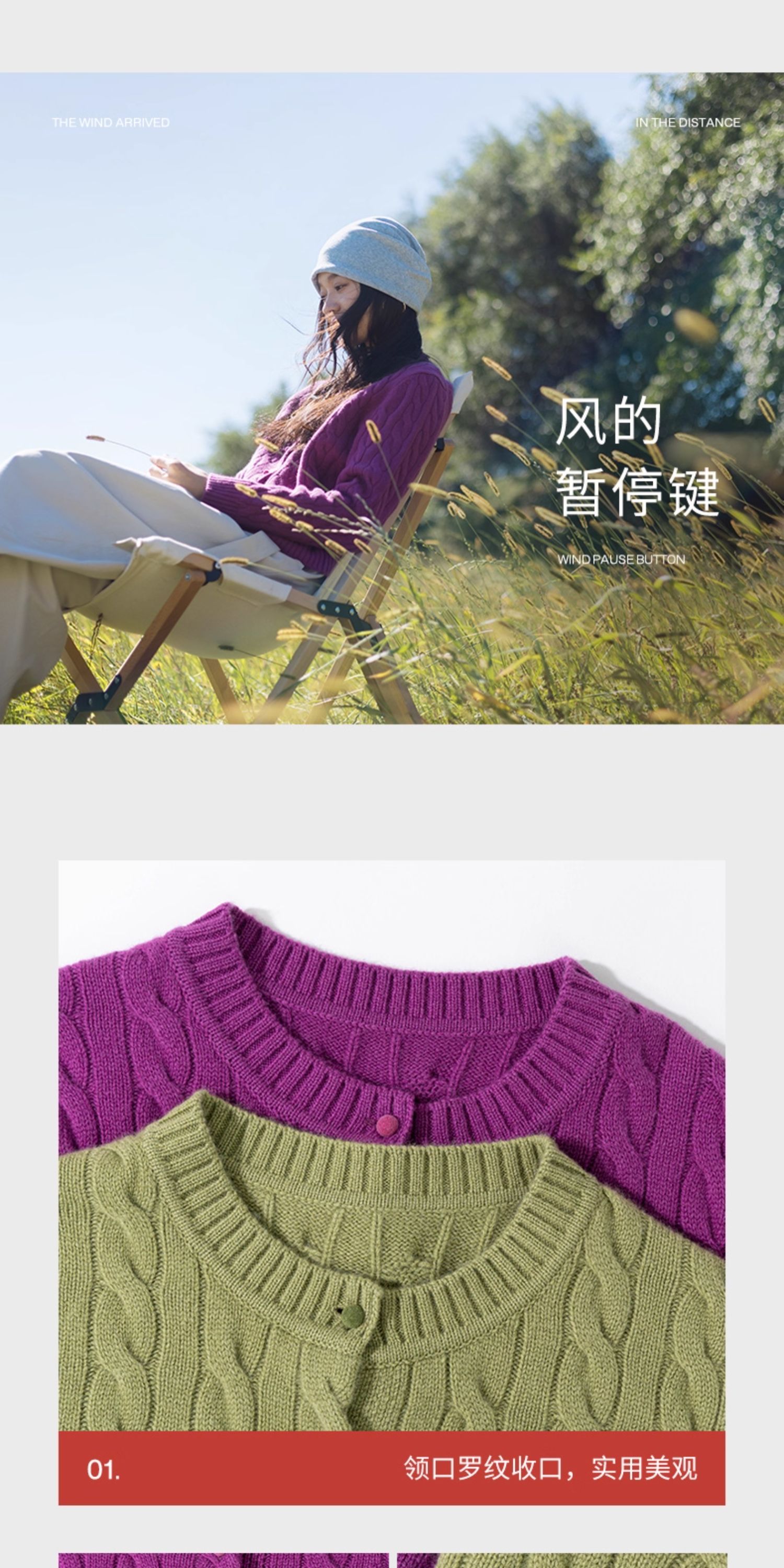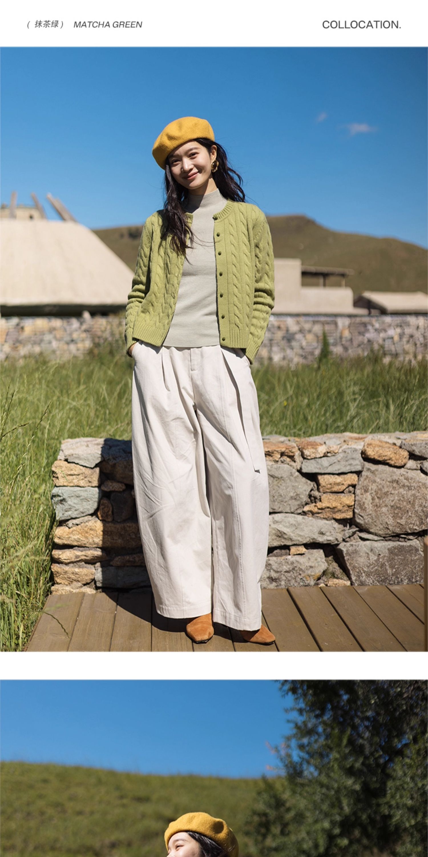 特绽放649朵/纯羊毛绞花圆领短款开襟毛针织衫女秋冬新款毛衣外套