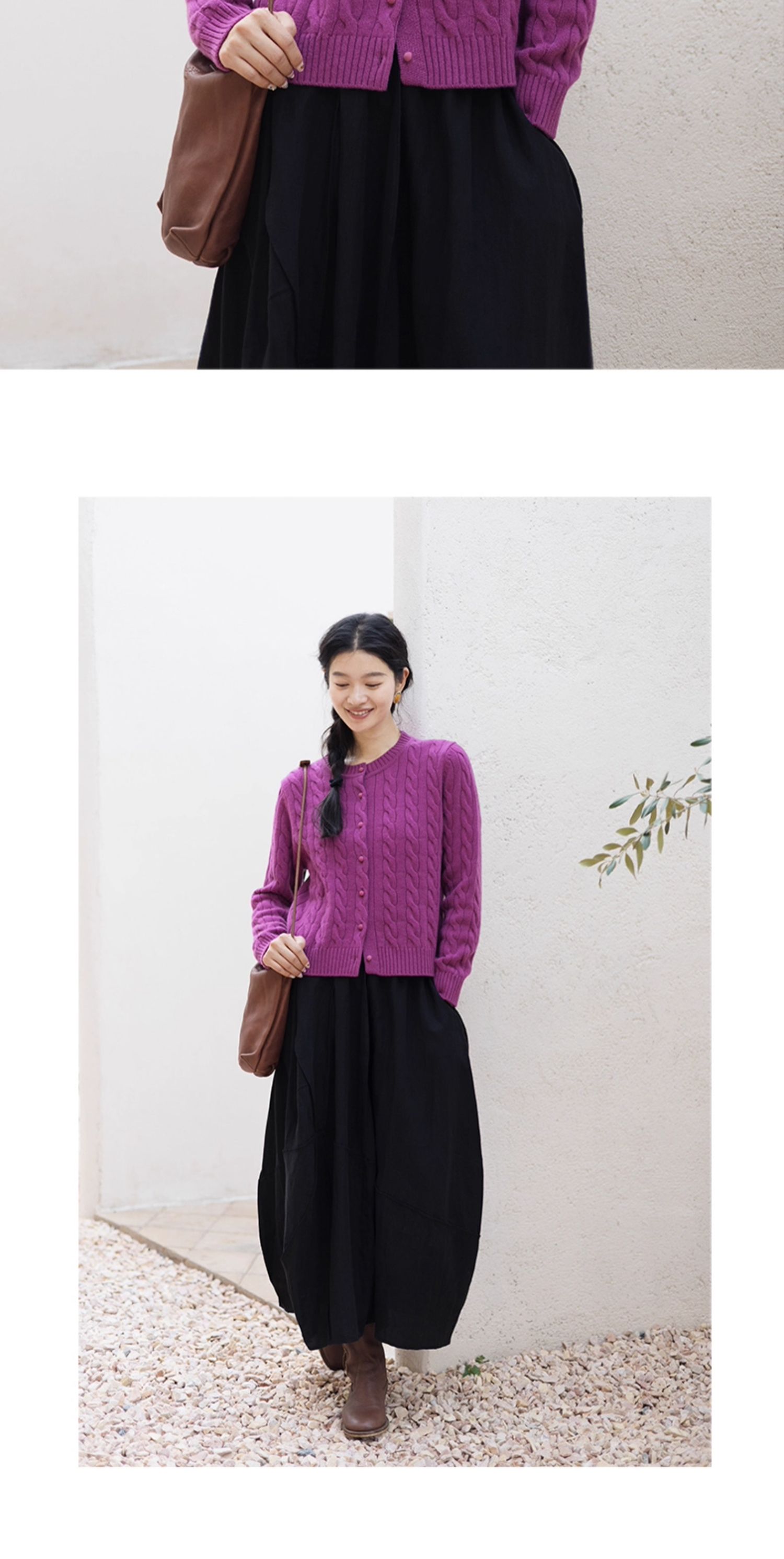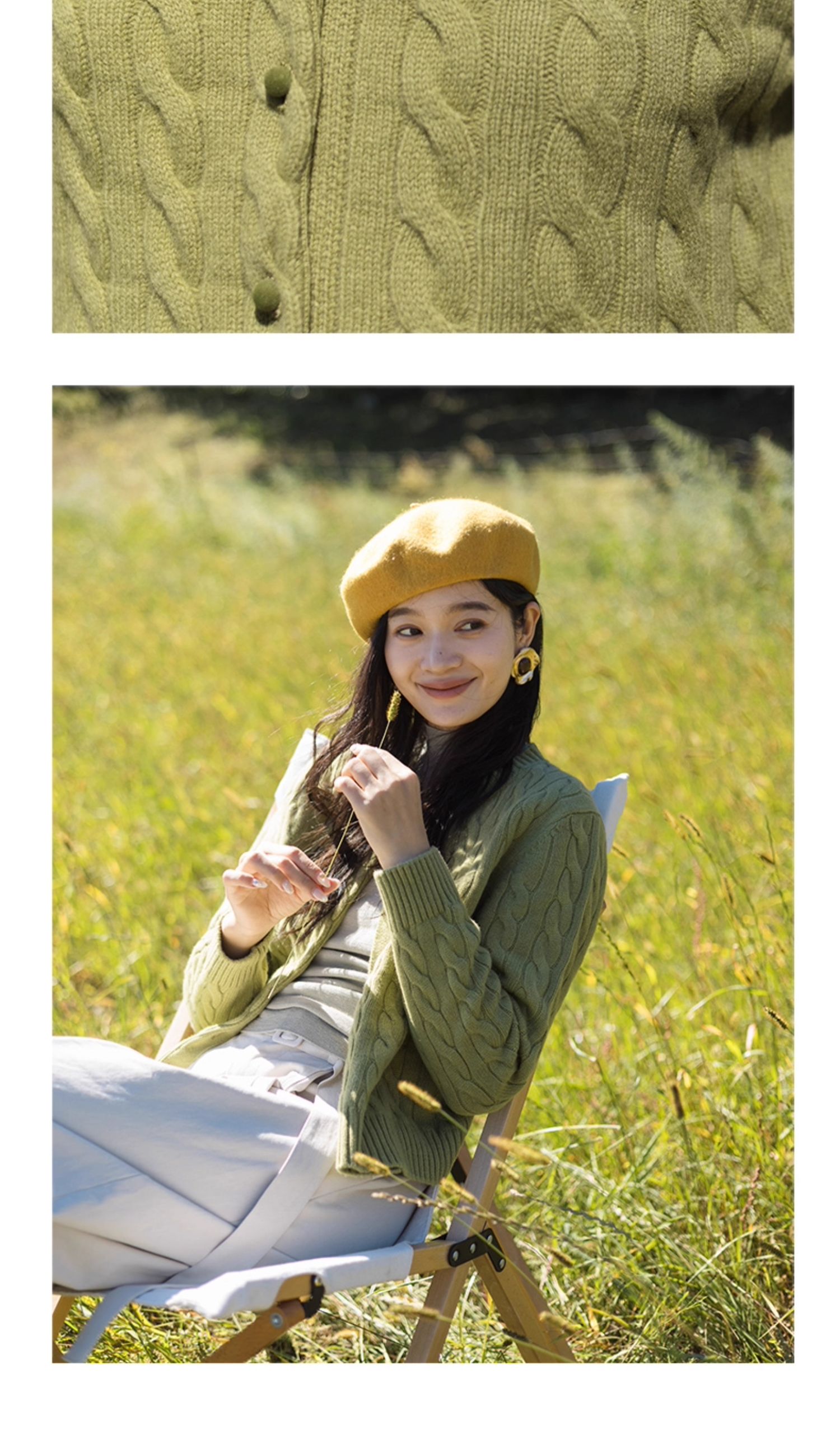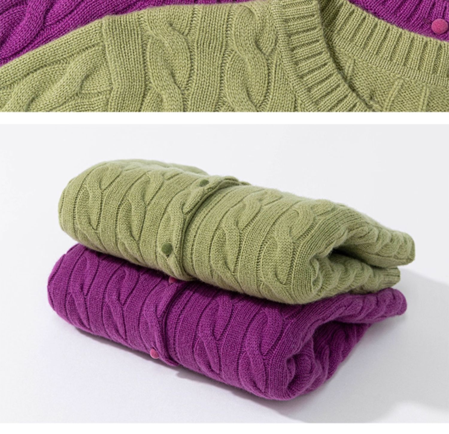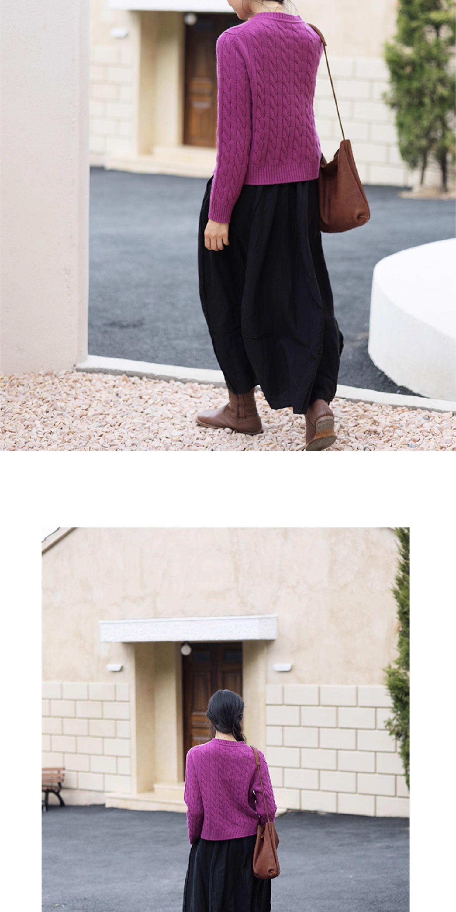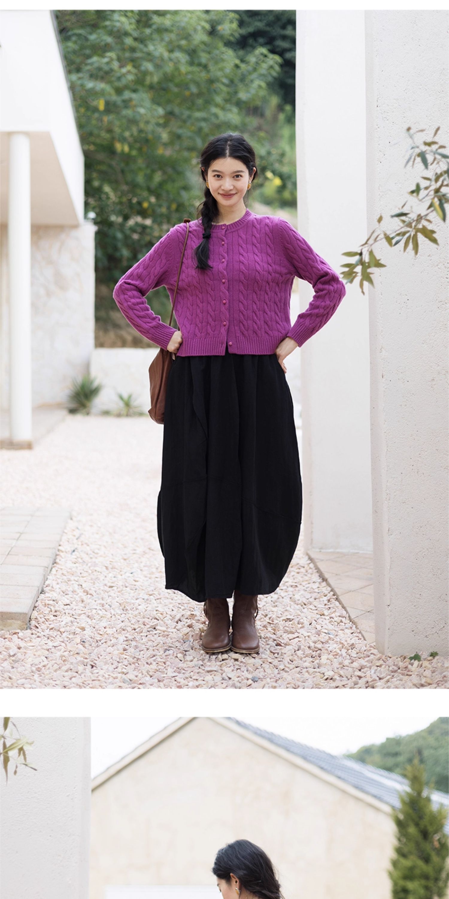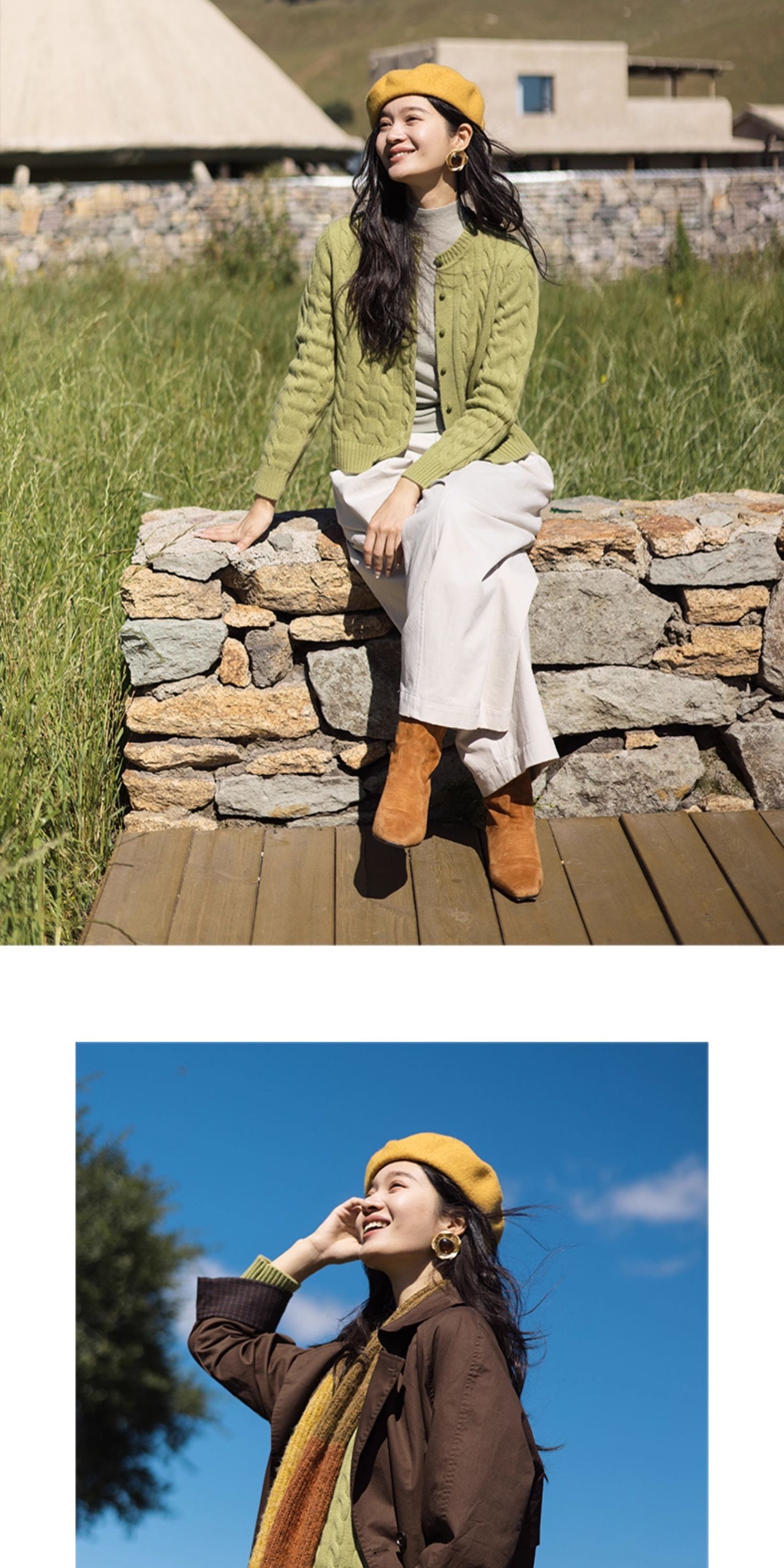 特绽放649朵/纯羊毛绞花圆领短款开襟毛针织衫女秋冬新款毛衣外套