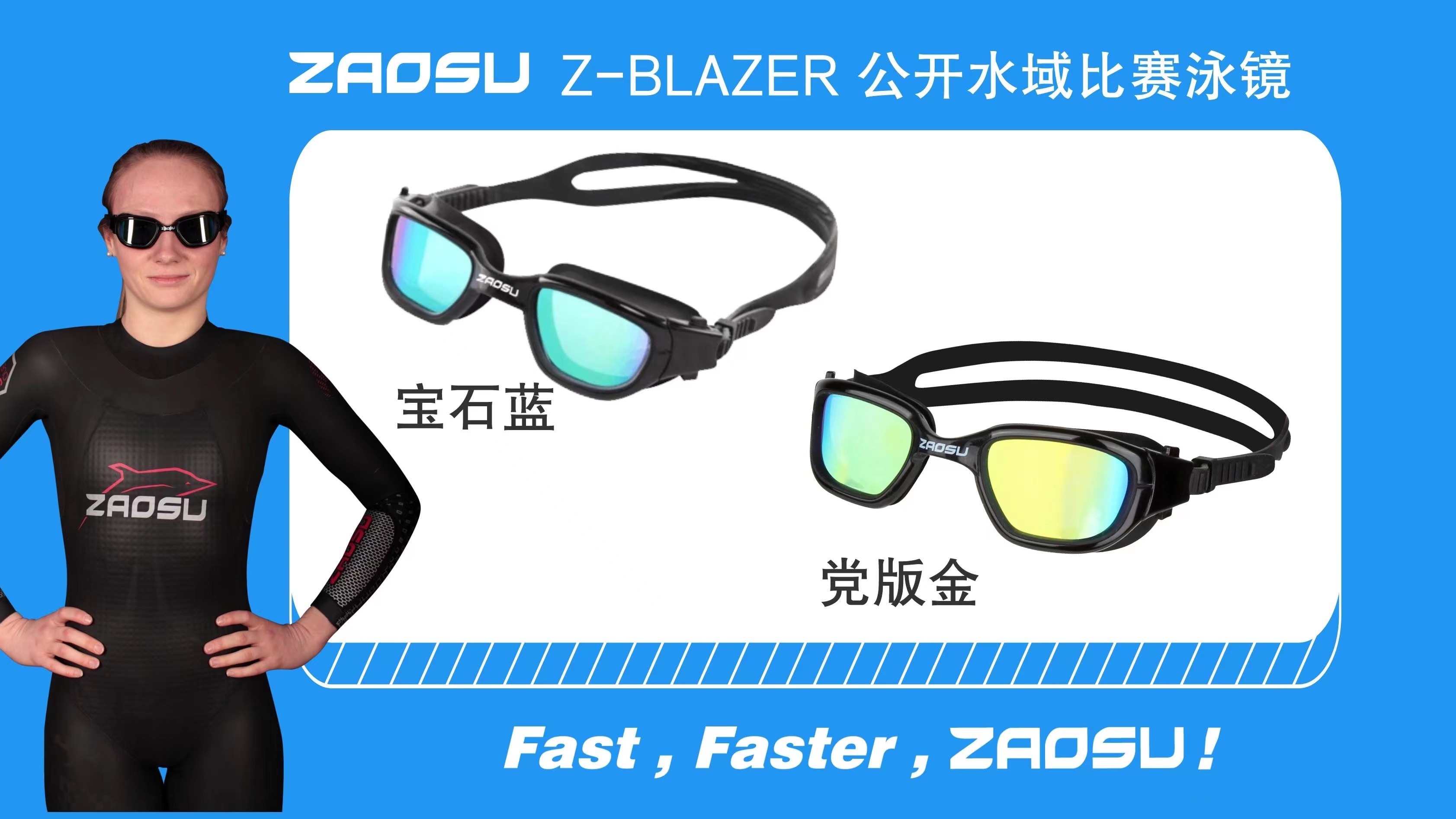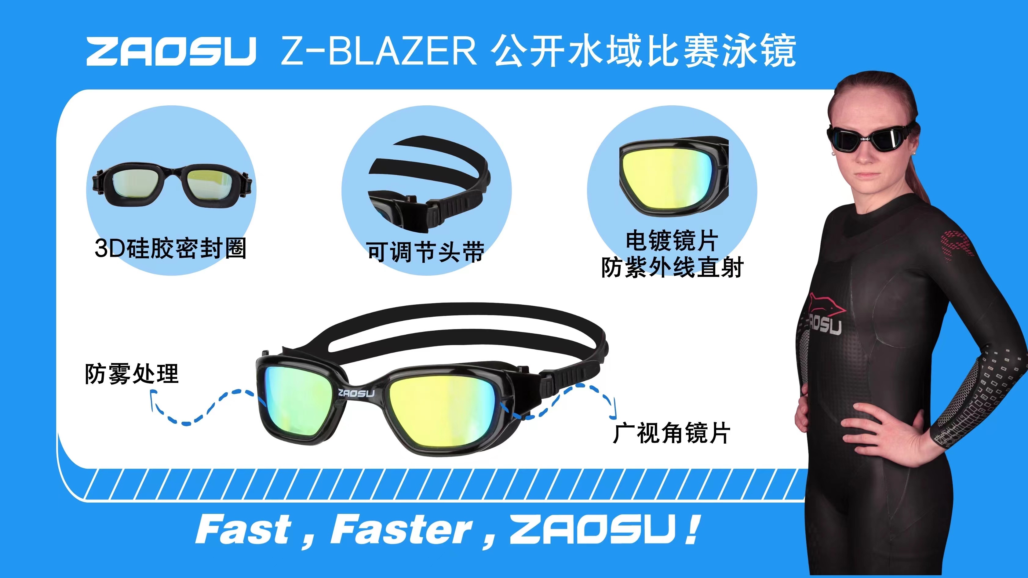 专为公开水域游泳而设计, 竞赛或者训练皆可使用。泳镜有以下特点: