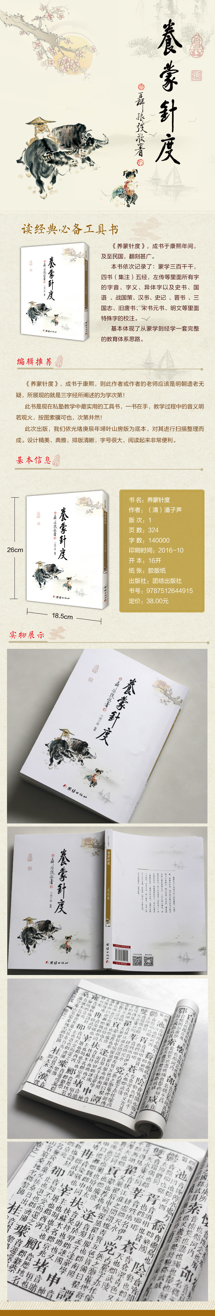 《养蒙针度》成书于康熙年间,下至民国,翻刻甚广。是书按顺序章节记録了蒙学「三百千」「四书五经」《左传》等裡面所有难字的字音、字义、异体字以及史书《国语》《战国策》《汉书》《史记》《晋书》《三国志》《旧唐书》《宋书》《元书》《明史》等裡面特殊字的校注。体现了从蒙学到经学、史学完整的教育体系的思路。此书对读经典能够起到非常方便实用的工具书作用,一册在手,所有难字音义即可明晓。既是个人学习经典的参考工具书,也是私塾、经典学习班必备的教材。