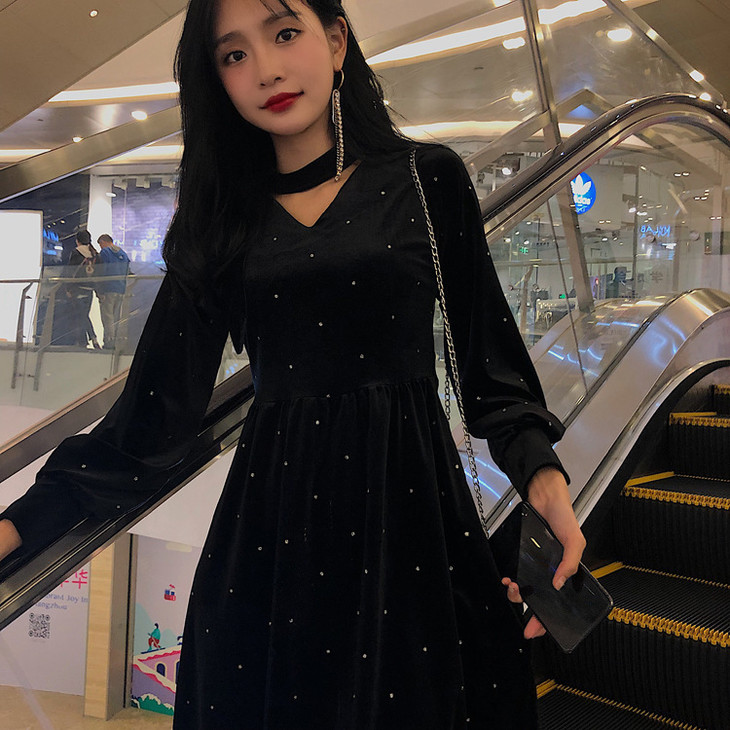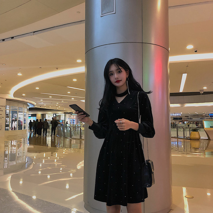 【连衣裙】小众连衣裙娃娃裙赫本风少女小黑裙金丝绒连衣裙子