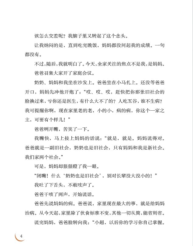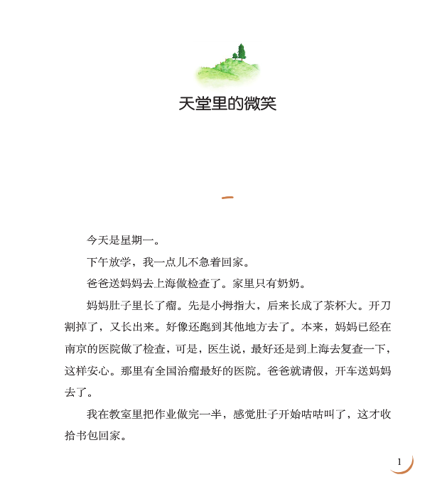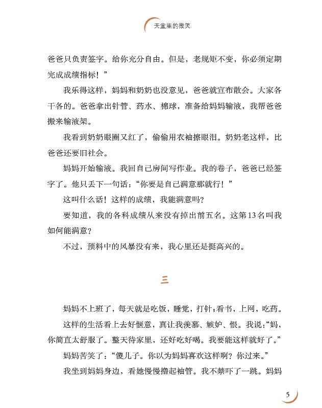 “小超,你知道吗?最后几天,妈妈从昏迷中一醒来,就问,今天是几号。她心里还在惦记你升学考试的日子。儿子,妈妈想亲眼看你上中学。妈妈总说,能多坚持一天,就可以多看到你一次……” 爸爸说着说着,眼圈红了。他顿了顿,接着问我:“还有,儿子,你知道妈妈为什么一直住在医院里吗?”我说:“妈妈说过,为了方便治疗。”