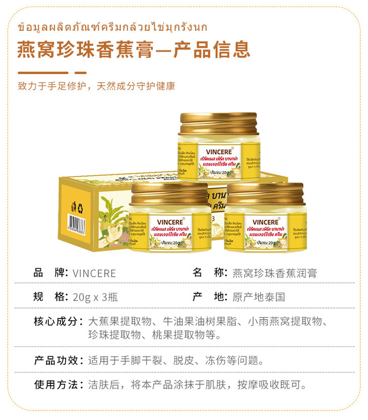 【超值3瓶装】泰国VINCERE燕窝珍珠香蕉膏 解决干裂、手足裂口 滋润保湿嫩滑肌肤修复手足脱皮开裂四季可用