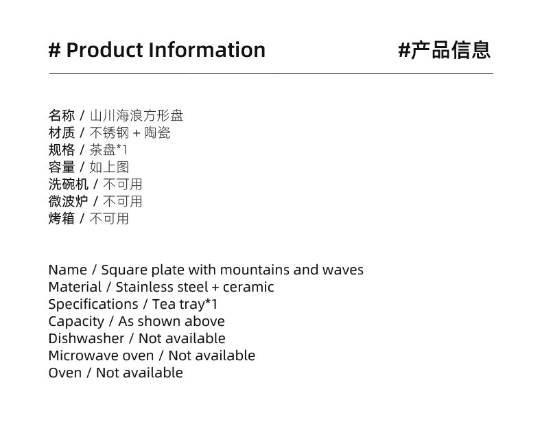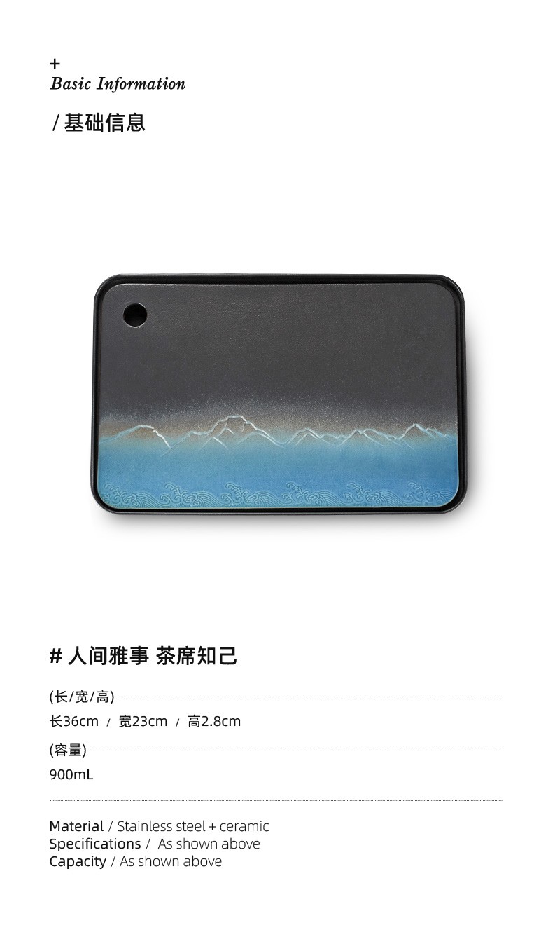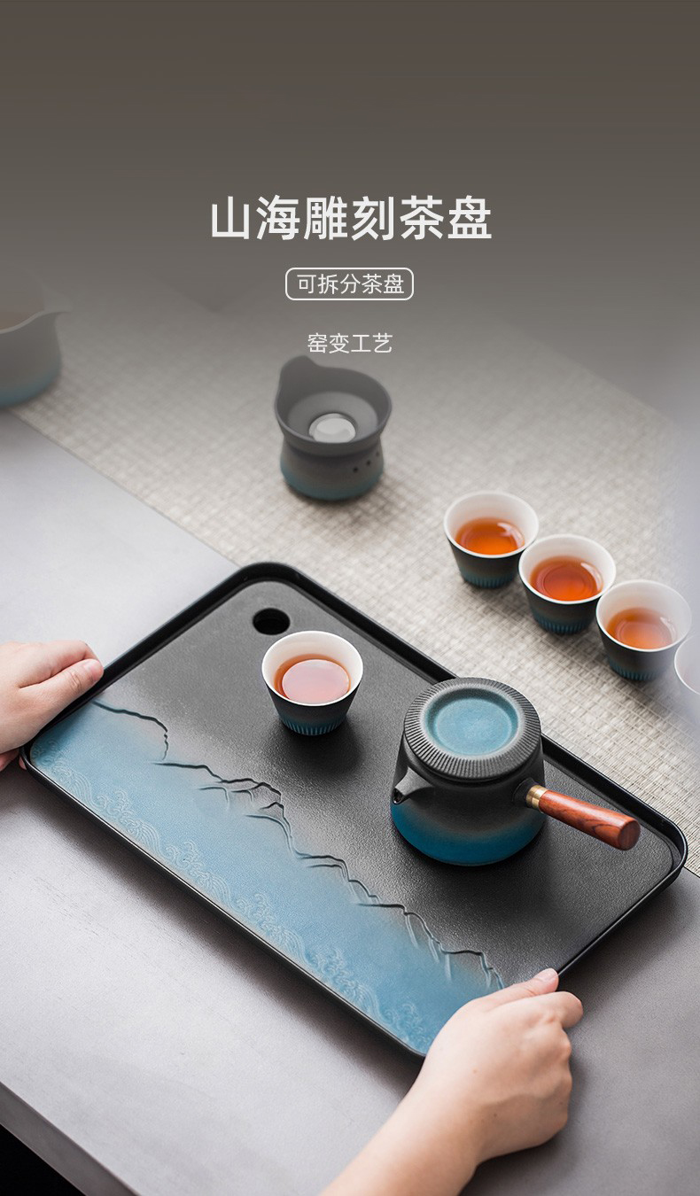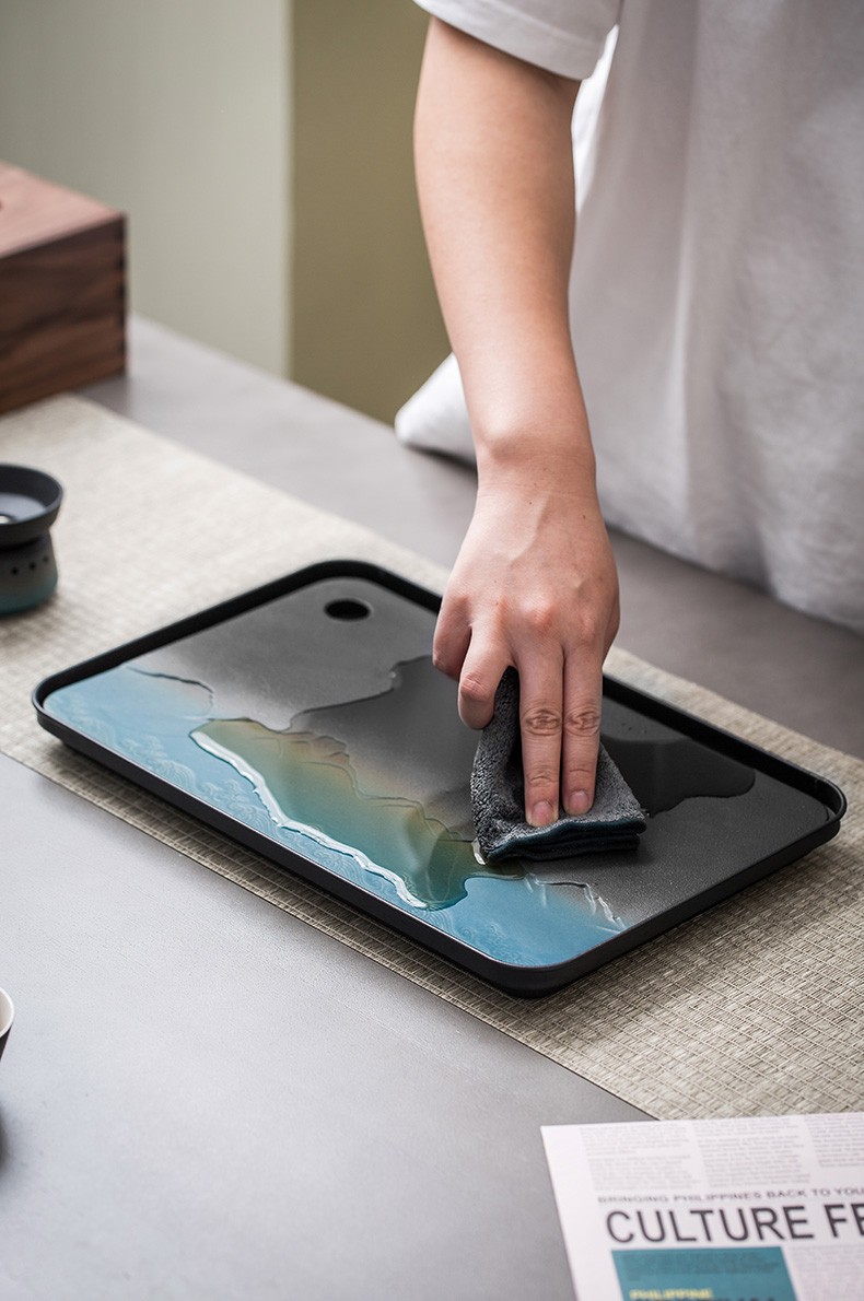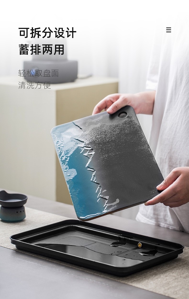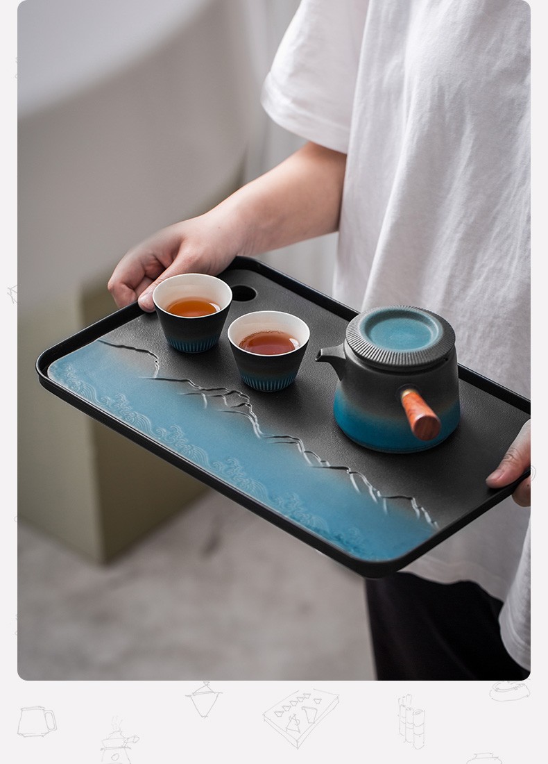 陶瓷茶盘家用小型茶托盘干泡台储水泡茶盘功夫茶具托盘排水式茶海 伊-山川海浪方形盘S3a