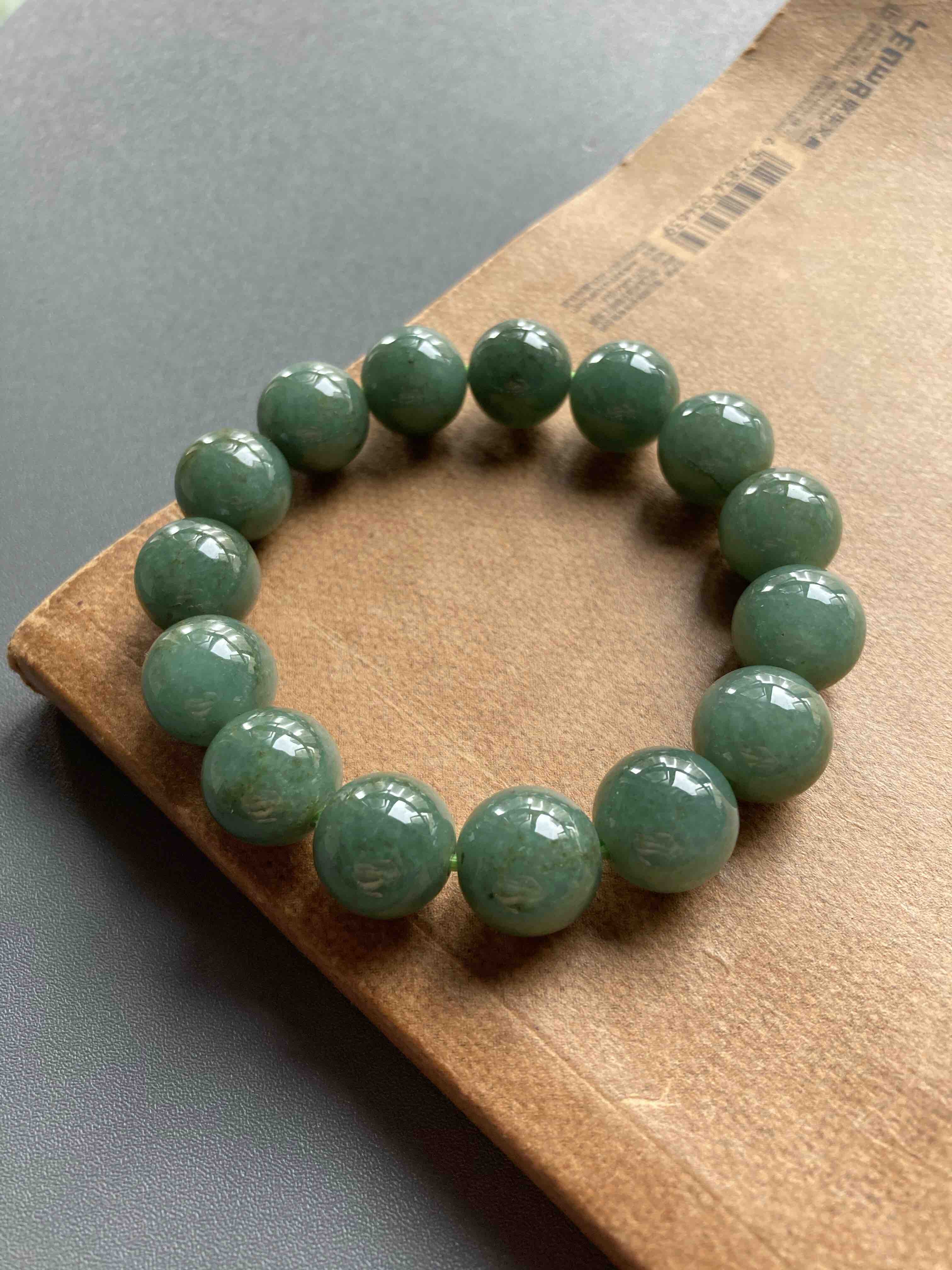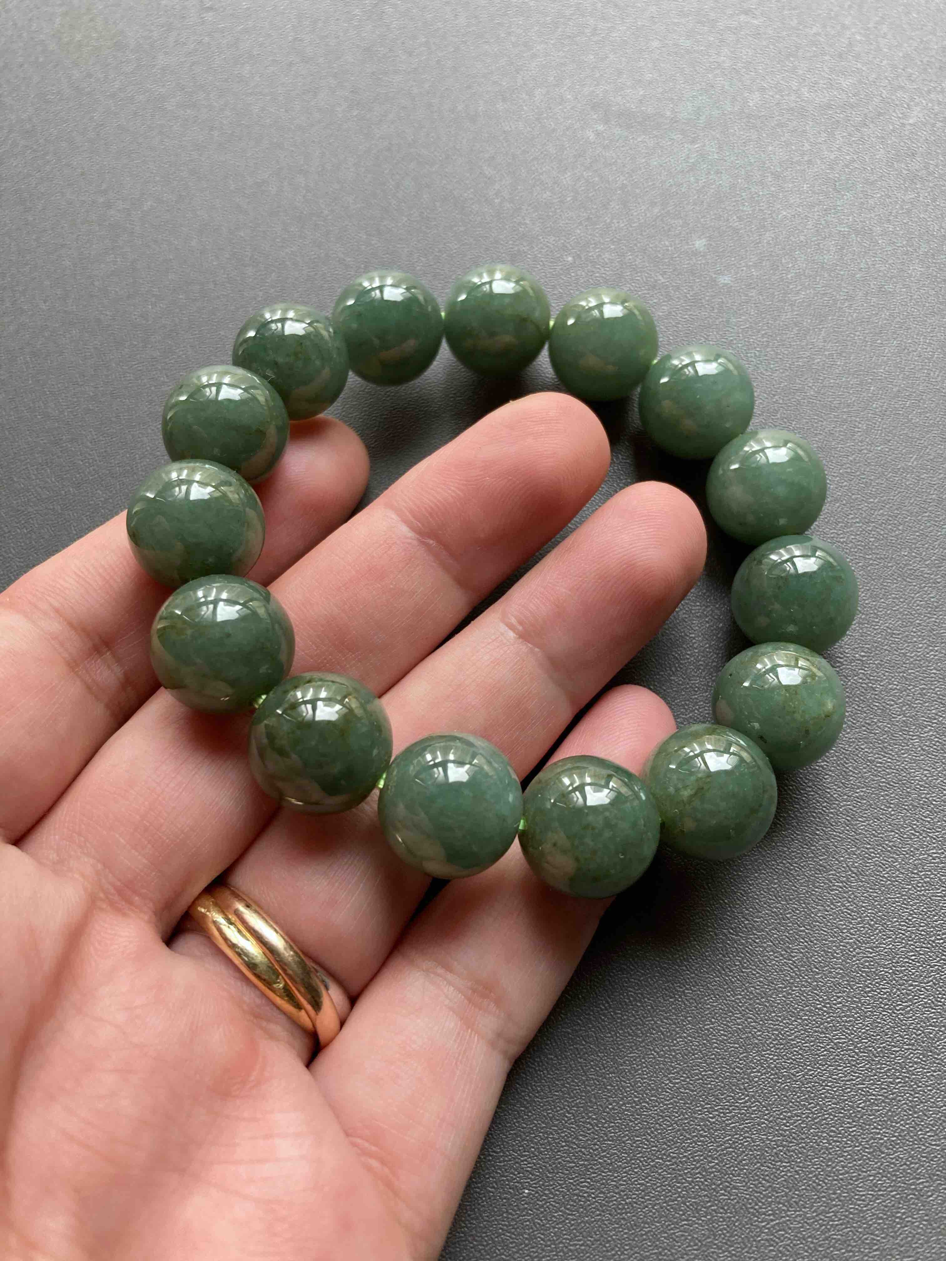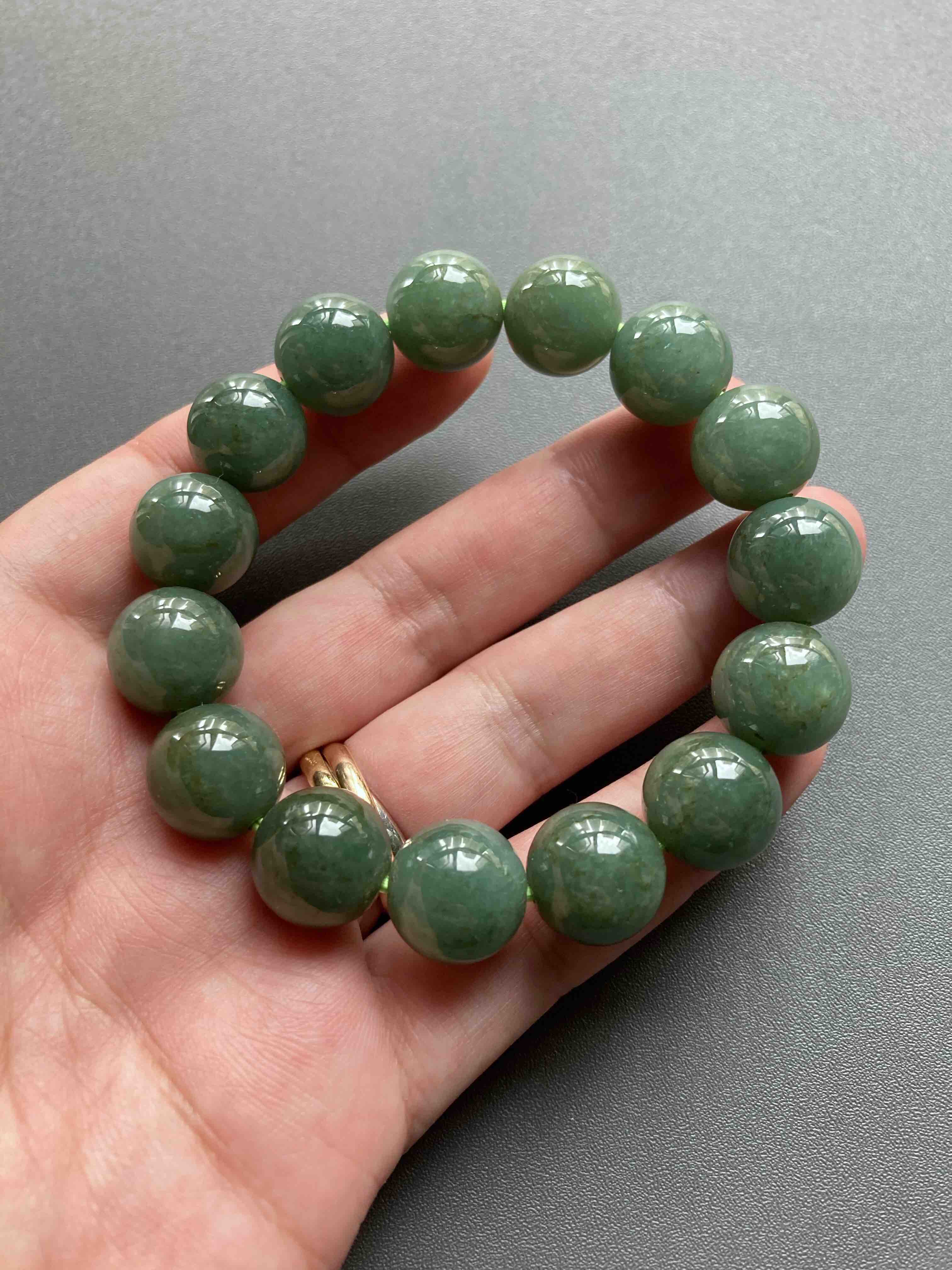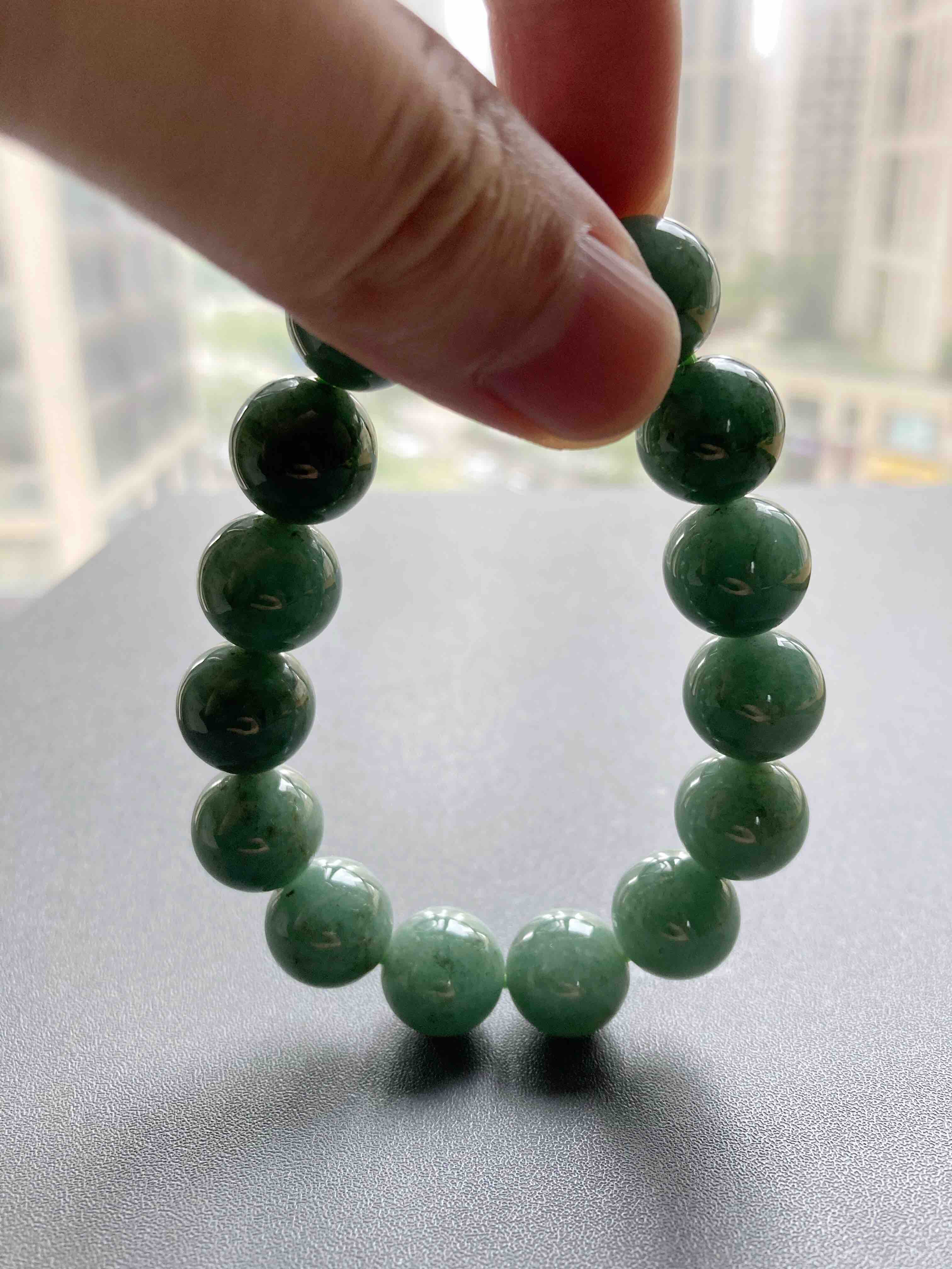 糯种墨绿翡翠大珠串手串,这样的大珠串才给力,14mm珠子大小,糯种墨绿色,珠子大,上手贵气,翡翠料做大珠子不容易,遇到了千万别错过,便宜又好,收了就对了