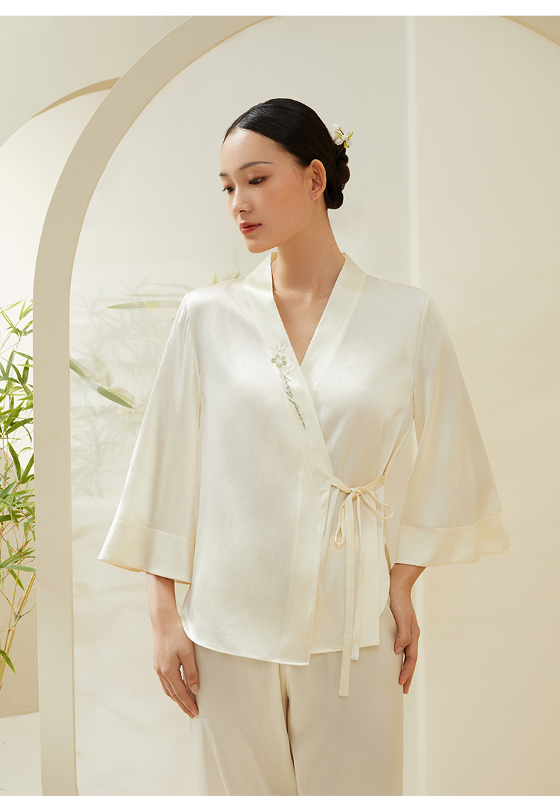 节日礼物】金三塔桑蚕丝弹力绸缎女刺绣花衣裤套可外穿家居服真丝睡衣 YSFDA205