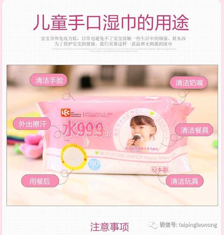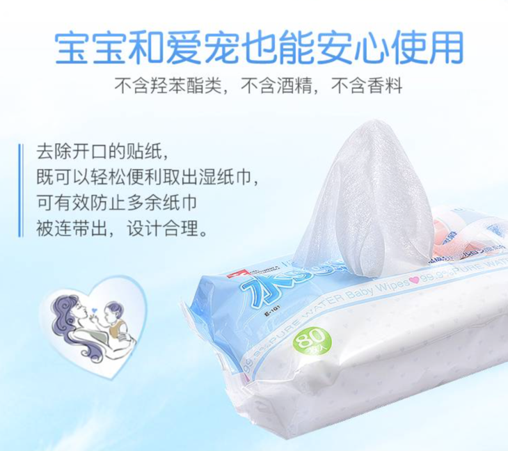 LEC纯水婴幼儿系列湿巾,含高达99.9%的蒸馏水,无酒精无香料无防腐剂,纯天然地保护宝宝!