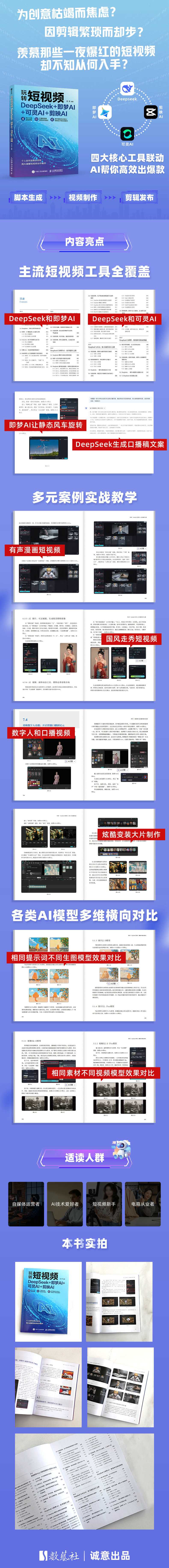 在AI浪潮席卷全球的今天,短视频创作已从“人力密集型”迈向“智能驱动型”。本书以四大核心工具为脉络,为创作者揭开AI赋能内容生产的无限可能。从技术原理到实战应用,从静态画面到动态视频,从个人创作到商业变现,本书构建了一条从“小白”到“大师”的进阶之路。第1章以“AI智创便捷生活”为起点,深入解析DeepSeek的开源大模型如何打破技术壁垒,即梦AI与可灵AI如何依托字节跳动与快手生态重塑视频生成范式,以及剪映AI如何通过智能化剪辑工具降低创作门槛。第2章至第6章则以实战为核心,通过DeepSeek与即梦AI联动生成有声漫画、科幻短片,揭秘剧情生成与分镜设计的底层逻辑;更以剪映AI为枢纽,解锁绘画风格、口播视频、音乐制作的创意玩法,让静态艺术与动态表达无缝衔接。第7章聚焦口播视频与音乐制作的深度攻略,通过“美妆平价好物分享”等案例,呈现AI如何从脚本生成到后期剪辑全程赋能,让创作者在效率与品质间找到平衡。岳伟湖南大众传媒职业技术学院副教授,中国电影剪辑学会短片短视频艺术委员会理事,Adobe中国认证教师。近年主持省厅级课题3项,参与省级课题6项;主持省级精品在线课程一门,参与国家级教学资源库子项目2项;获专利2项;主编教材4本,专著1部;指导学生参加省级及以上竞赛获奖三十余次。目前主要从事音视频、数字影像等领域教学、研究与实践工作。第 1章AI,智创便捷生活1.1 AI 视觉革命:图像与视频生成技术前沿探索 0081.1.1 图像生成:从静态到动态的视觉范式革新 0081.1.2 视频生成:时空维度的智能叙事 0081.1.3 跨模态生成技术的产业价值 0091.2 DeepSeek:开源大模型的破局者 0131.3 即梦AI:字节跳动的AI创作引擎 0141.3.1 核心功能解析 0141.3.2 技术突破与行业价值 0161.4 可灵AI:快手的视频生成专家 0171.4.1 核心功能解析 0171.4.2 技术架构与创新 0181.4.3 应用场景与生态价值 0181.5 剪映AI:全民级智能剪辑助手 0191.6 如何利用 AI 在视频制作中取得成功 0211.6.1 案例:当AI成为新世界的“普罗米修斯之火” 0211.6.2 案例:AI改编MV,“玫瑰”变“没贵” 0221.6.3 案例:以AI为桥,拆解品牌艺术 0231.6.4 案例:丹麦旅游局邀你重构旅行意义 023第 2章借助即梦AI之力解锁视频生成核心秘籍2.1 ?文本驱动,开启视频创作新篇:文本生视频 ?0262.2 ?以图为引,绘就动态影像:图片生视频 0282.3 ?巧用首尾帧,精准把控视频起与终 0292.4 ?实战案例:静态花蕾到绚烂花朵的华丽蜕变 0302.5 ?实战案例:风车轻旋,邂逅田园风情 0322.6 ?实战案例:梦幻无缝转场,让画面自然衔接 035第3章DeepSeek与即梦AI:故事创作之路3.1 ?DeepSeek 剧情生成底层逻辑揭秘 0403.2 ?即梦 AI 故事创作功能深度剖析 0413.2.1 即梦 AI 界面快速上手 0413.2.2 即梦 AI 特色功能亮点解读 0423.3 ?DeepSeek 创作提效秘籍:精准度进阶攻略0443.3.1 技巧 1:锚定创作方向,细化内容需求 0443.3.2 技巧 2:精设角色背景,夯实故事根基 0453.3.3 技巧 3:紧扣剧本脉络,按需调整输出 0463.3.4 技巧 4:巧用多轮问询,深度打磨创作 0463.4 ?实战案例:有声漫画短视频创作全流程解析 0473.4.1 DeepSeek 驱动故事剧情生成流程 0473.4.2 DeepSeek 赋能人物特征 0483.4.3 DeepSeek 助力对话向分镜图集转化 0503.4.4 即梦 AI 场景氛围强化实操要点 0513.4.5 剪映平台有声漫画制作实操步骤 0553.4.6 抖音平台视频分享流程指引 0593.5 ?实战案例:科幻短视频《星际空间》的制作 0623.5.1 分镜素材导入:搭建科幻世界的基石 0623.5.2 DeepSeek 分镜设计:规划奇幻的太空之旅 0643.5.3 分镜图片转视频:让静态画面动起来 0653.5.4 视频补帧与超清处理:提升视觉体验 0693.5.5 导出至剪映:整合素材与创意 0713.5.6 故事对白设计:用 DeepSeek 编写故事对白 0723.5.7 视频剪辑:雕琢科幻短片的细节 073第4章DeepSeek与可灵AI:探寻前沿设计之路4.1 ?深度揭秘:图像生成模型特性全解析 0804.1.1 可图 1.0 模型 0814.1.2 可图 1.5 模型 0814.2 ?解锁视频模型:深度剖析可灵 AI 魅力 0814.2.1 可灵 1.0 模型 0824.2.2 可灵 1.5 模型 0834.2.3 可灵 1.6 模型 0834.3 ?DeepSeek:一键生成惊艳设计方案 0844.4 ?实战案例:视觉设计领域的全面突破与应用 0854.4.1 生成室内设计图片 0854.4.2 生成二维设计图 0864.4.3 生成服装产品图片 0874.4.4 生成珠宝设计图片 0874.4.5 生成产品包装设计图片 0884.4.6 生成建筑设计图片 0894.5 ?特别案例:敦煌飞天主题秀,AI演绎古韵新风 0904.5.1 用 DeepSeek 细腻描绘面部 0904.5.2 用 DeepSeek 精雕服饰细节 0914.5.3 用 DeepSeek 勾勒发型妆容 0924.5.4 用 DeepSeek 捕捉动作细节 0944.5.5 AI 图片:生成绝美模特影像 0964.5.6 AI 视频:生成模特走秀视频 096第5章DeepSeek与即梦AI:解锁神奇联动奥秘5.1 ?图片模型参数:全方位深度对决 1005.1.1 图片 2.1 模型 1015.1.2 图片 2.0 Pro 模型 1025.1.3 图片 2.0 模型 1035.1.4 图片 XL Pro 模型 1035.2 ?实战案例:老照片焕新,即梦 AI 视频模型多维对比 1045.2.1 视频 S2.0 模型 1065.2.2 视频 S2.0 Pro 模型 1075.2.3 视频 P2.0 Pro 模型 1085.2.4 视频 1.2 模型 1095.3 ?DeepSeek:一键生成摄影灵感提示词 1105.4 ?与DeepSeek对话获取灵感 1125.5 ?实战案例:在即梦AI中,与DeepSeek共谱摄影华章 1135.5.1 生成微缩摄影图片 1135.5.2 生成风景摄影图片 1155.5.3 生成航拍摄影图片 1165.5.4 生成人像摄影图片 1175.5.5 生成野生动物摄影图片 1175.5.6 生成水下摄影图片 1185.5.7 生成星空摄影图片 1185.6 ?特别案例:大熊猫生活习性知识类科普视频 1195.7 ?奇妙案例:将梦境具象化,开始奇