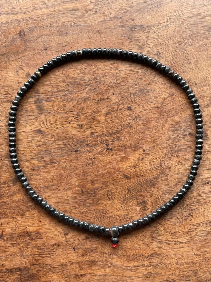 尺寸: 牛角珠共111粒,扁圆珠109粒,每粒对口距:0.5厘米,横径:0.75厘米。大三通珠一粒,对口距:0.7厘米,横径:1.2厘米,小尾珠一粒,对口距:0.65厘米,横径:0.8厘米。总长度:63厘米,重量:28.7克。