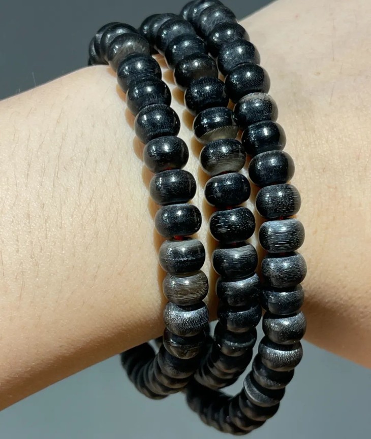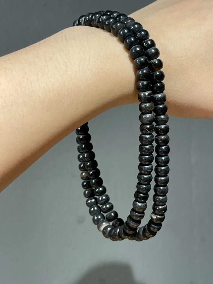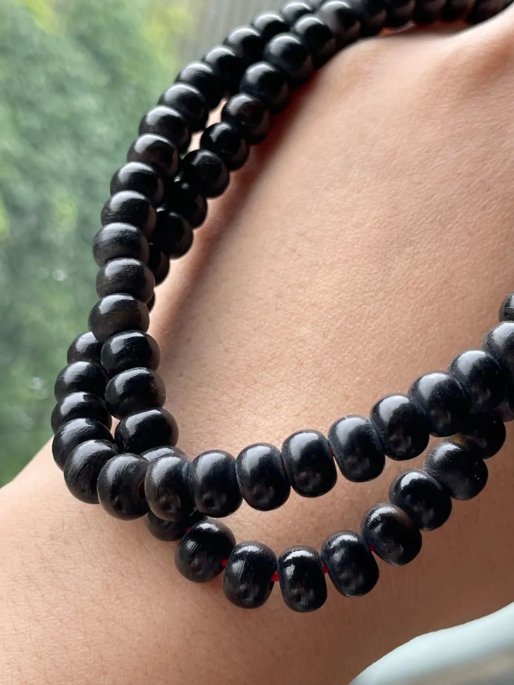这是一串以黑灰相间的水牛角精致雕琢而成的扁圆珠共111粒串成的长项链,取材质地坚硬黑灰两色水牛角,琢磨成小扁圆珠共109粒,加一粒大三通珠与一粒小尾珠串成一条长逾六十厘米的长項链,天然水牛角黑灰相间纹理精緻,质地坚硬、包浆皮壳渾厚温润,是相对少见的老佛珠。