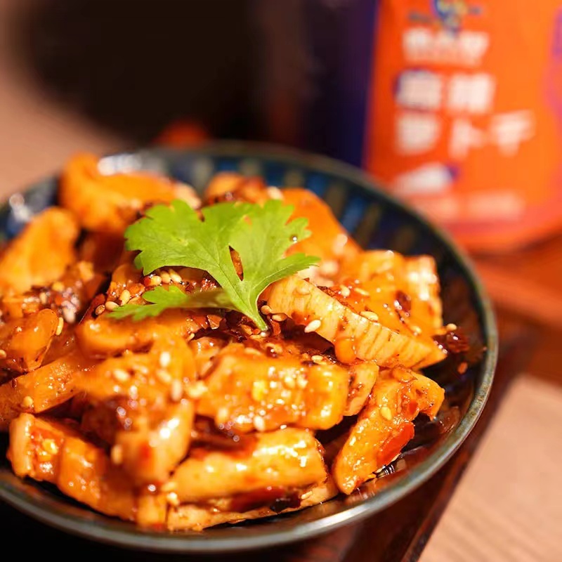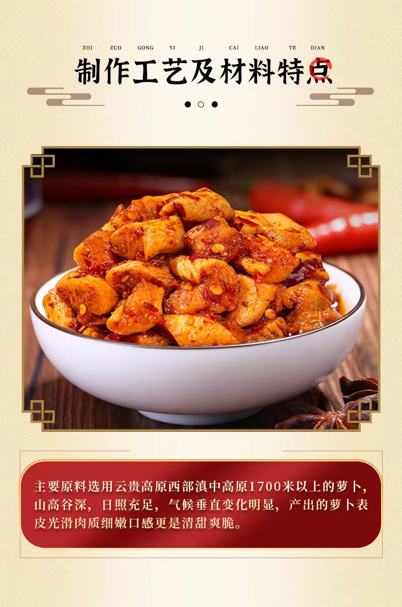麻六记的辣味萝卜干,选用的是云贵高原西部滇中高原1700米以上的萝卜,由于山高谷深,日照充足,气候垂直变化明显,因此这里生长的萝卜表皮光滑,肉质细嫩,口感更是清甜爽脆。新鲜的萝卜使用传统的晾晒风干方式,去掉多余水分的同时又保证了萝卜的原味,再配上独家调料,开胃的辣、适度的咸,让辣味萝卜干好吃适口又好吃!