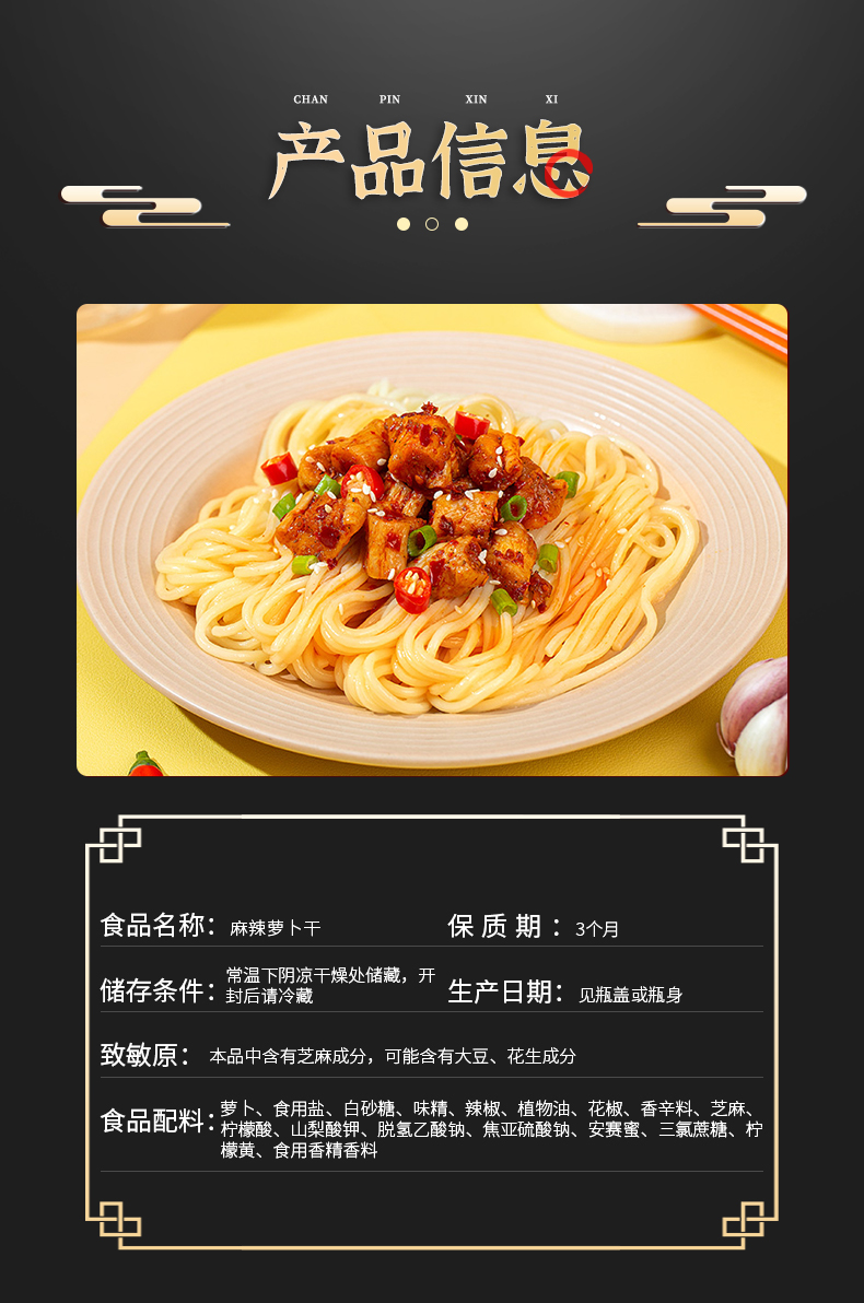 萝卜干开盖有明显的芝麻香和辣椒香,长得也是可爱,像蘑菇的切面!入口咸香,微微偏辣,吃起来非常爽脆,咔叽咔叽,好开胃啊!配粥配面都好吃,是真正的下饭菜,蛮像小时候奶奶做的那种!辣味萝卜干是两罐一组,每瓶300g,保质期3个月,但开盖后需要尽快食用完毕哦!