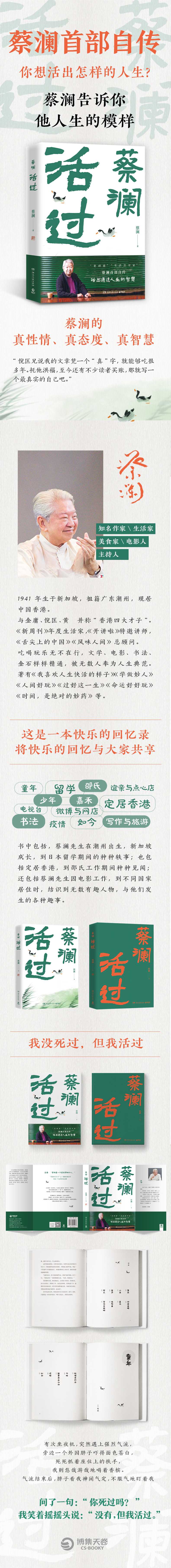 ★蔡澜自传,看蔡澜活成人间清醒的人生智慧 书中包括,蔡澜先生在潮州出生,新加坡成长,到日本留学期间的种种轶事;也包括定居香港,到邵氏工作期间种种见闻;还包括蔡澜先生因电影工作,到不同国家居住时,结识到无数有趣人物,与他们发生的各种趣事。 用蔡澜先生自己的话说,;吃喝玩乐都尝遍了最好的,是无憾了。 ★ 一本书写尽蔡澜先生的;真,品悟蔡澜的真性情、真态度、真智慧。 蔡澜说,;倪匡兄说我的文章凭一个;真字,就能够吃很多年。托他洪福,至今还有不少读者买账,那就写一个最真实的自己吧。 ★你想活出怎样的人生?蔡澜告诉你他人生的模样。 书中的文章,包罗万象,有谈人生、谈写作、谈金钱、谈生意、谈女人、谈身世、谈自己的人生年代,等等。文章短小精悍,文笔风趣幽默,每篇文章都体现了蔡澜豁达的人生观和他智慧的处世哲学。 ★ 装帧精美,品质阅读。