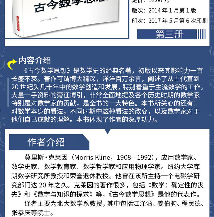 《古今数学思想》是数学史的经典名著,初版以来其影响力一直长盛不衰。著作可谓博大精深,洋洋百万余言,阐述了从古代直到20世纪头几十年中的数学创造和发展,特别着重于主流数学的工作。大量手资料的旁征博引,非常全面地提及各个历史时期的数学家特别是数学家的贡献,是全书的一大特色。本书所关心的还有:对数学本身的看法,不同时期中这种看法的改变,以及数学家对于他们自己成就的理解。本书体现了作者的深厚功力。