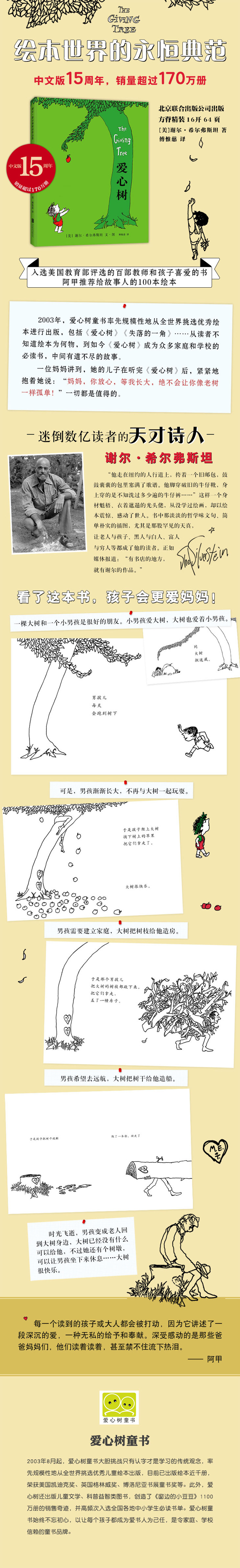 2003年,《爱心树》中文版出版,15年来成为众多家庭和学校的必读书。这个男孩与大树之间的故事,让无数读者潸然泪下。一位妈妈讲到,她的儿子在听完《爱心树》后,紧紧地抱着她说:“妈妈,你放心,等我长大,绝不会让你像老树一样孤单!”