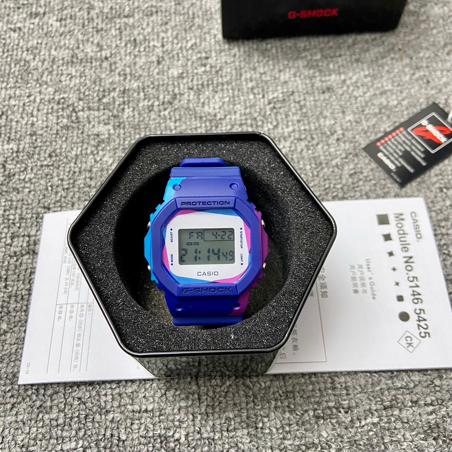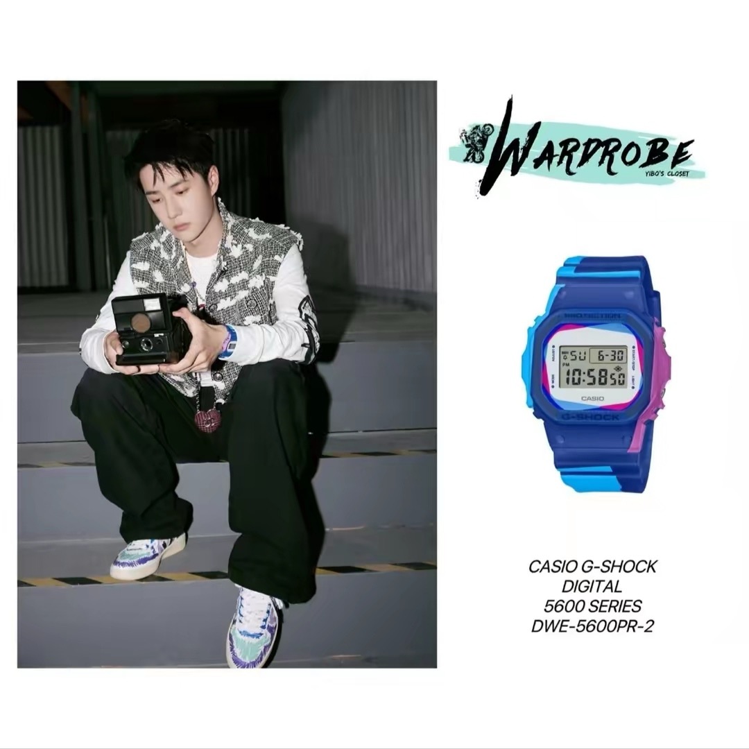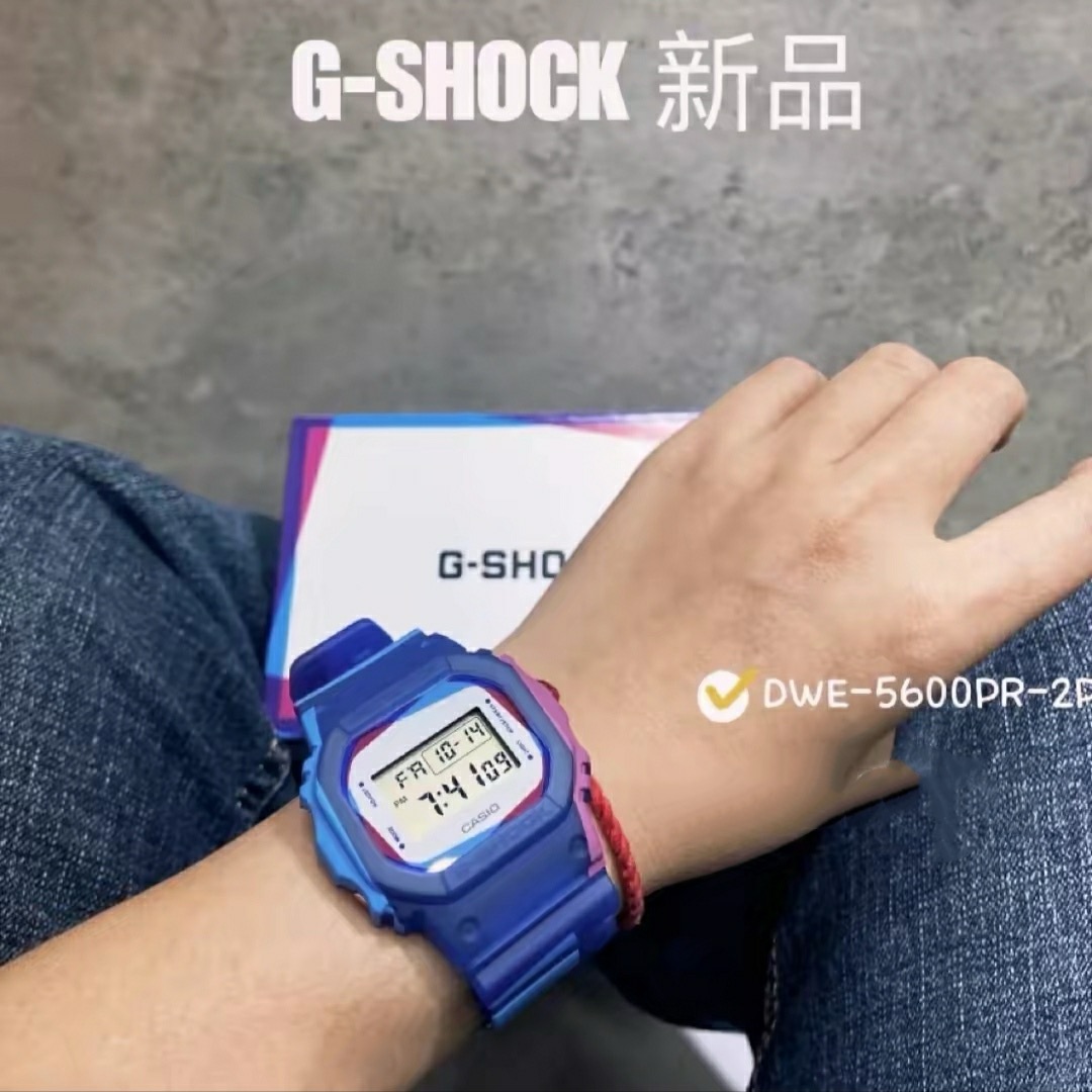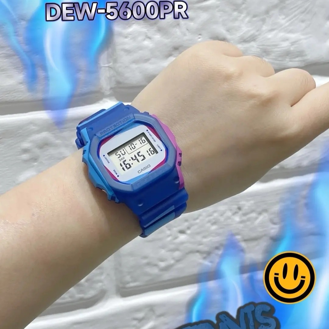 DWE-5600PR-2 百变玩法。缤纷蓝焕新诠释方块造型,红蓝交错,流动于表带;曙光白梦幻清冷,交织瞬间,演绎色彩自由。