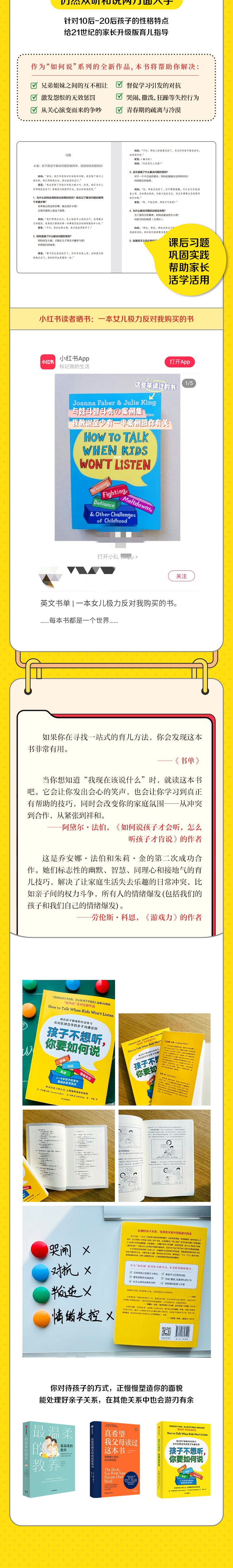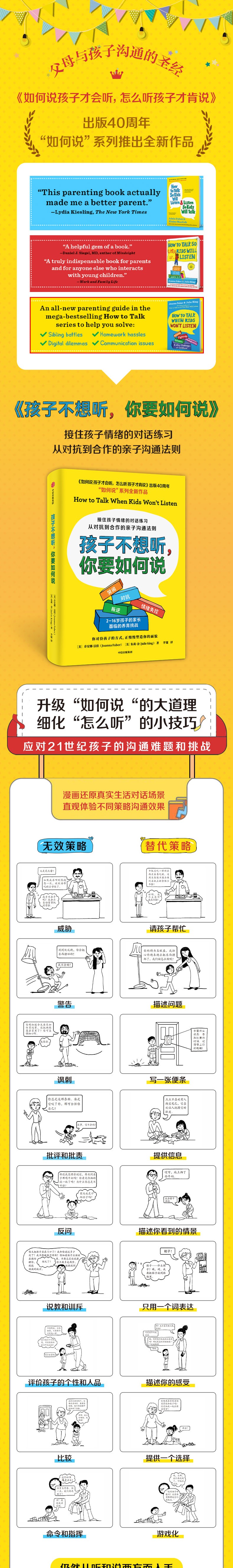 ★父母与孩子沟通的圣经《如何说孩子才会听,怎么听孩子才肯说》出版40周年,“如何说”系列推出全新作品,写给2-16岁孩子的父母,升级“如何说”的大道理,细化“怎么听”的小技巧,解决10后、20后孩子的哭闹、争吵、对抗、冲突、叛逆等一系列棘手问题和挑战,让亲子关系成为孩子一生的力量之源。 ★接住孩子情绪的对话练习。孩子有好的感受,才会有好的行为。本书在前作沟通理论的基础上做了有针对性的调整,根据21世纪孩子的特点,给出更切实可行的建议。作为传承之作,本书更像是一本“进阶手册”,以解决前作无法解决的当下这个时代孩子的问题,让手足无措的家长们可以在本书的帮助下,以平和的心态实现与孩子的有效沟通。 ★两位作者组织了“如何说”父母小组,还开发了“如何说”APP,专门解决家长与孩子的沟通问题。书中增加了近年来父母小组中的大量沟通案例,还有充满苦恼的家长来信,针对当下的家长会遇到的问题,为家长量身提供详细的指导,有很强的实用性。社会环境和教育理念在不断变化,我们迫切需要更新版本的说话和沟通技巧,来适应新时代背景下的亲子关系。 ★不堆砌理论,直接告诉你方法,简单易行,改变可在瞬间发生,见证有效沟通的神奇效果。与《如何说》这本书的体例一样,本书有大量的漫画,清晰呈现沟通场景,对比不同对话方式产生的不同效果,让读者有更直观的感受。拆解对话步骤,分析问题所在,能理解家长的辛苦与不易,行文富含同理心 。每章之后设置习题版块,读者可以在读完以后,迅速巩固所学技巧,并能马上付诸实践。