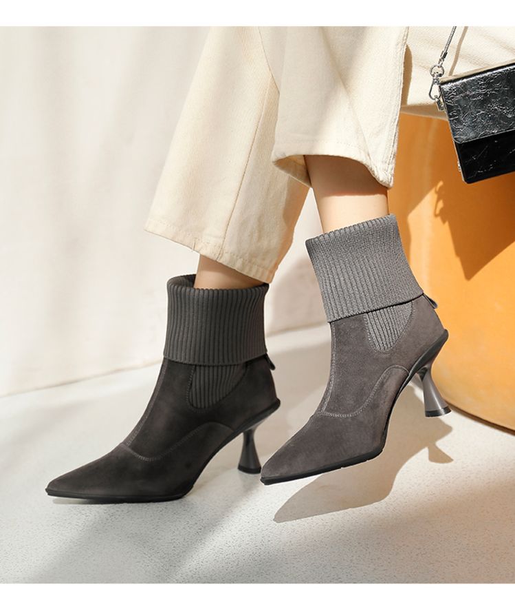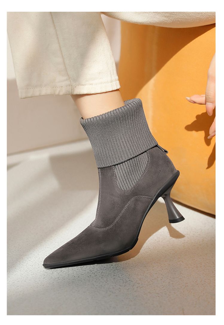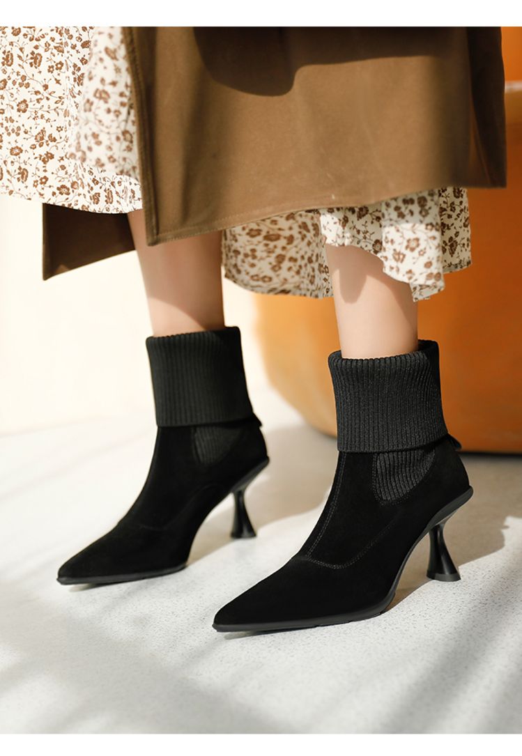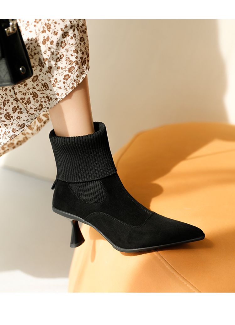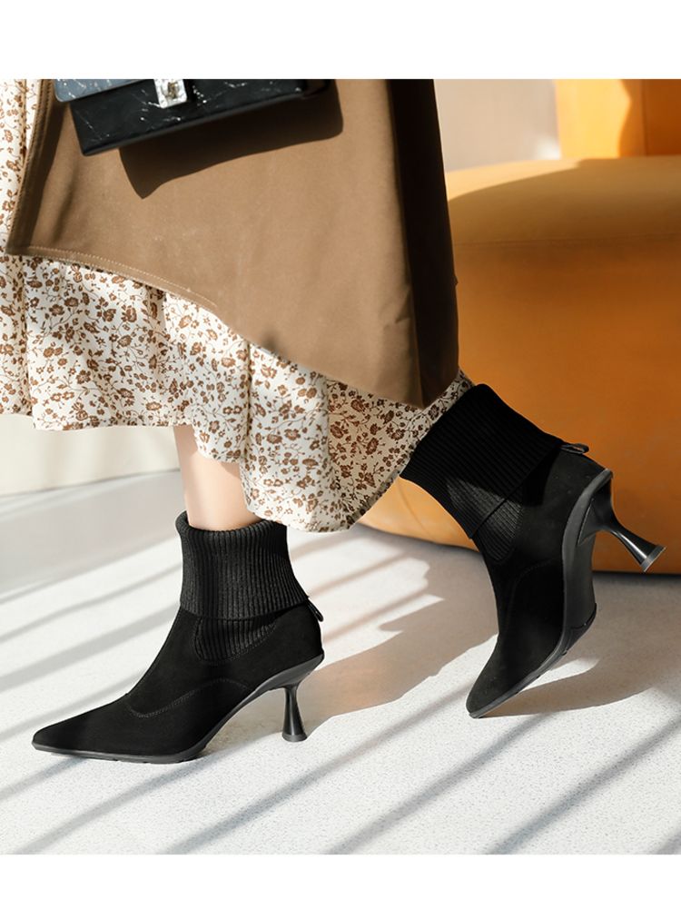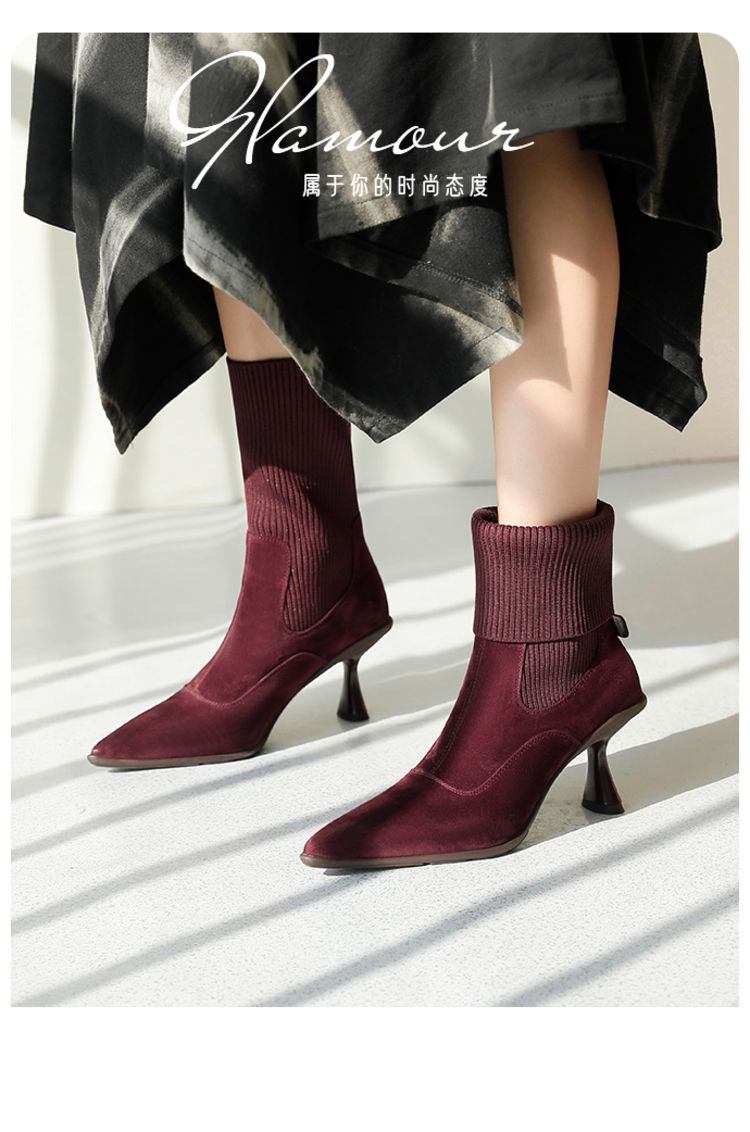【预售5天】瘦瘦靴女秋冬新款尖头高跟鞋细跟针织弹力气质女神范中筒短靴CQSJ&HL-6079