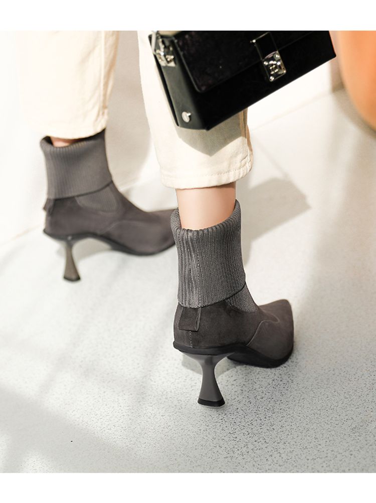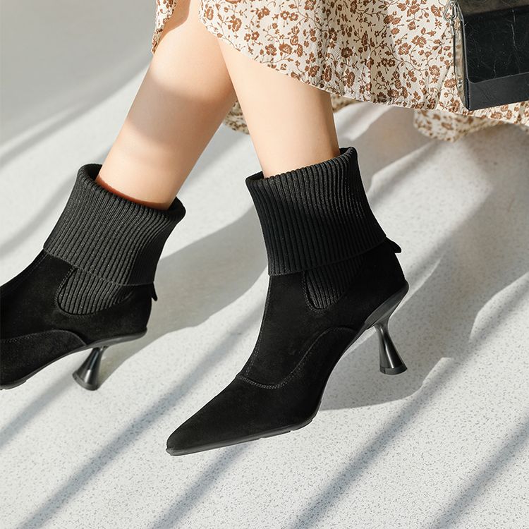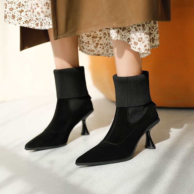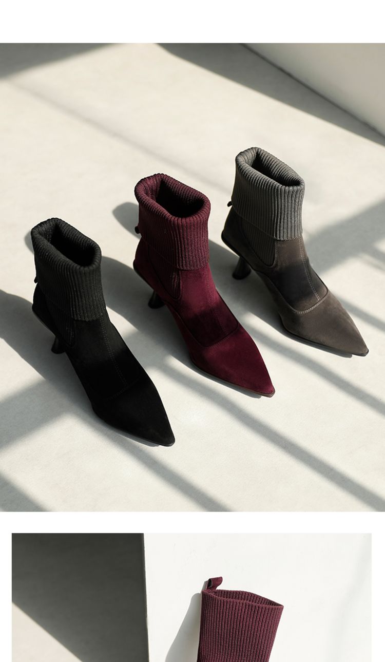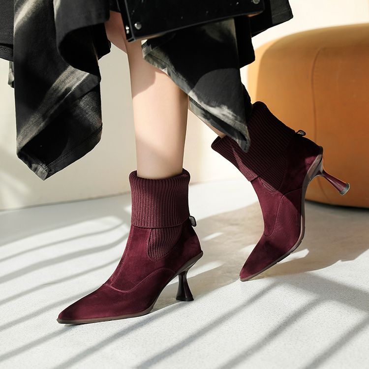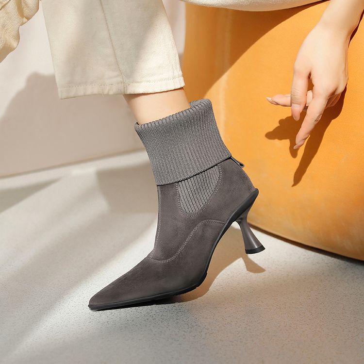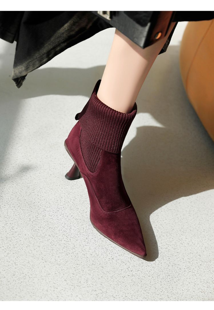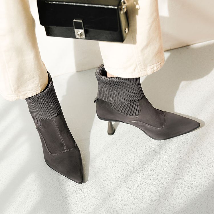 【预售5天】瘦瘦靴女秋冬新款尖头高跟鞋细跟针织弹力气质女神范中筒短靴CQSJ&HL-6079
