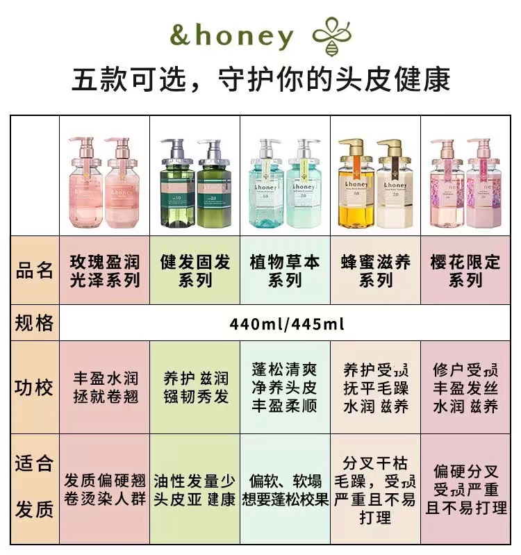 它有5个不同的系列,樱花限定系列、蜂蜜系列、无硅油草本系列、玫瑰盈润亮泽系列、健发固发系列。不同的发质不同的选择,5款洗发水,24小时持久留香;多种花香萃取融合,自带香水气息;泡沫也很细腻亲肤,洗完后顺滑亮泽。