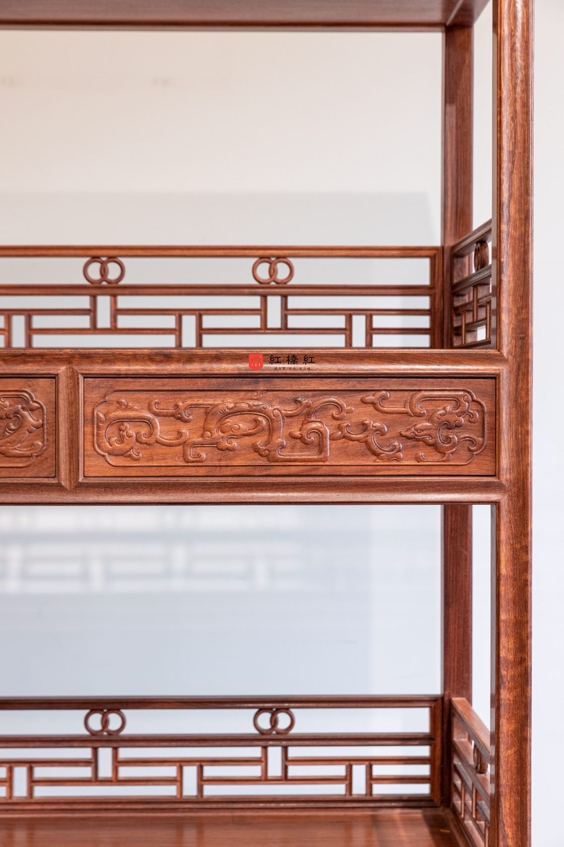 架格整体用方材打洼踩委角线,颇为吃工,设隔板三层,最上层之下安抽屉两具,抽屉面浮雕螭龙纹,用手托抽屉底实现开关,并未施铜拉手,可使图案保持完整的观赏度,隔板的三面设围子,围子用攒接横竖材组成,是品字栏杆的一种变体,最上面两道横材之间加双套环卡子花,下枨足尖用宽牙条,略施浮雕花纹。