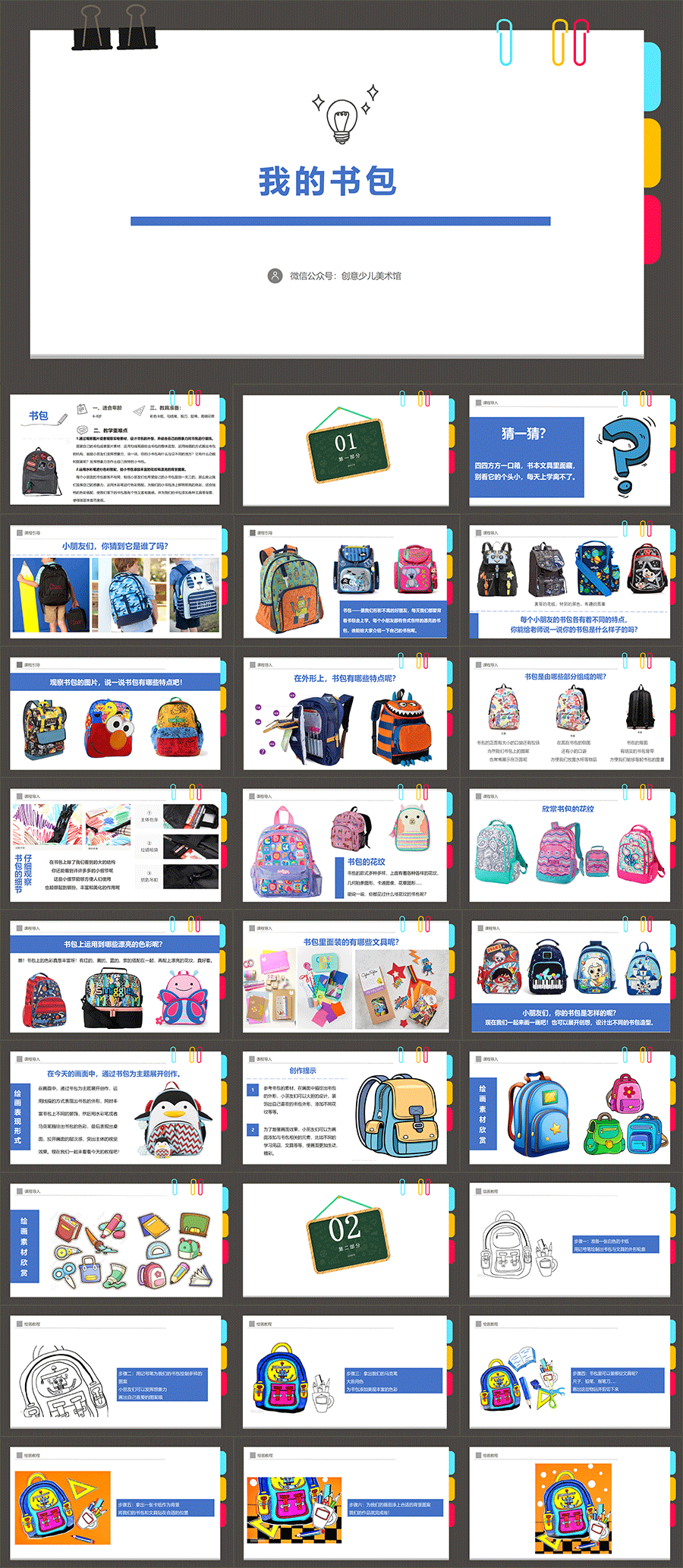 每个小朋友的书包都各不相同,相信小朋友们也希望自己的小书包是独一无二的,那么就让我们发挥自己的想象力,运用水彩笔进行色彩搭配,为我们的小书包涂上鲜艳明亮的色彩,结合独特的色彩搭配,使我们笔下的书包既有个性又富有美感。并为我们的书包添加各种文具等背景,使得画面丰富而美观。