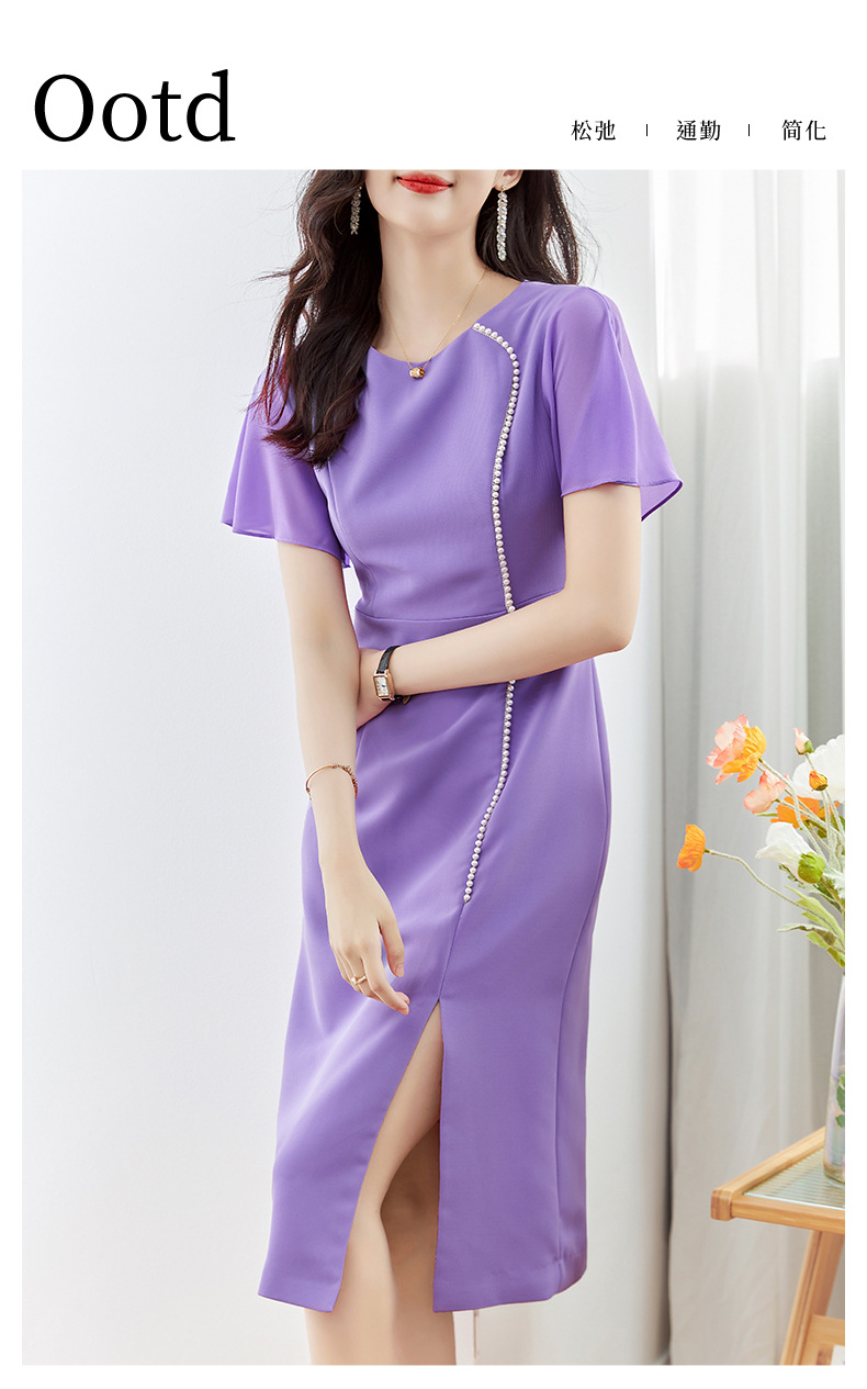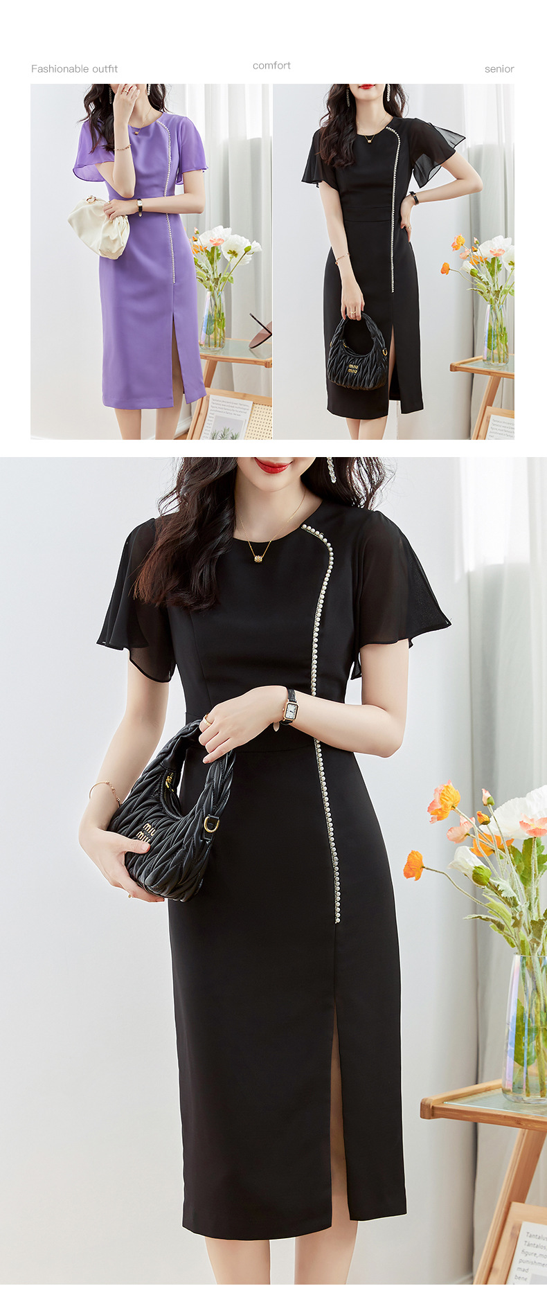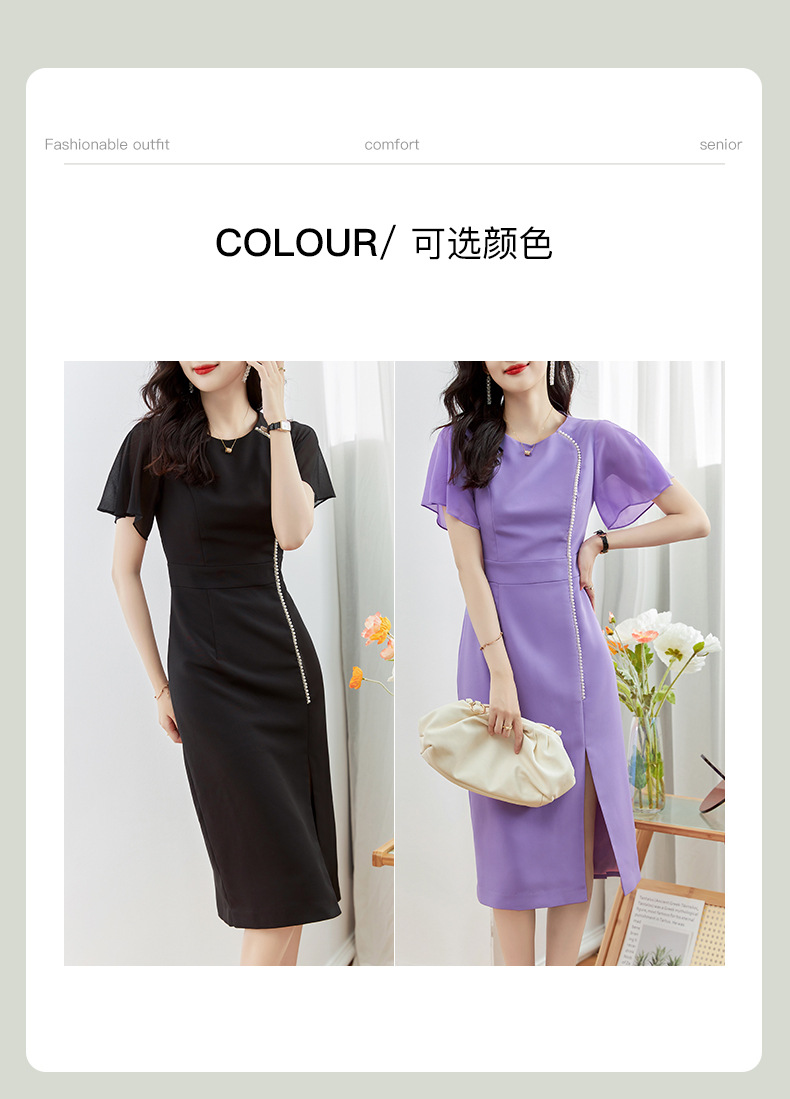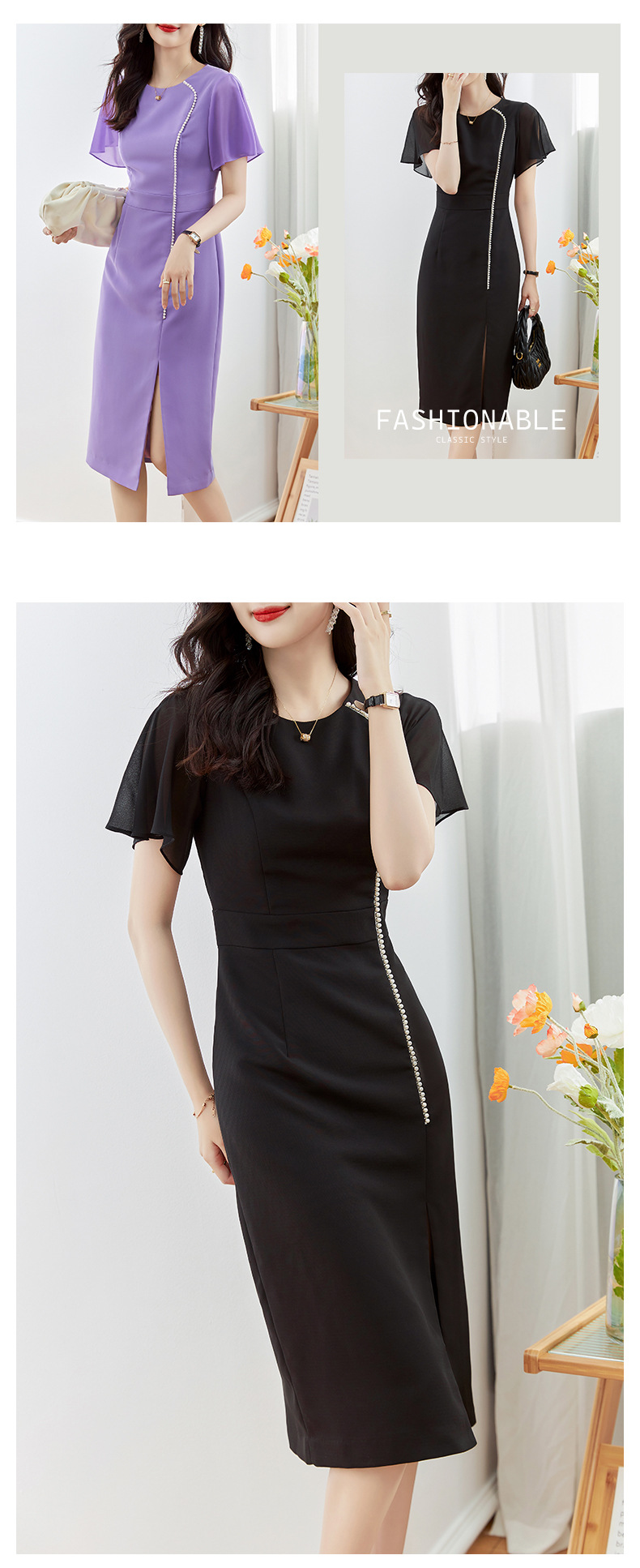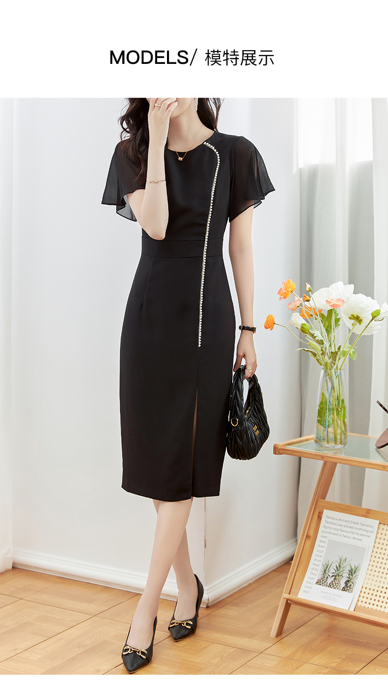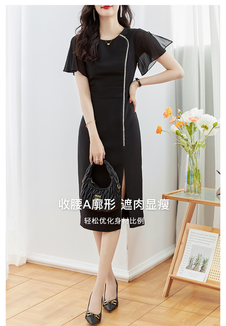 圆领重工钉珠修身收腰,显瘦开叉包臀连衣裙WLZD-2313301