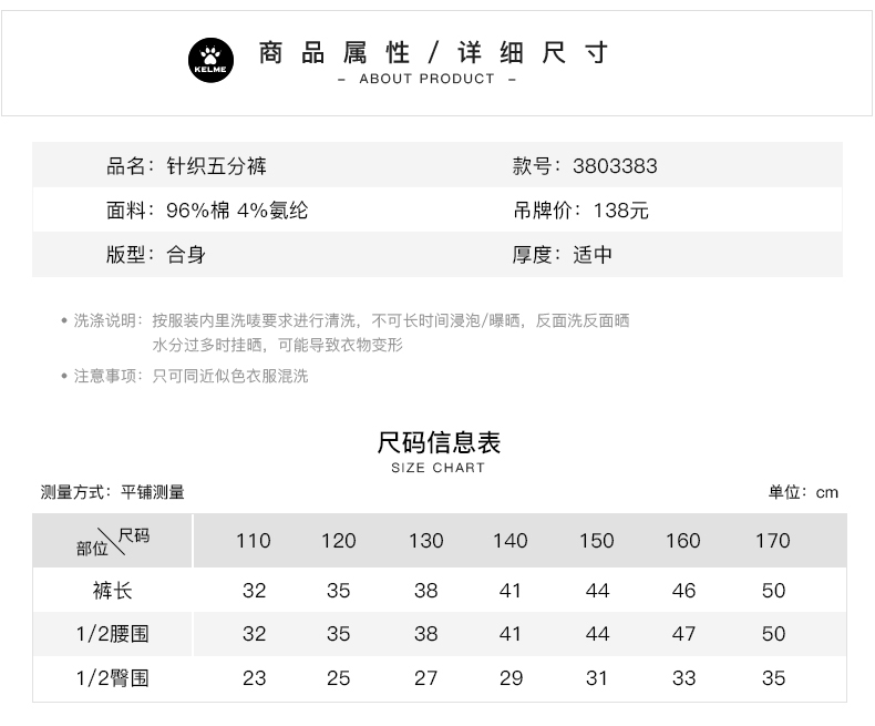 KELME卡尔美夏季男儿童运动短裤足球训练裤篮球五分裤跑步健身裤