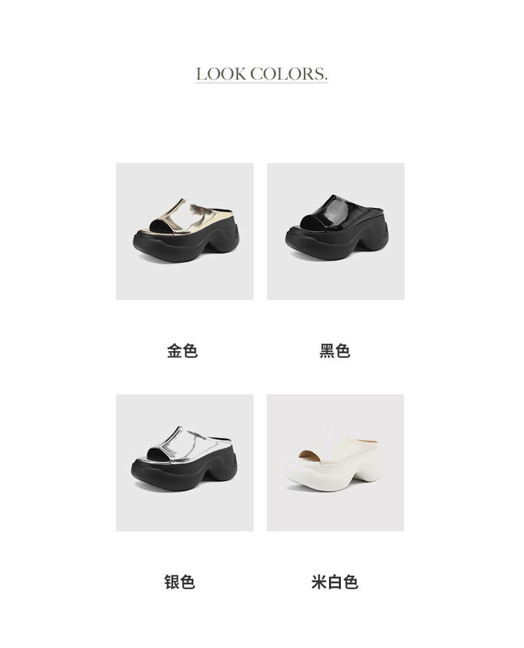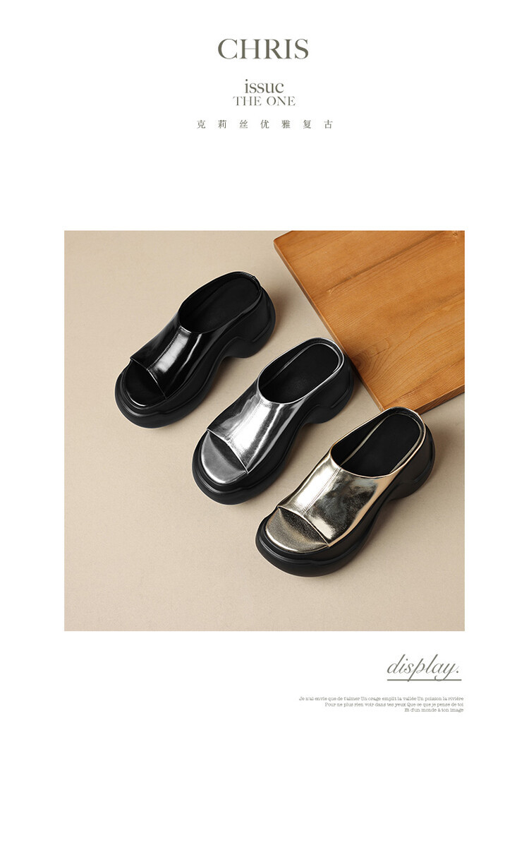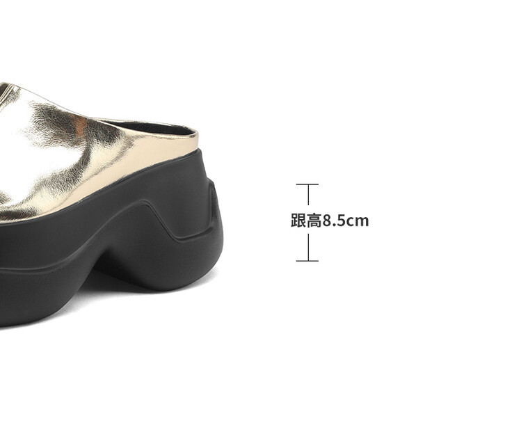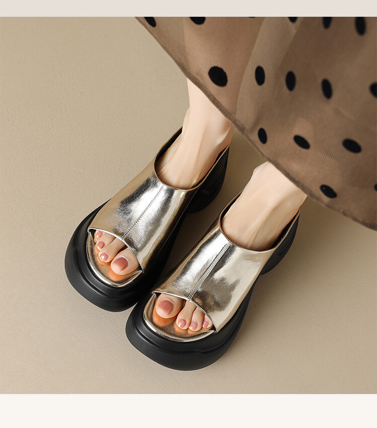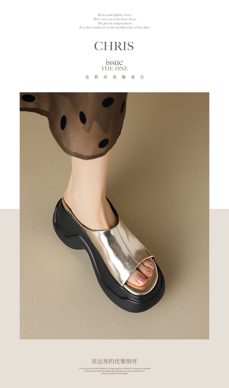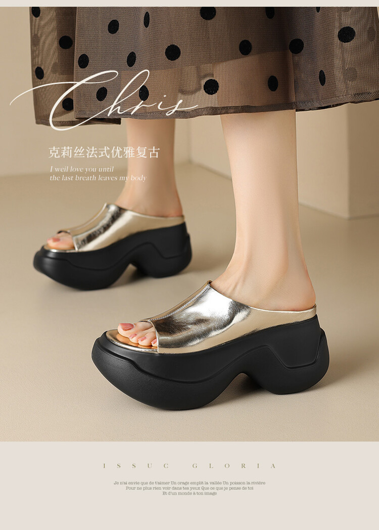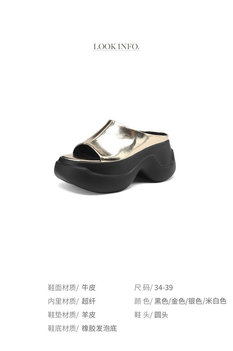 8cm露趾凉拖女牛皮粗跟厚底夏季新款时尚金色小个子白色一字凉拖