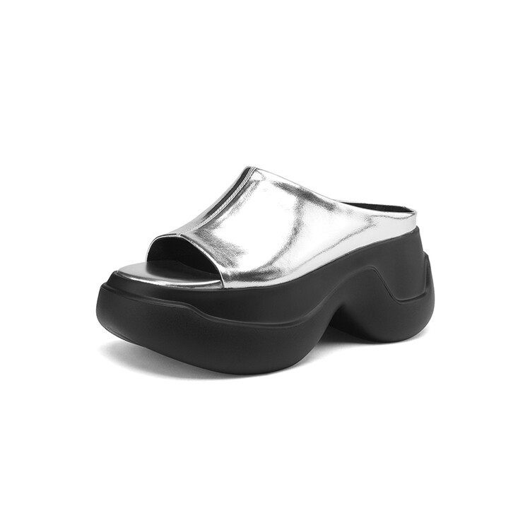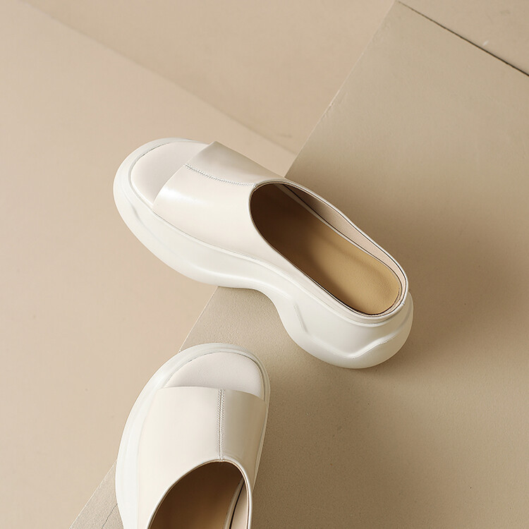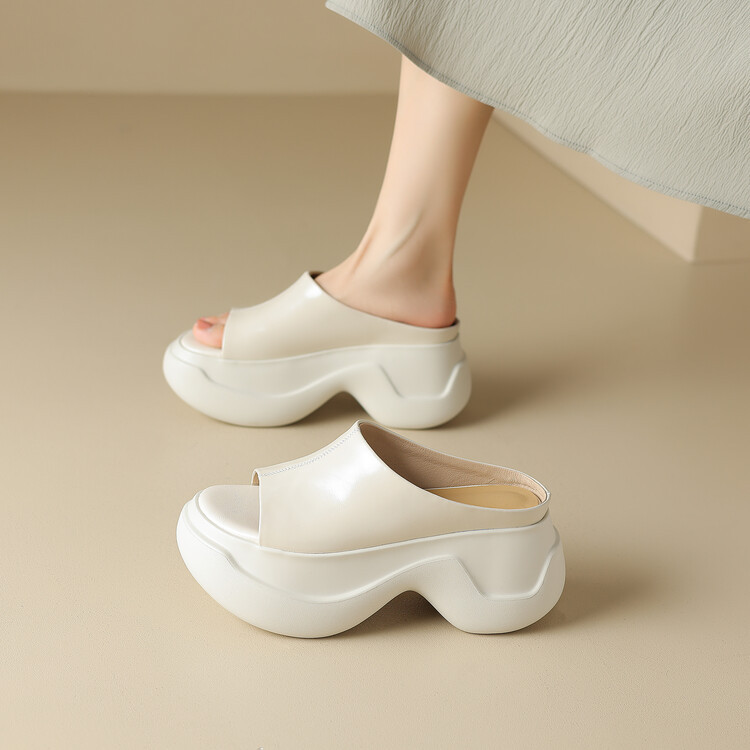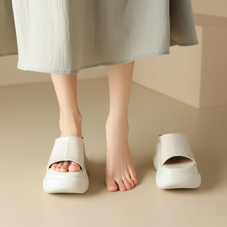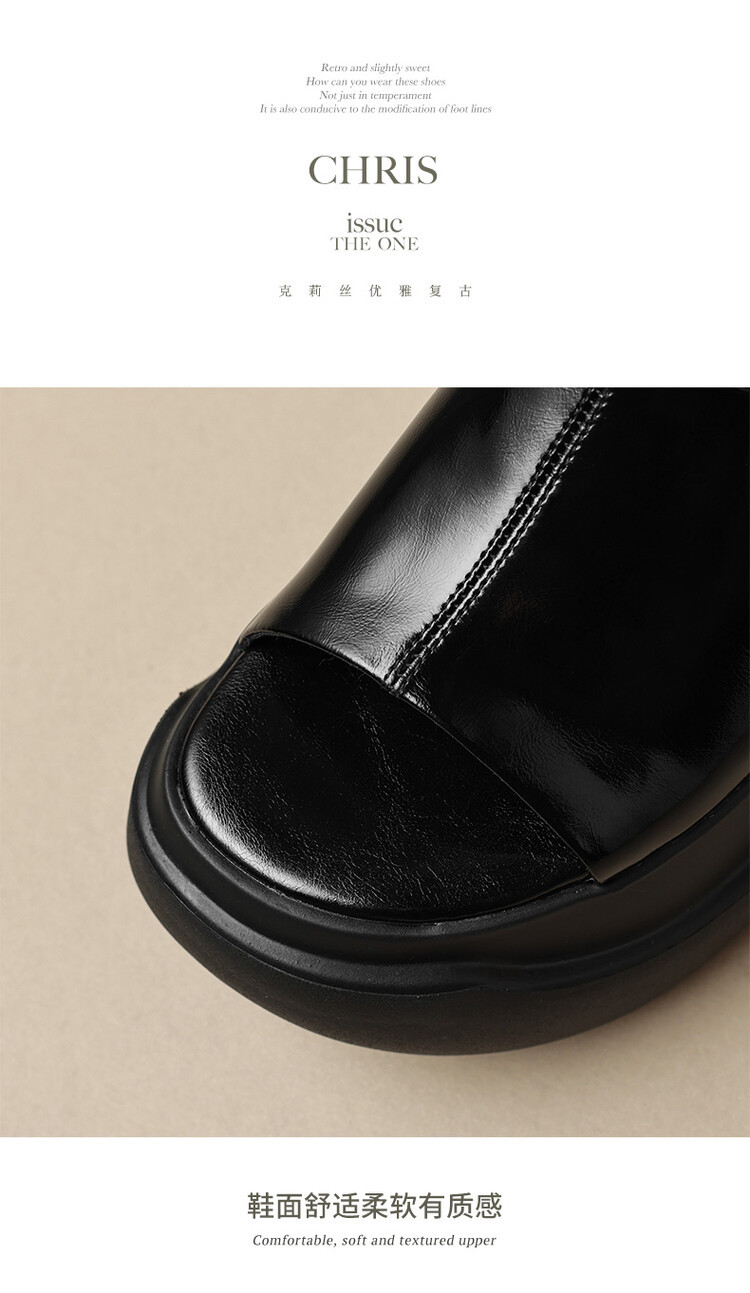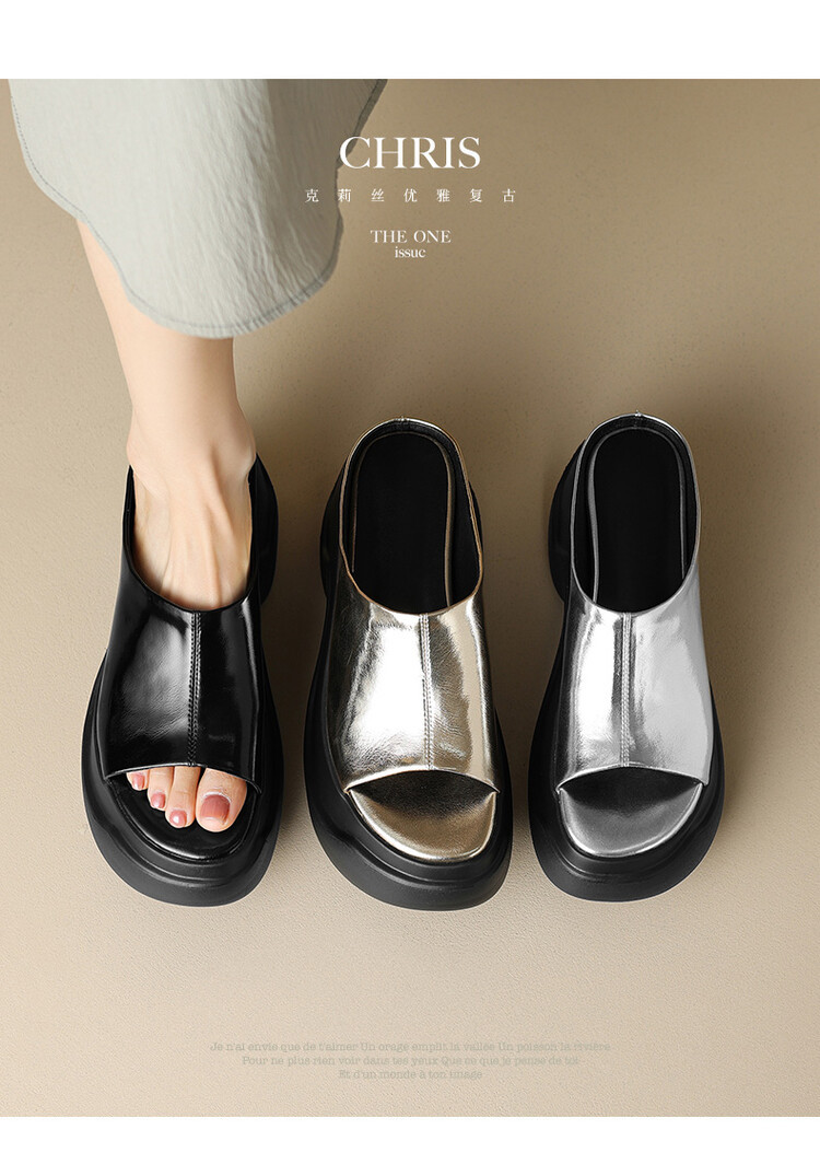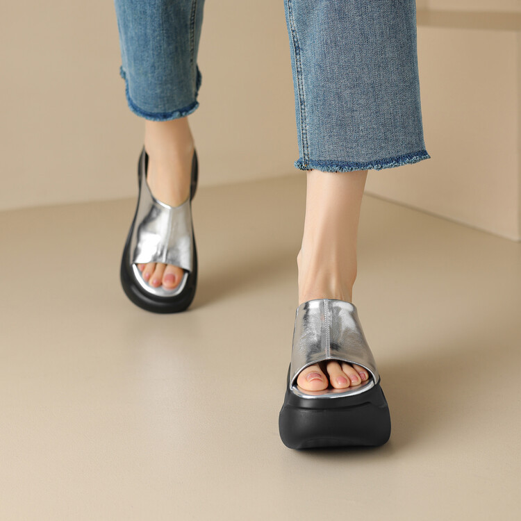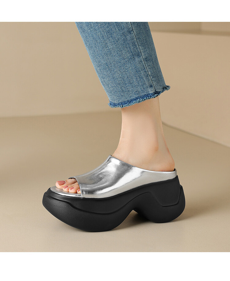 8cm露趾凉拖女牛皮粗跟厚底夏季新款时尚金色小个子白色一字凉拖
