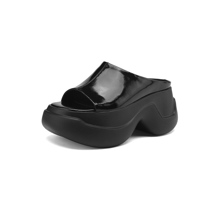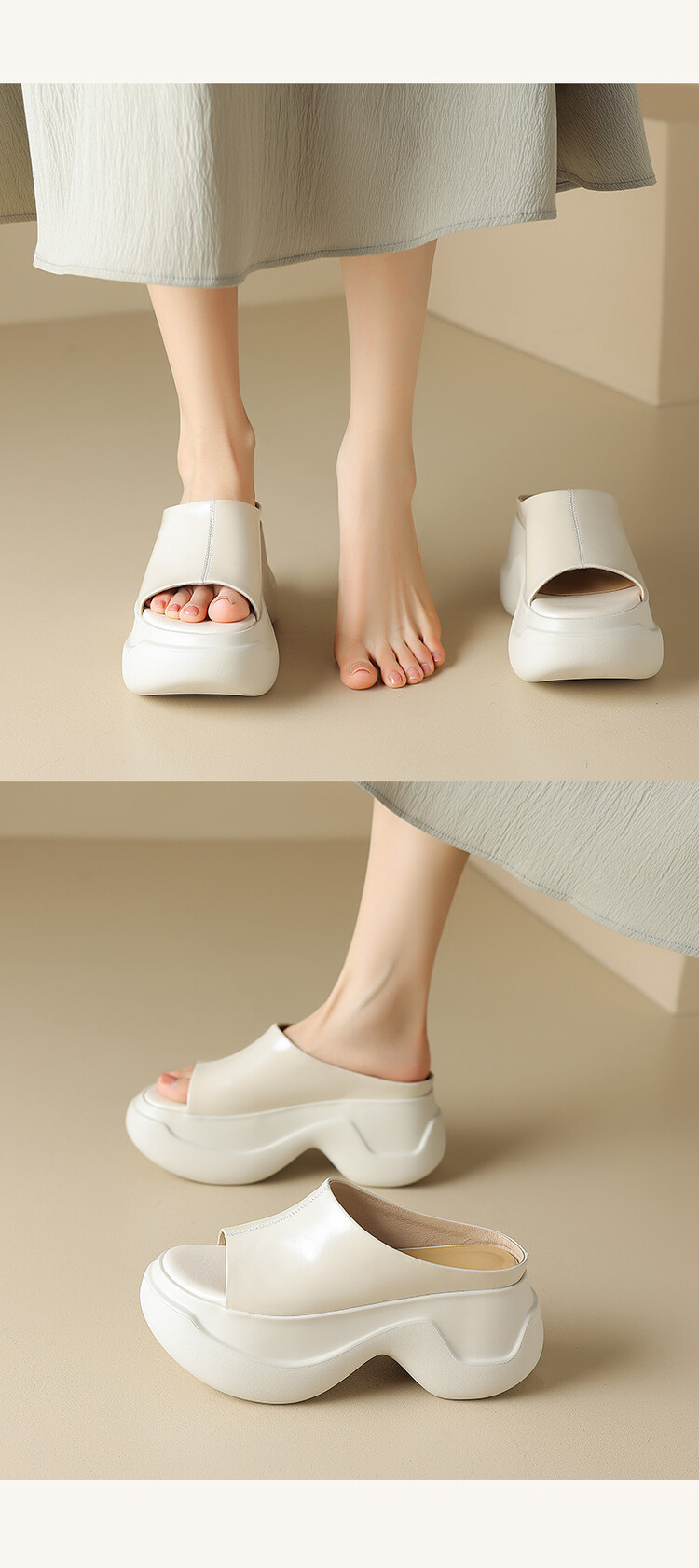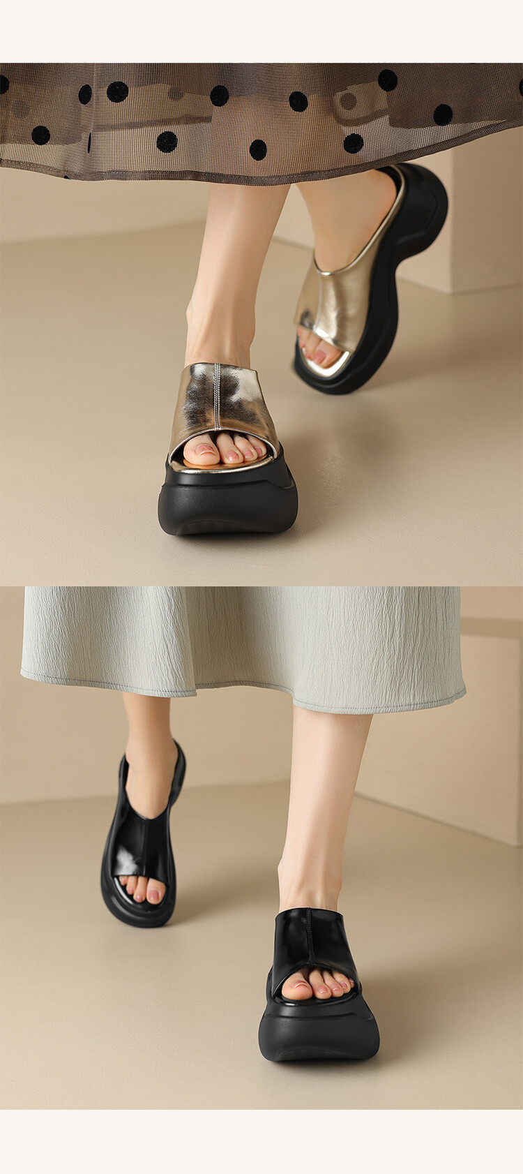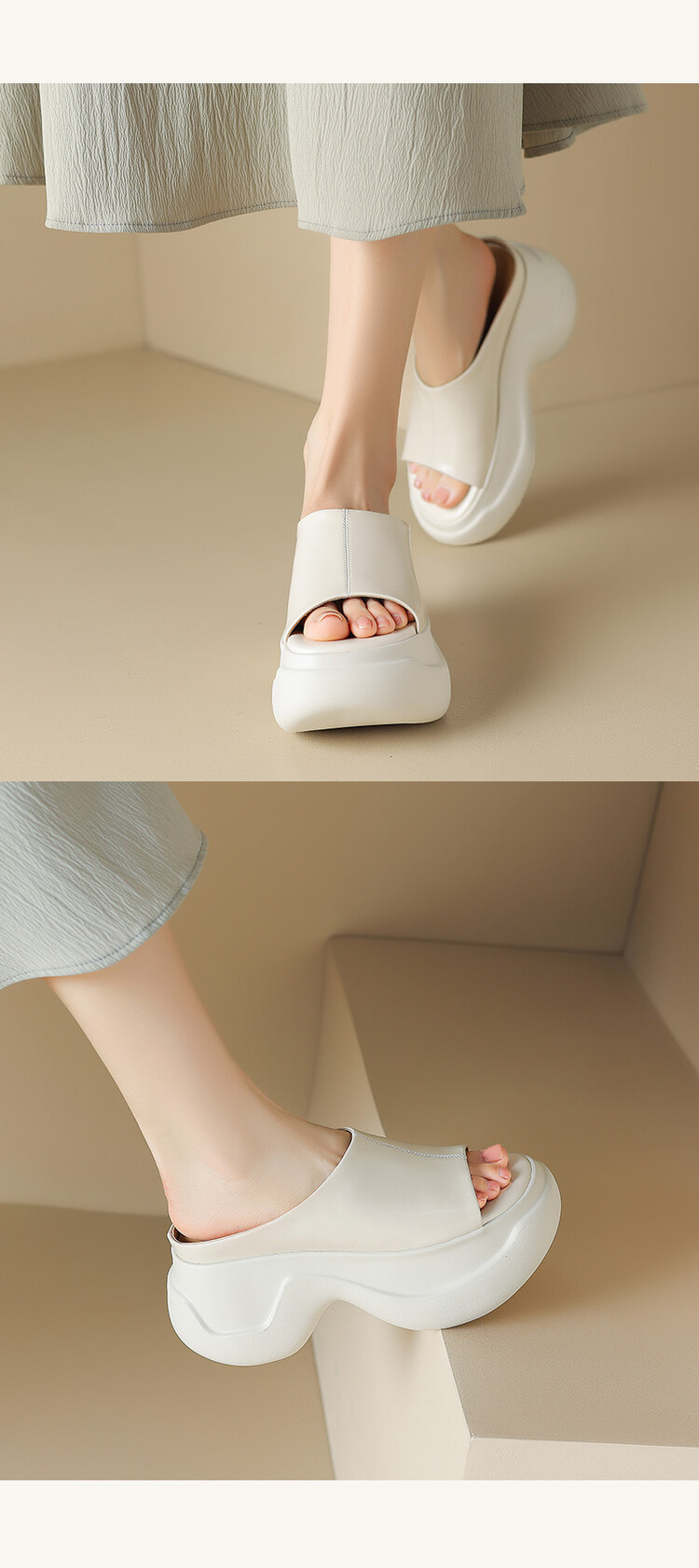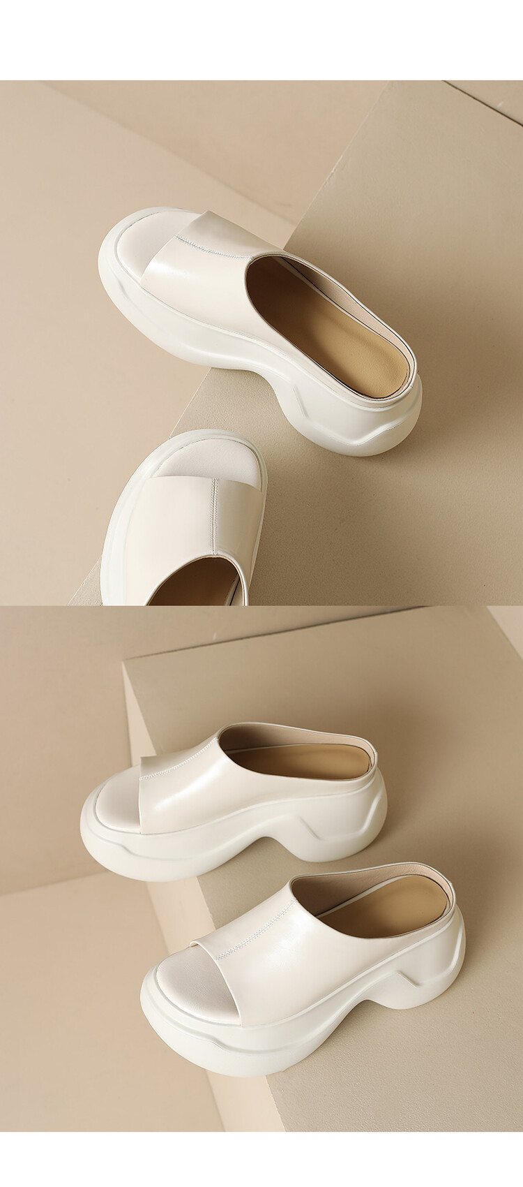 8cm露趾凉拖女牛皮粗跟厚底夏季新款时尚金色小个子白色一字凉拖