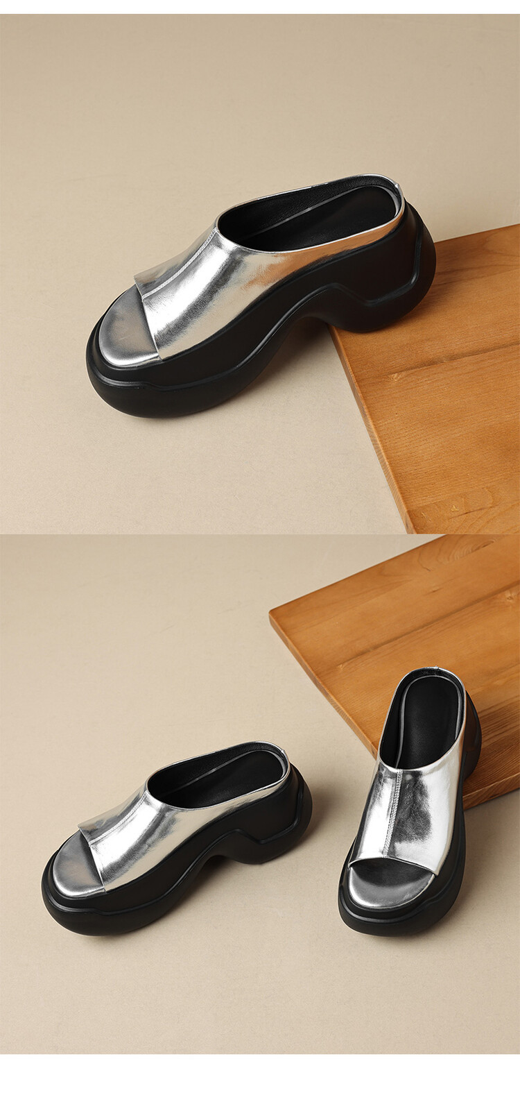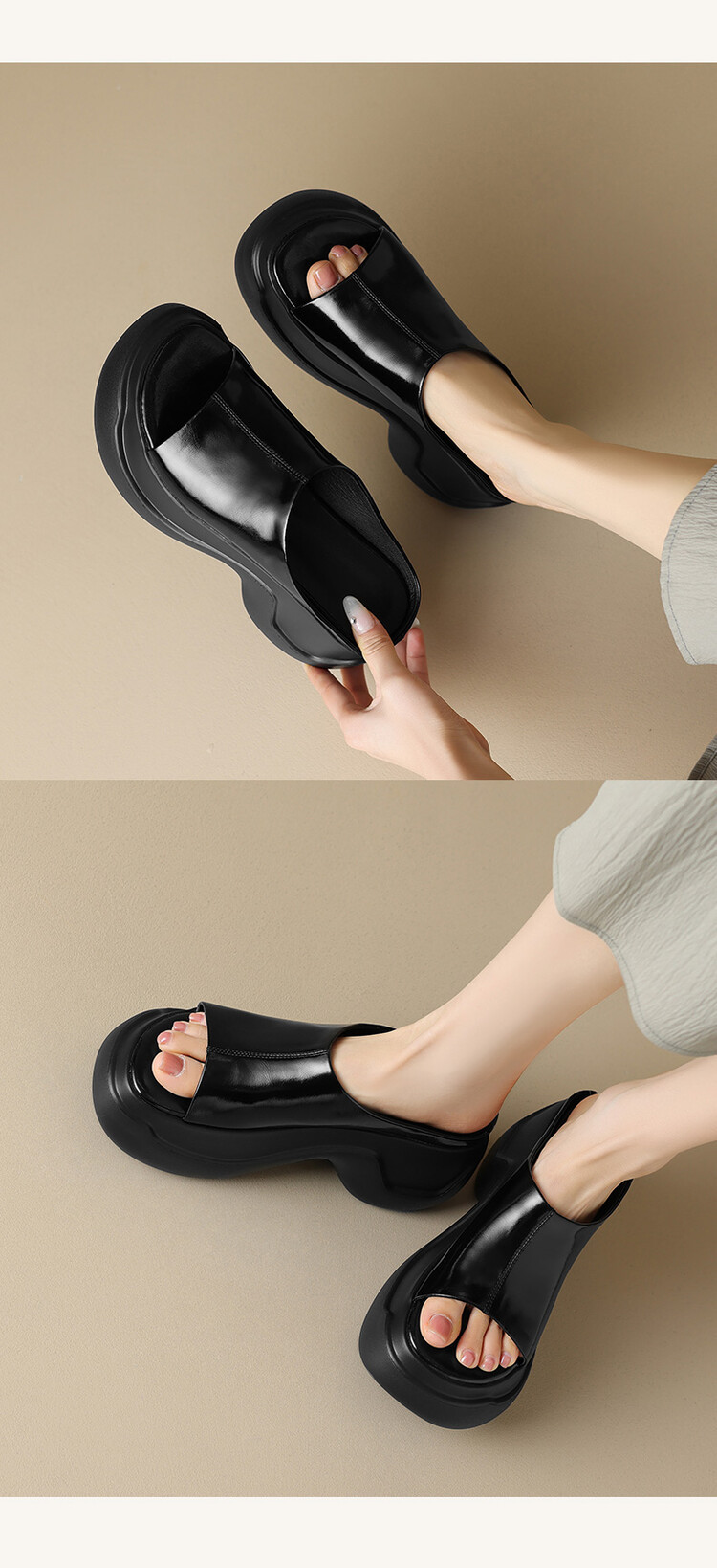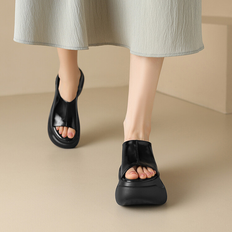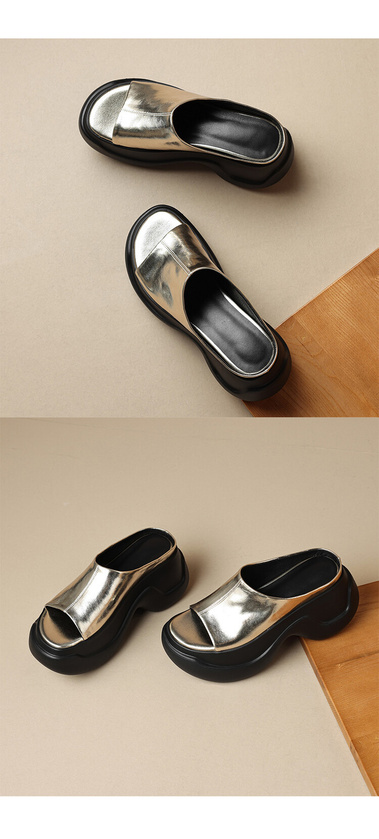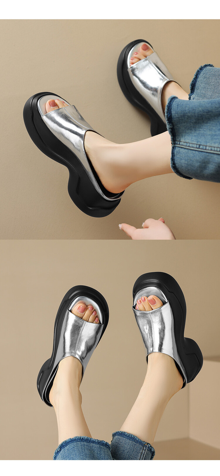 8cm露趾凉拖女牛皮粗跟厚底夏季新款时尚金色小个子白色一字凉拖