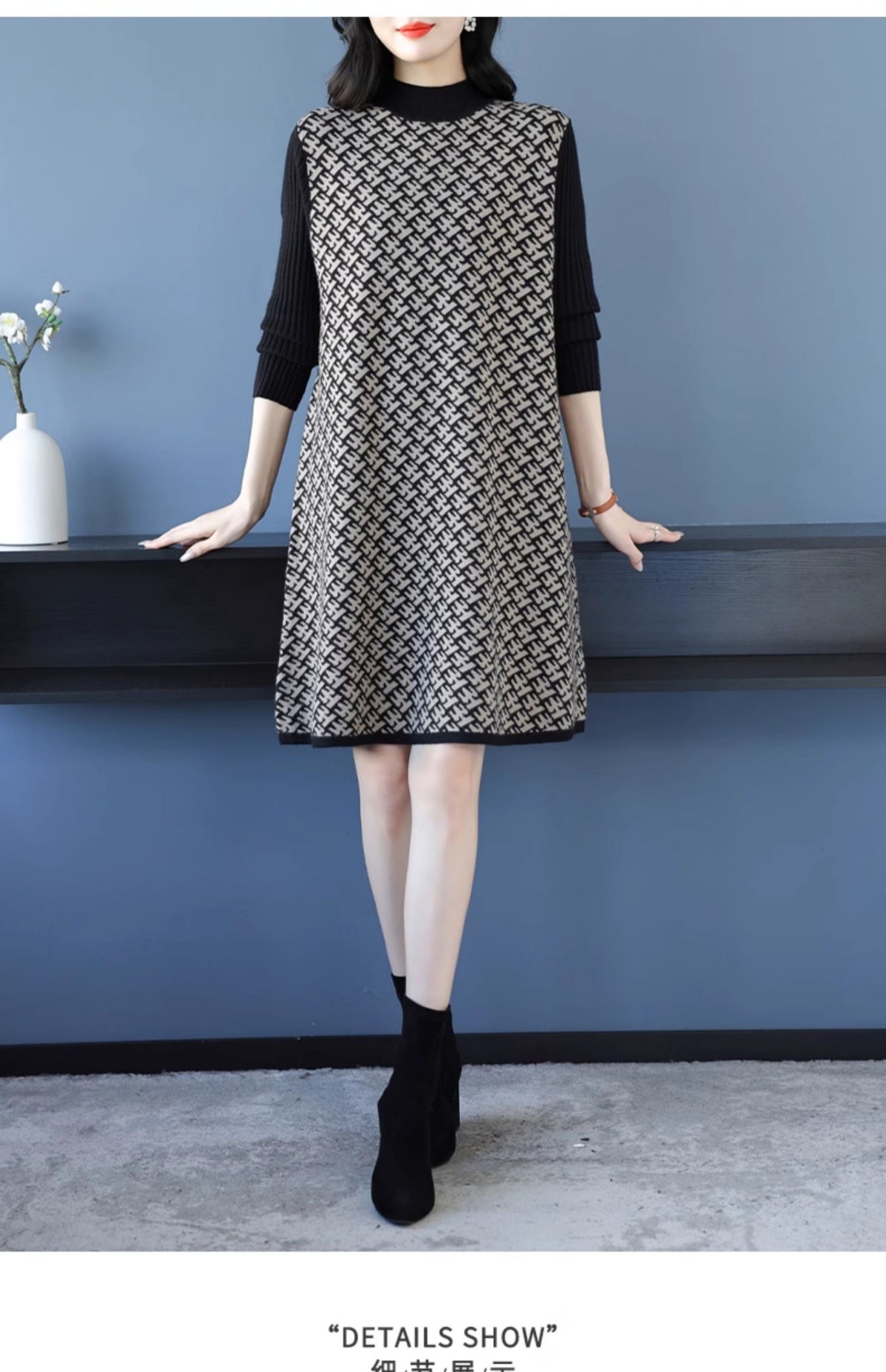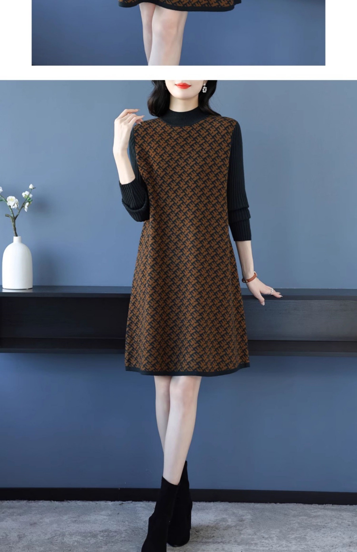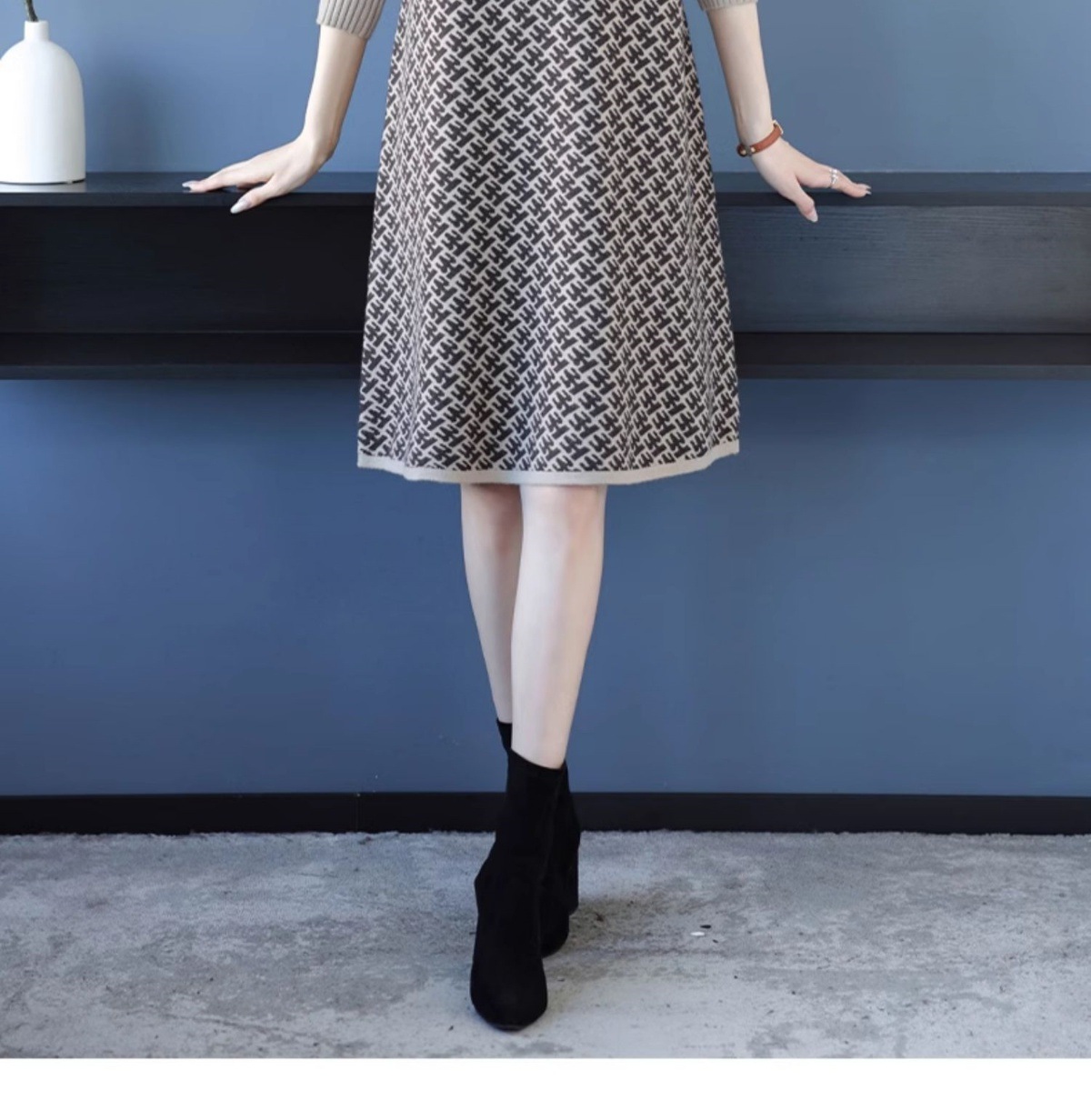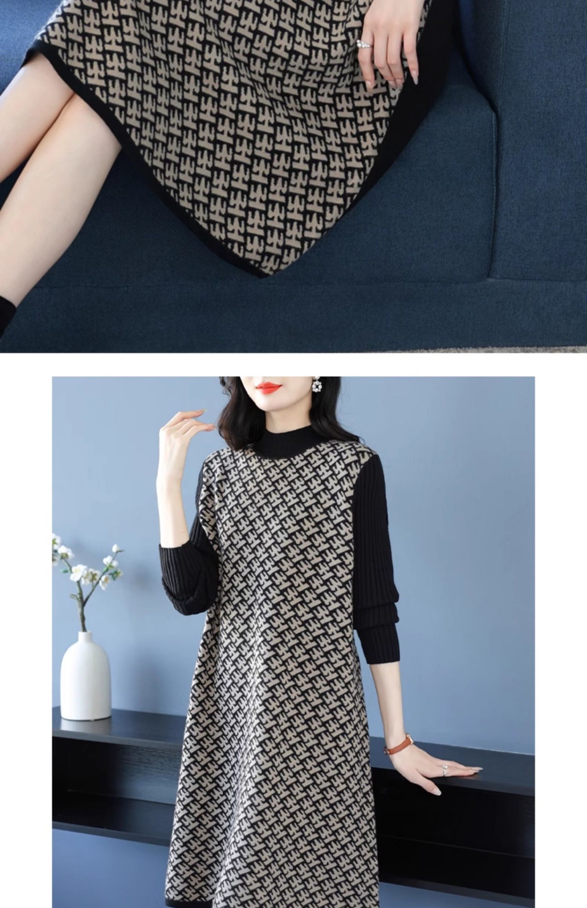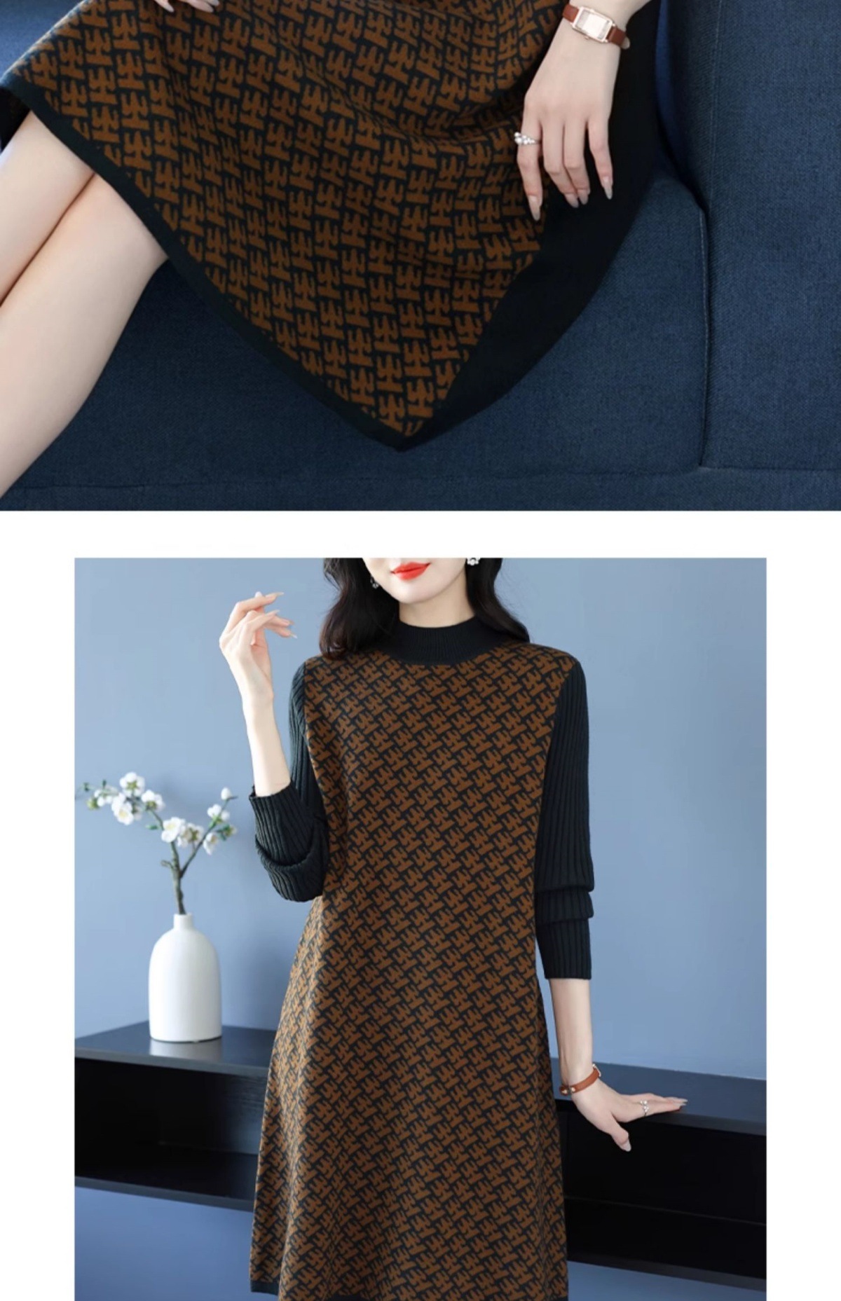 CC-16-9211秋冬提花中长款连衣裙女大码过膝配大衣针织打底毛衣裙