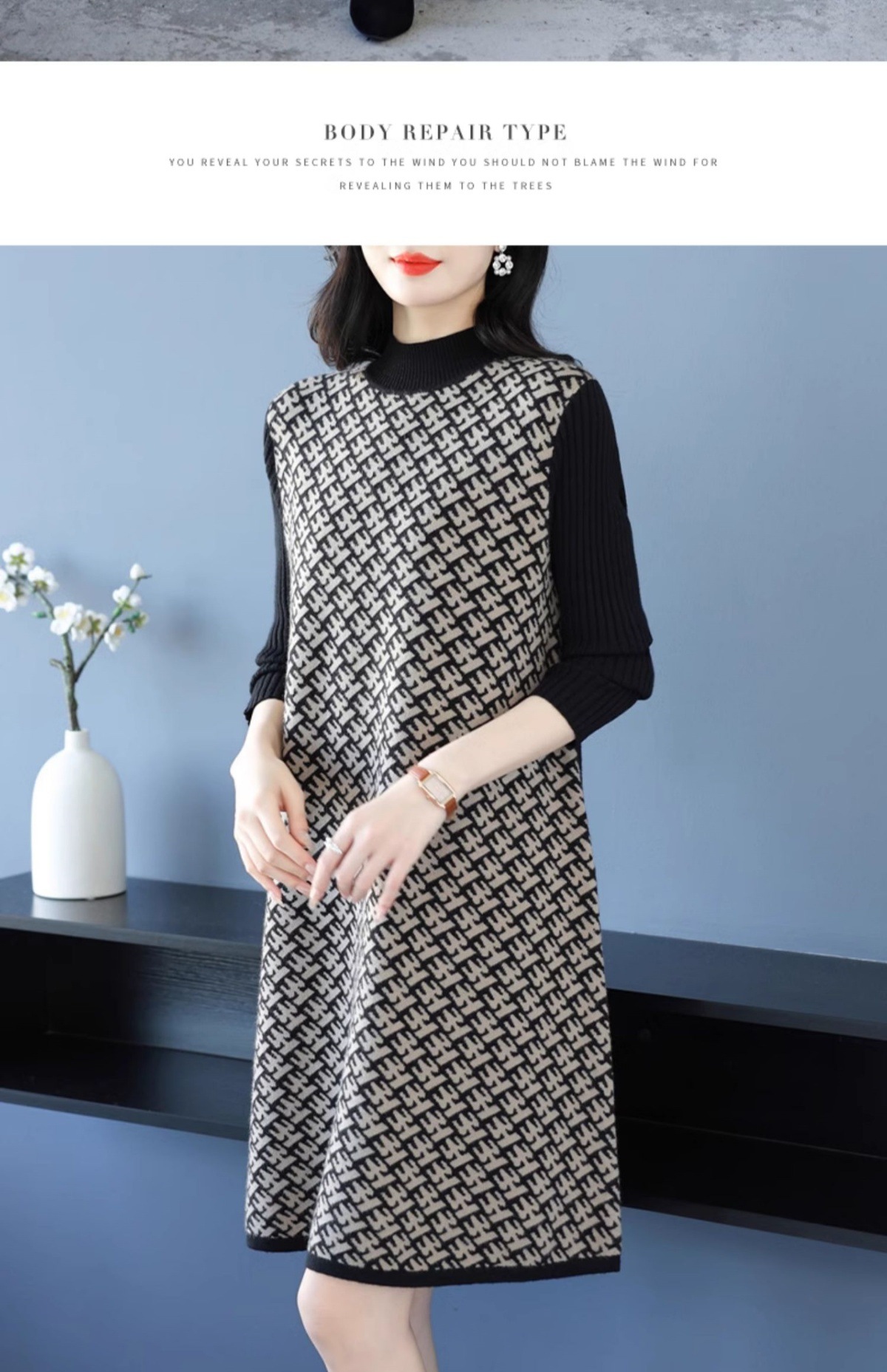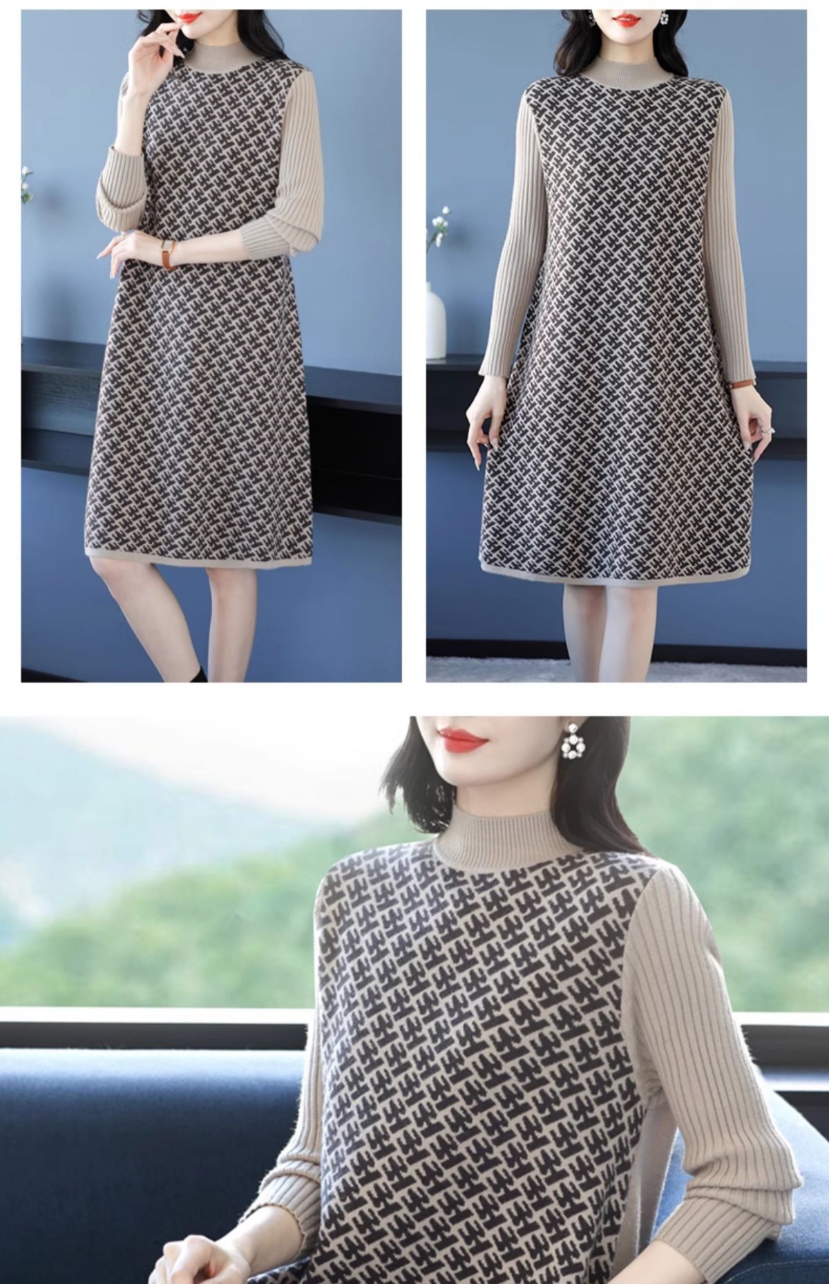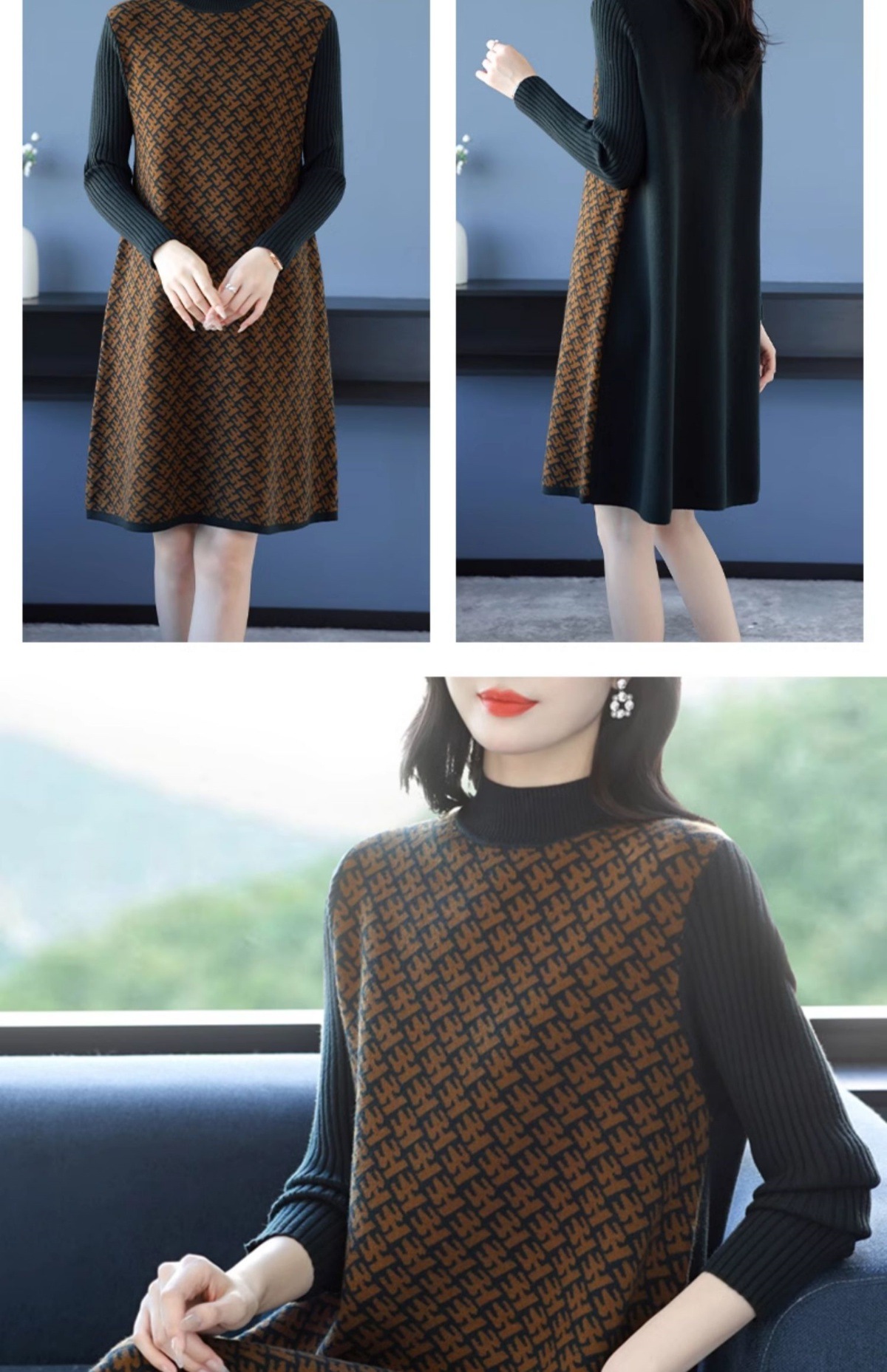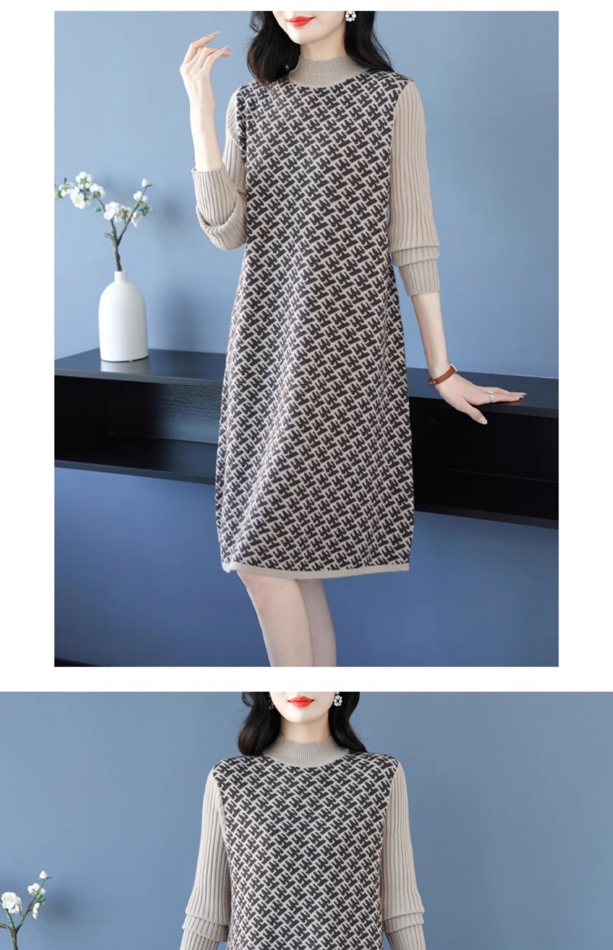 CC-16-9211秋冬提花中长款连衣裙女大码过膝配大衣针织打底毛衣裙
