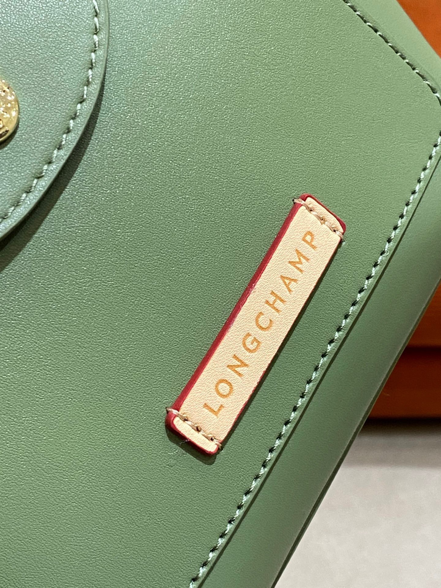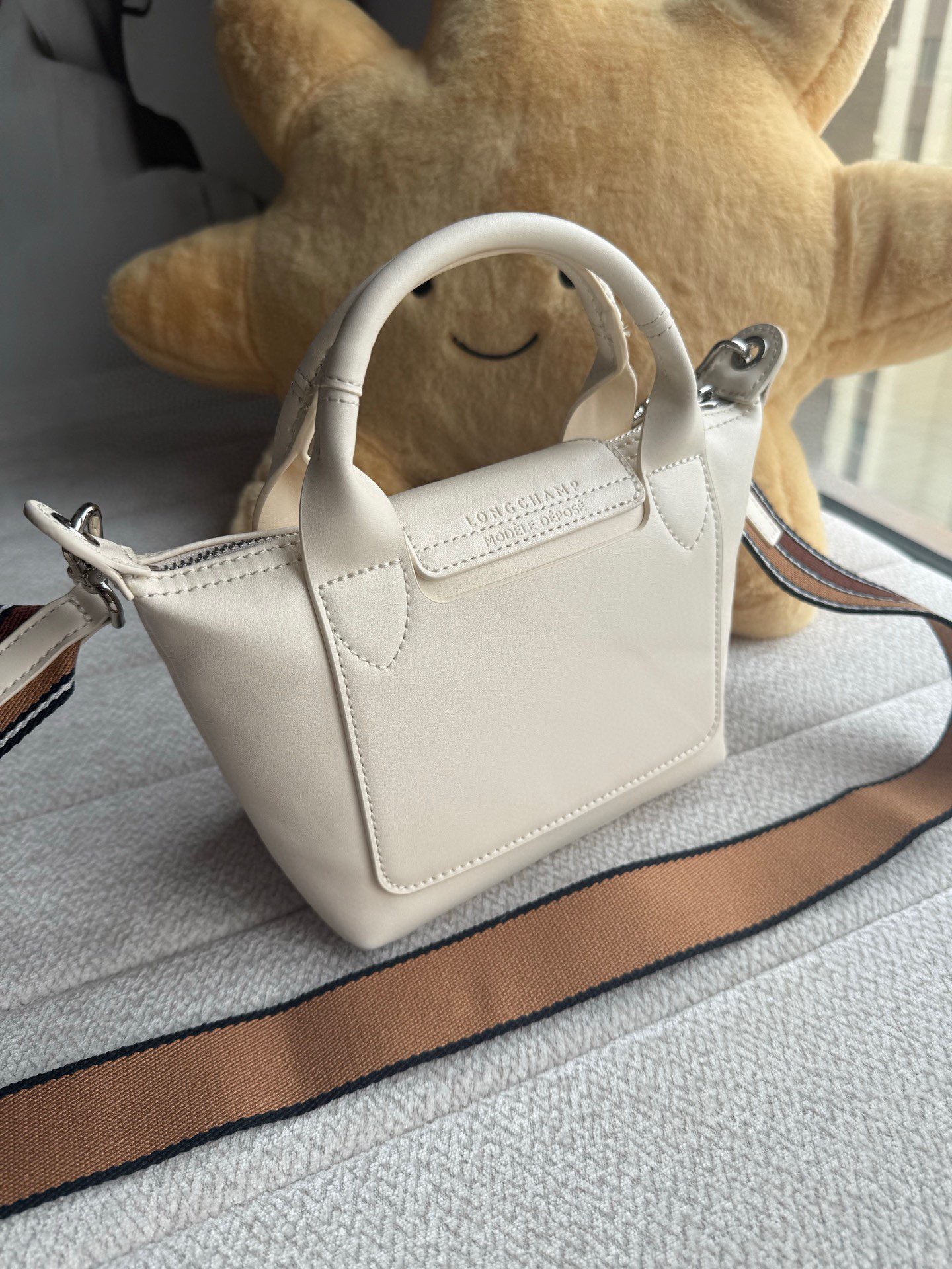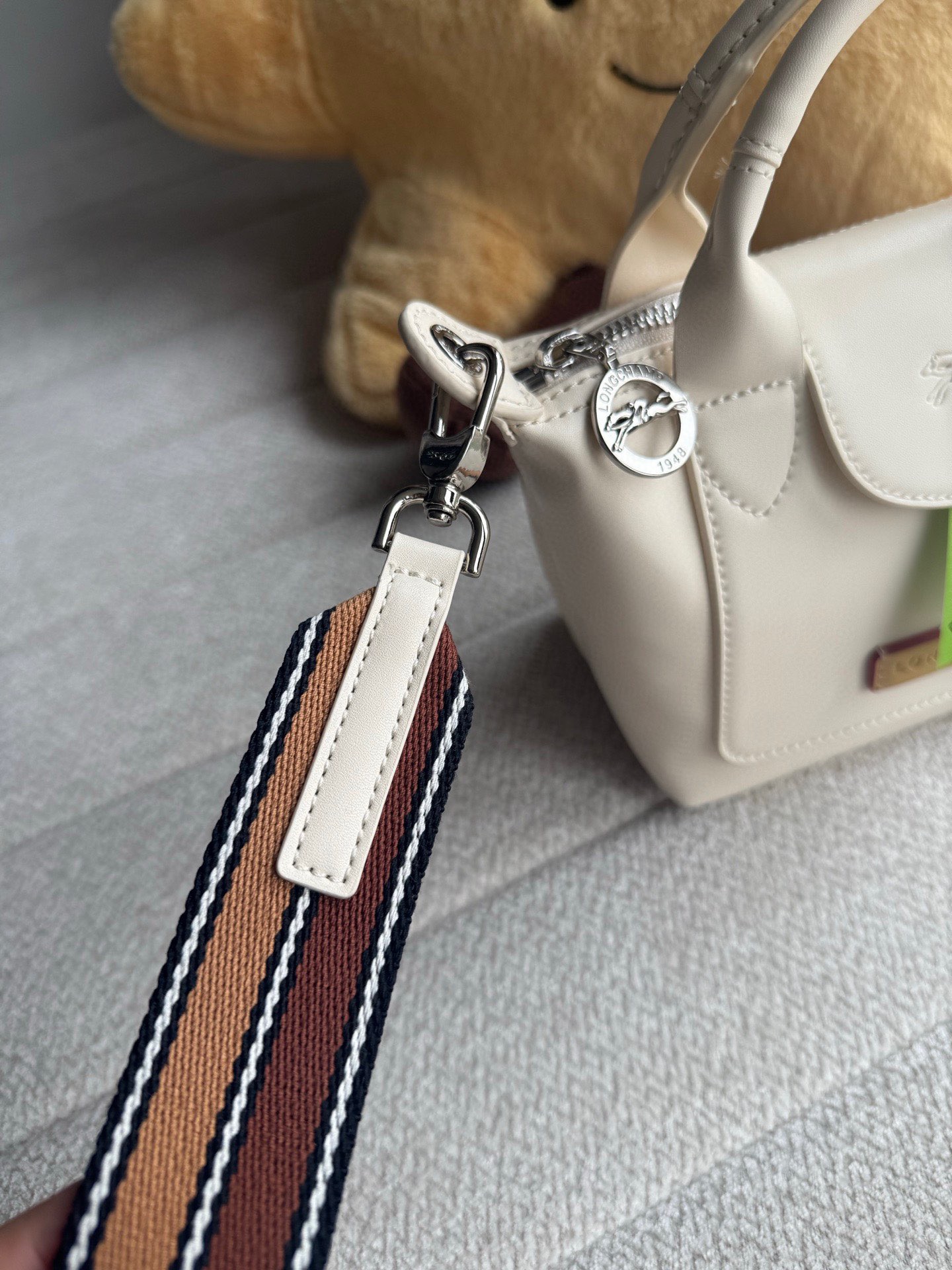 饰有 Longchamp logo 的撞色植鞣标签与光泽熠熠的按扣及可拆卸宽肩带的金属带扣相得益彰。