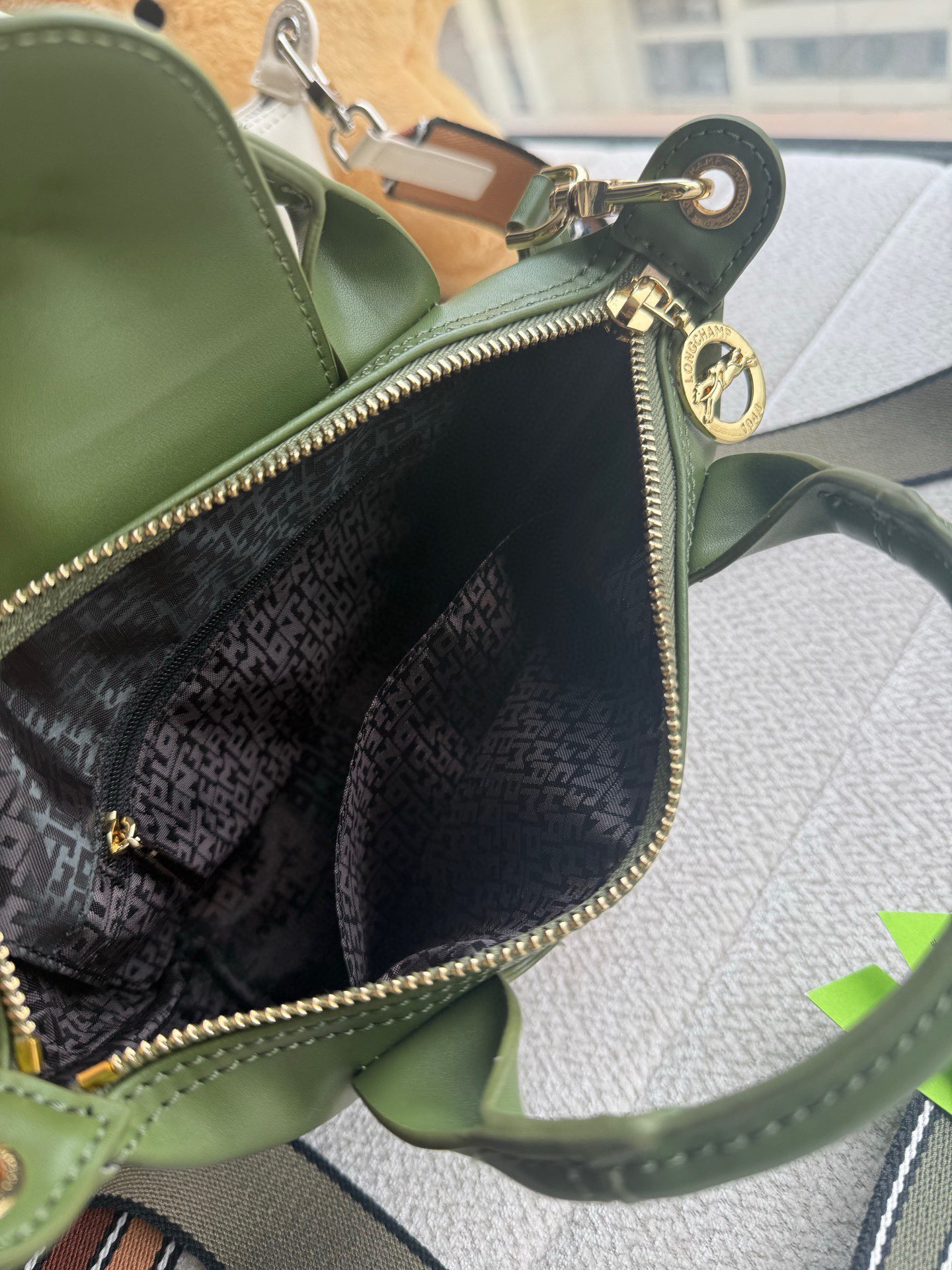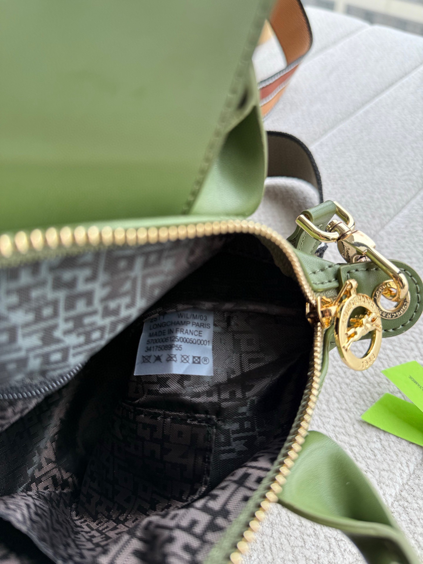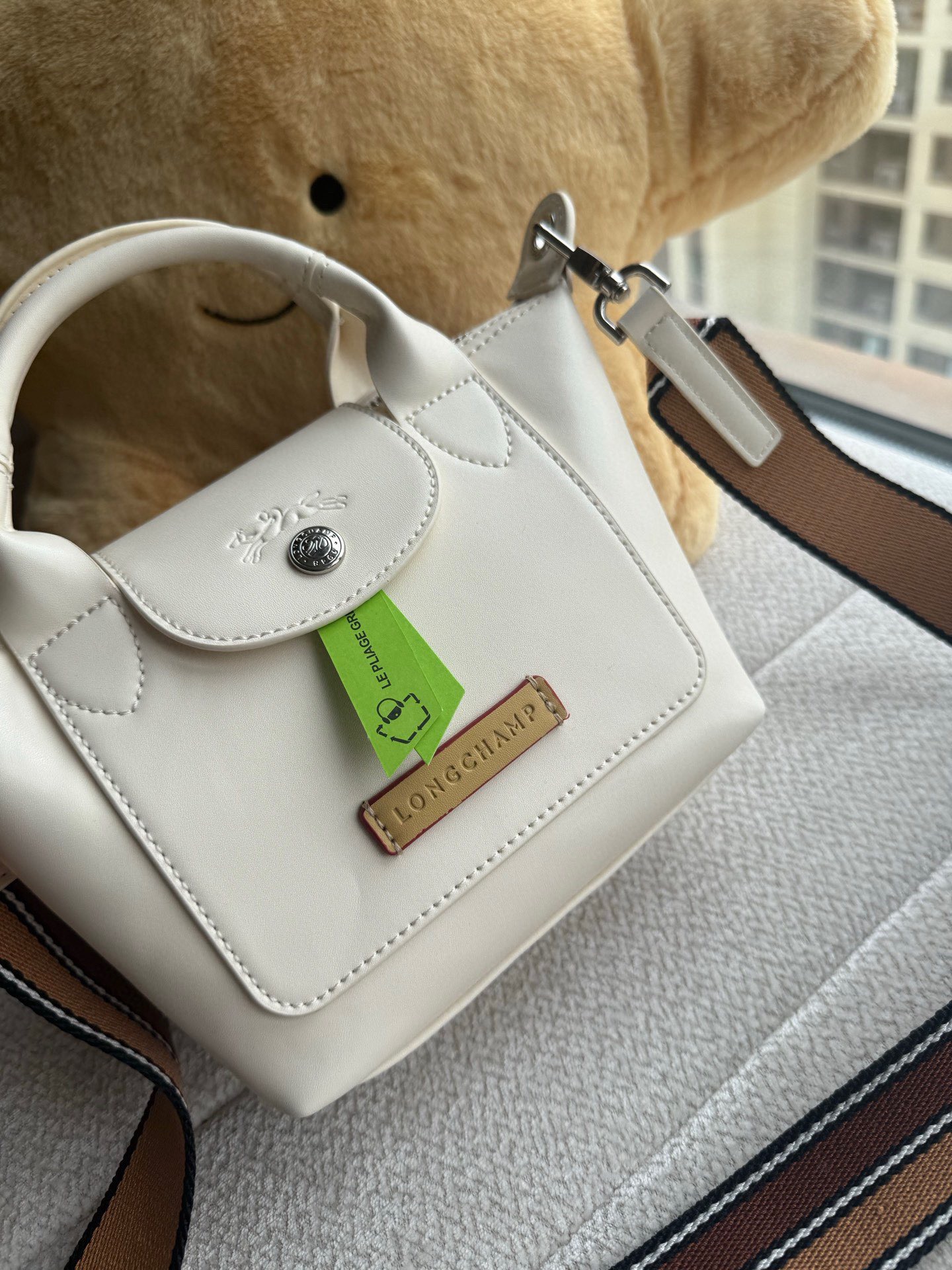 饰有 Longchamp logo 的撞色植鞣标签与光泽熠熠的按扣及可拆卸宽肩带的金属带扣相得益彰。
