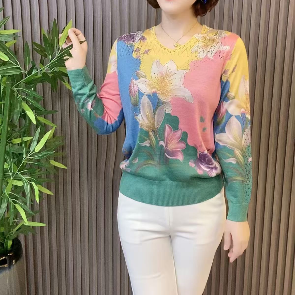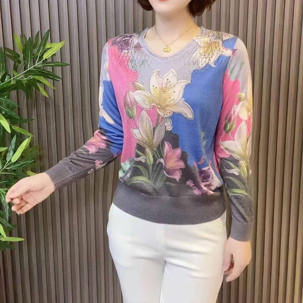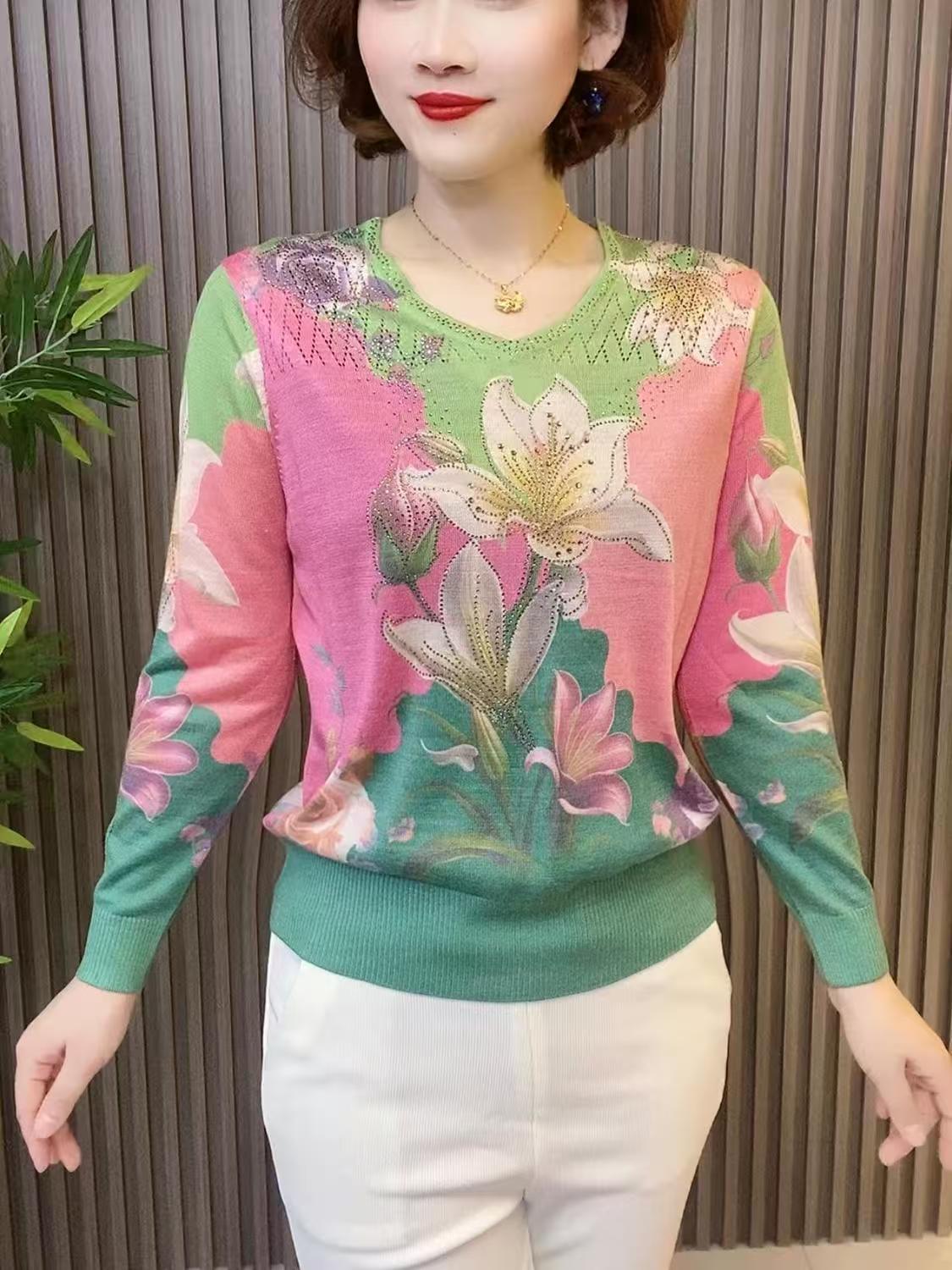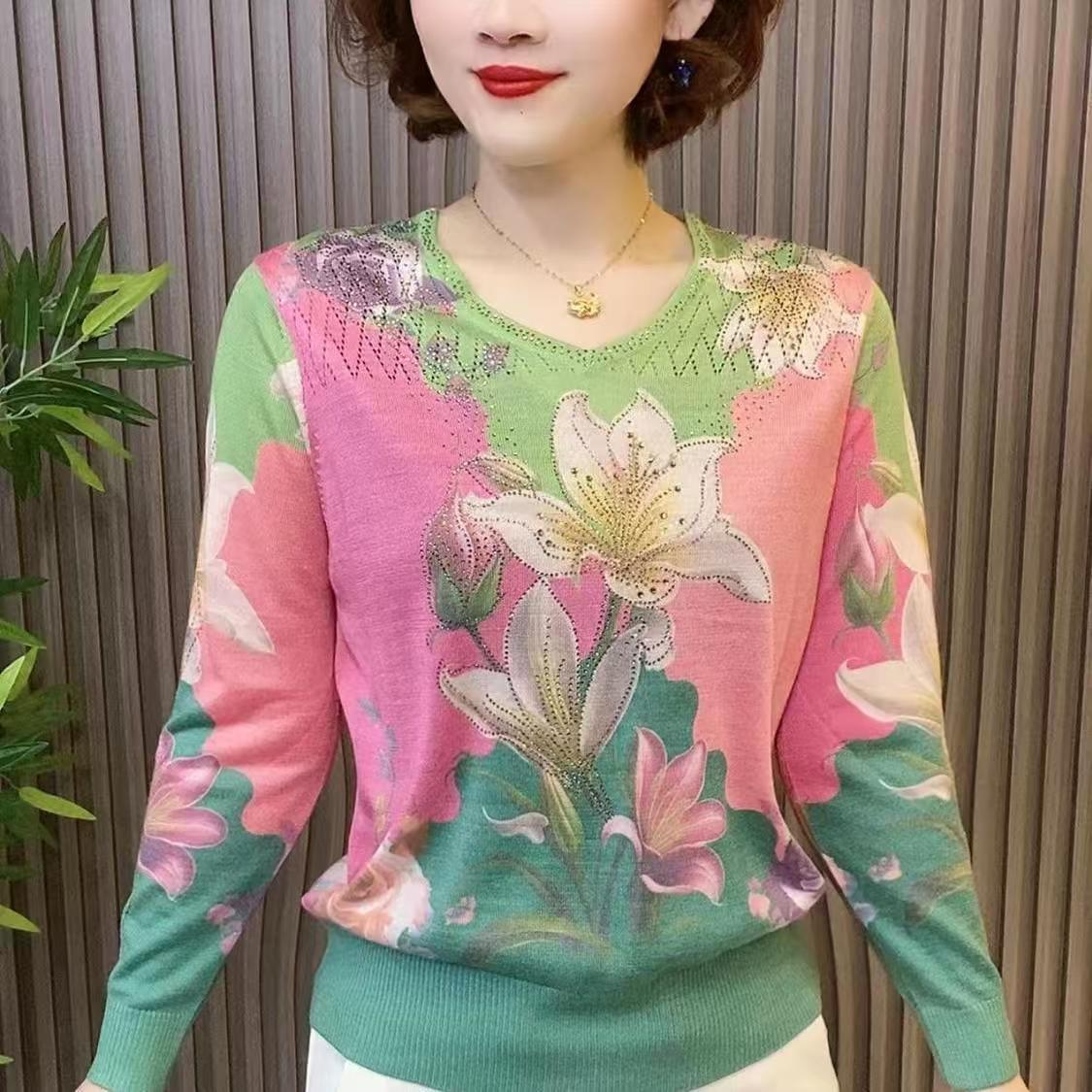 2025夏季镶钻天丝针织衫时尚显瘦长袖V领
