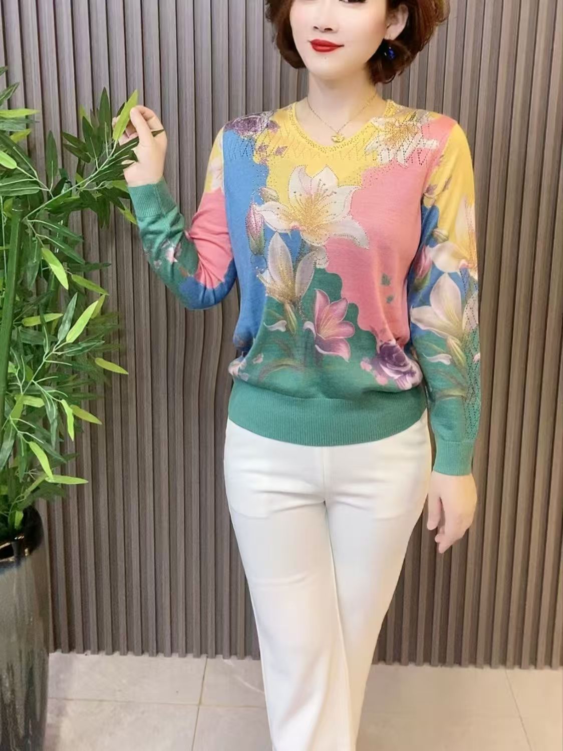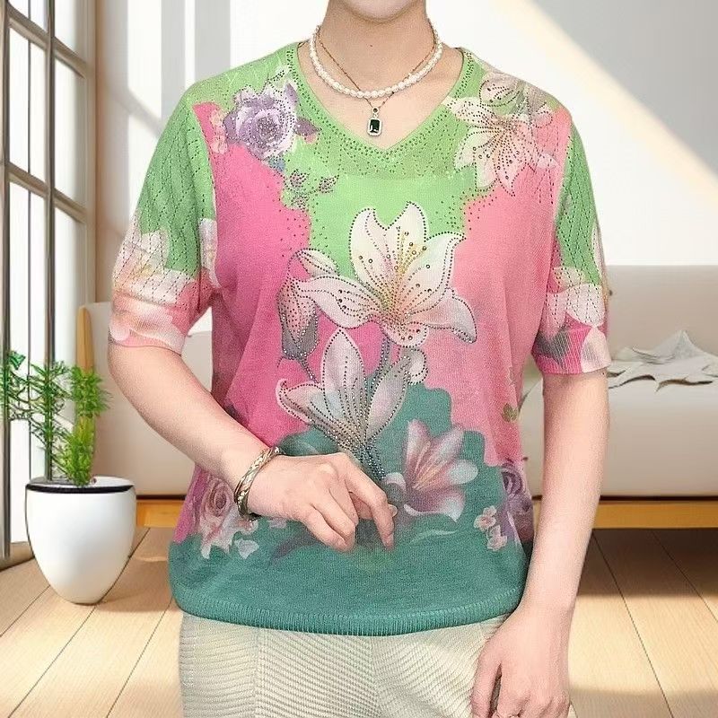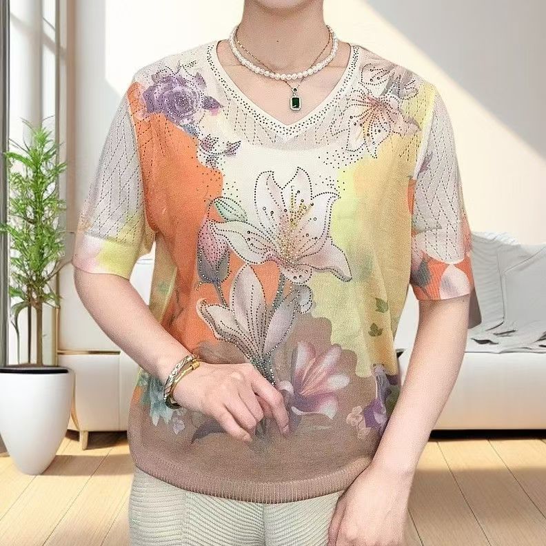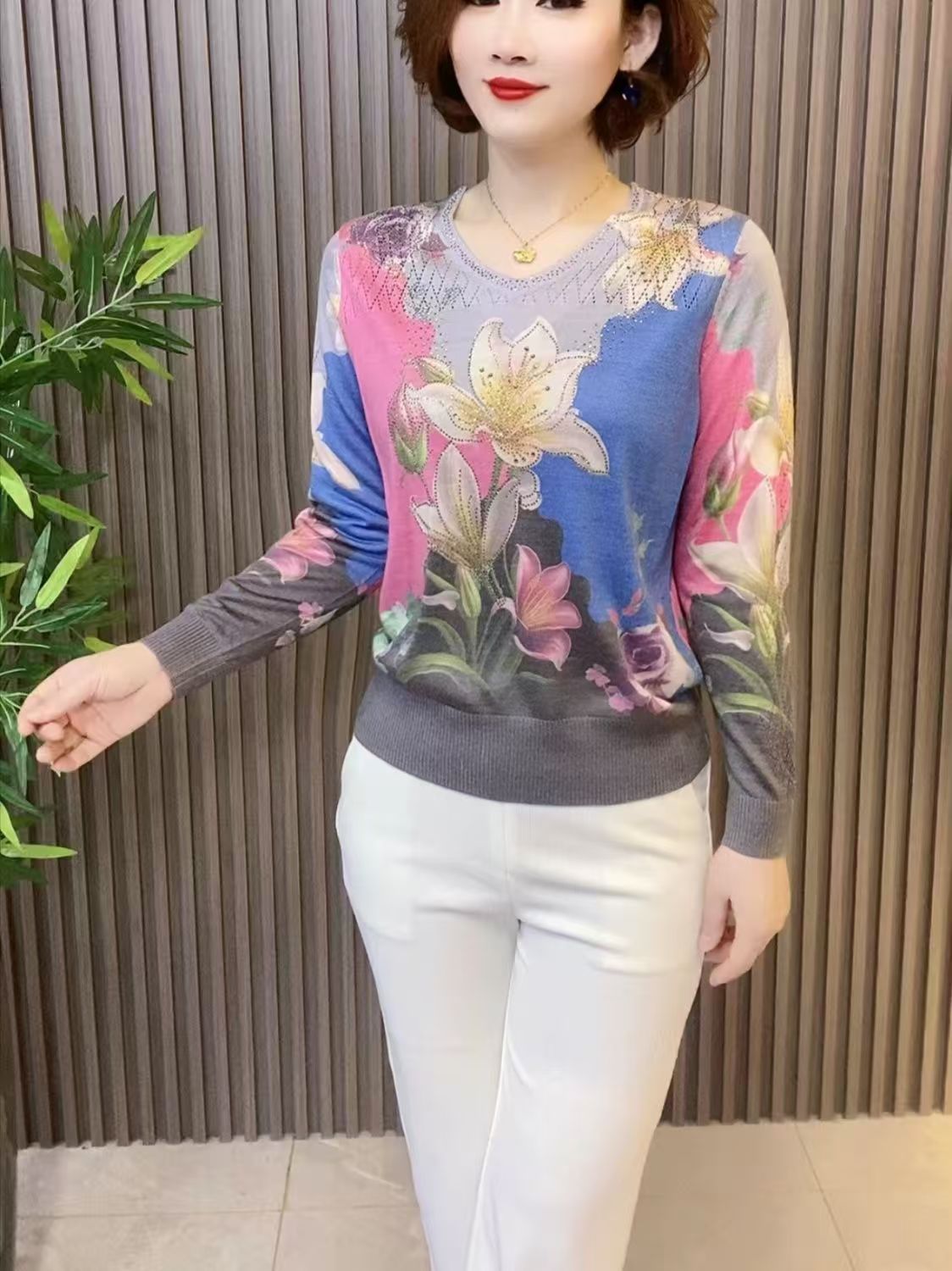 2025夏季镶钻天丝针织衫时尚显瘦长袖V领