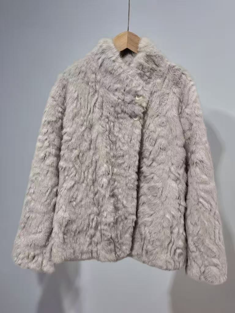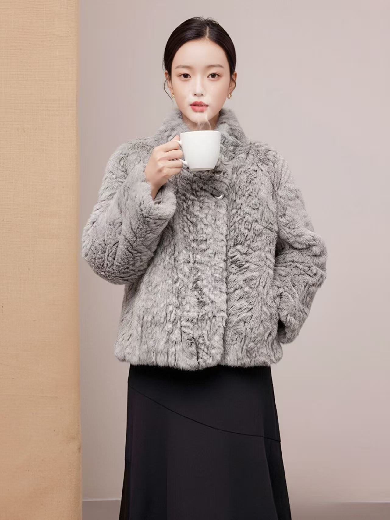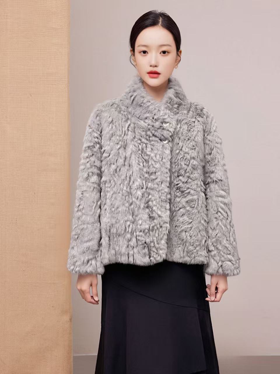 【环保皮草】P09立领灰色剪花皮毛一体秋冬大衣外套-喜出