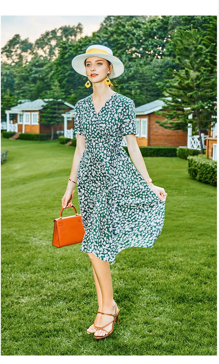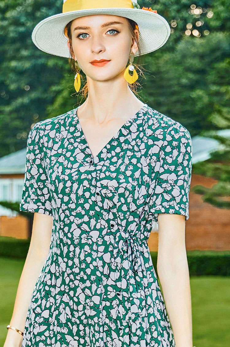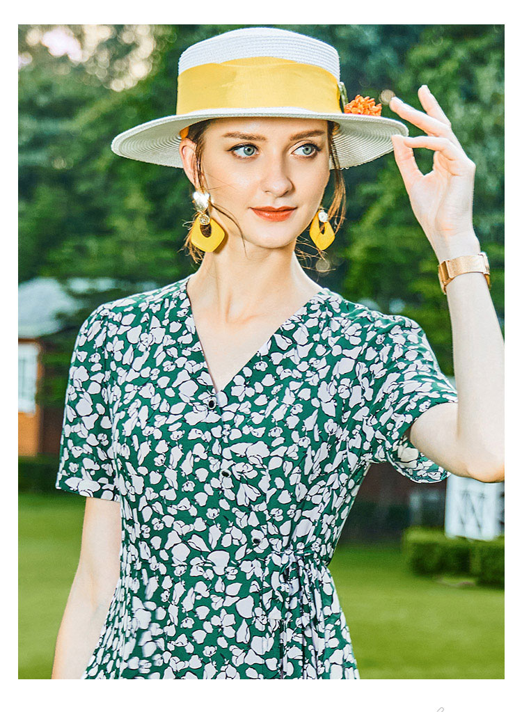 丁摩 夏季新款小碎花桑蚕丝连衣裙v领收腰时尚真丝裙子女Q121159-DW599