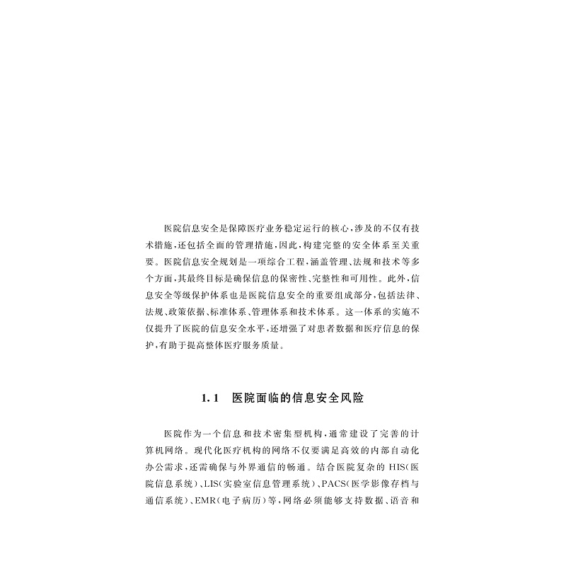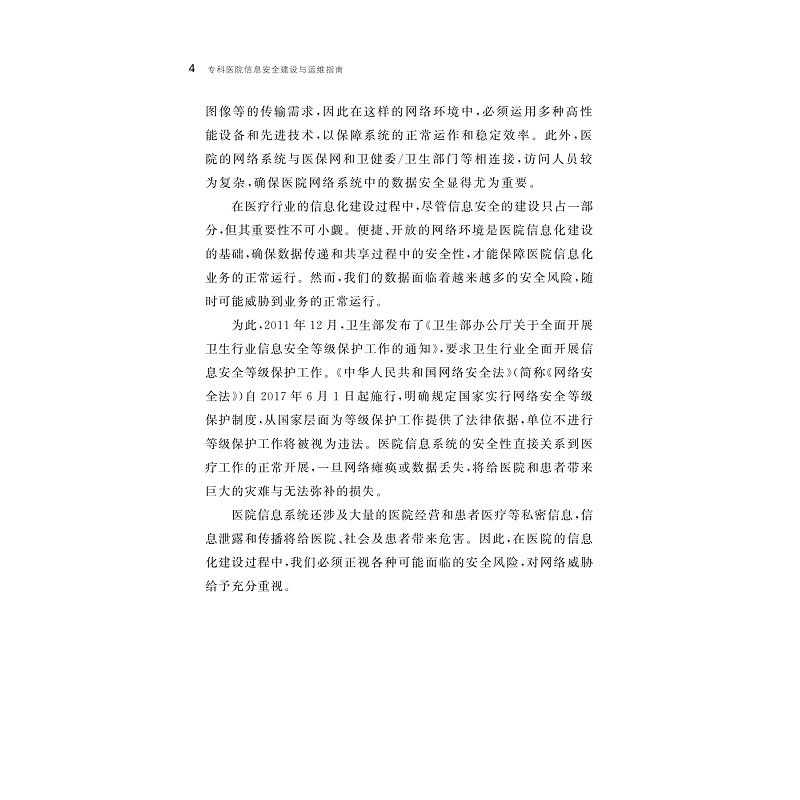本书旨在为专科医院提供一本全面的信息安全建设与运维指南,特别关注口腔专科医院的独特需求,从零开始,为专科医院安全体系的建设提供详细的指导,以确保全面的信息安全。本书覆盖从安全体系规划、方案设计、产品选型、部署实施,到日常运维等各个阶段的关键方面,同时强调日常运维的关键性,包括监控、漏洞管理和员工培训,以确保医院信息安全体系的持续有效性。本书意在帮助专科医院建立和维护强大的信息安全基础,以保护患者数据和确保医院的合规性。
