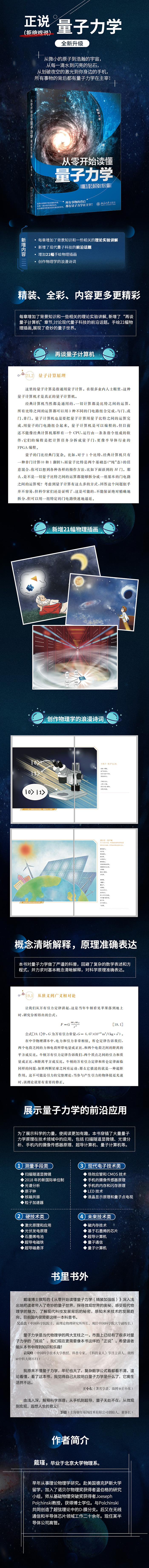 《从零开始读懂量子力学(精装加强版)》简装版上市10个月以来,共计印刷2.2万册,其专业性、通俗性深受读者欢迎, 在当当、、淘宝等主流平台,搜索“量子力学”关键字排在名,为满足读者提出的需求,精装版特做如下改进:1. 增加和改进图片,增加20张左右,都做成精美的彩色图片。2. 根据读者的反馈,理工科背景的读者觉得此书通俗易懂,文科背景的读者觉得此书很难懂,为此以文科生能懂的语言,解释本章的主要知识点。3. 改进版式,提高阅读体验。4. 应读者要求增加一章:量子科技前沿,包括量子计算,作者发明的弦论D膜理论,圈量子引力理论等等。