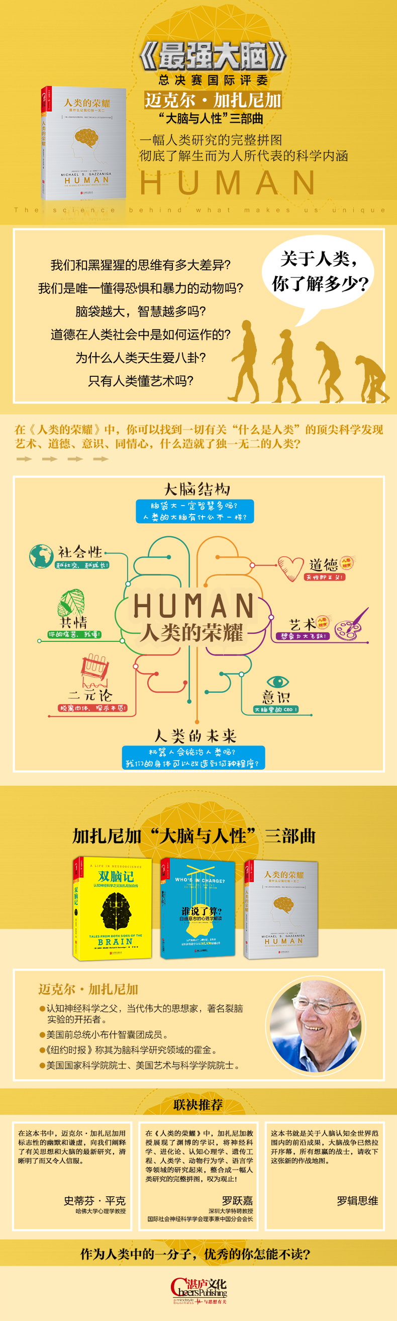 在《人类的荣耀》中,加扎尼加教授展现了渊博的学识,将神经科学、进化论、认知心理学、遗传工程、人类学、动物行为学、语言学等领域的研究起来,整合成一幅人类研究的完整拼图,叹为观止!我们可以从基础的脑细胞构造,一路走进大脑功能的核心,更能进一步追寻人类未来的发展方向。这本书值得每个关心科学、关心人类自身的人仔细阅读。