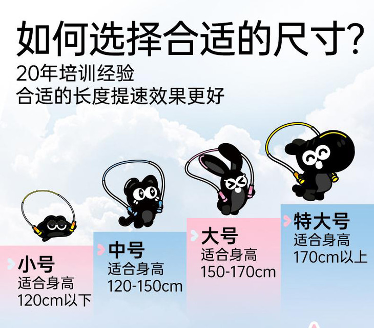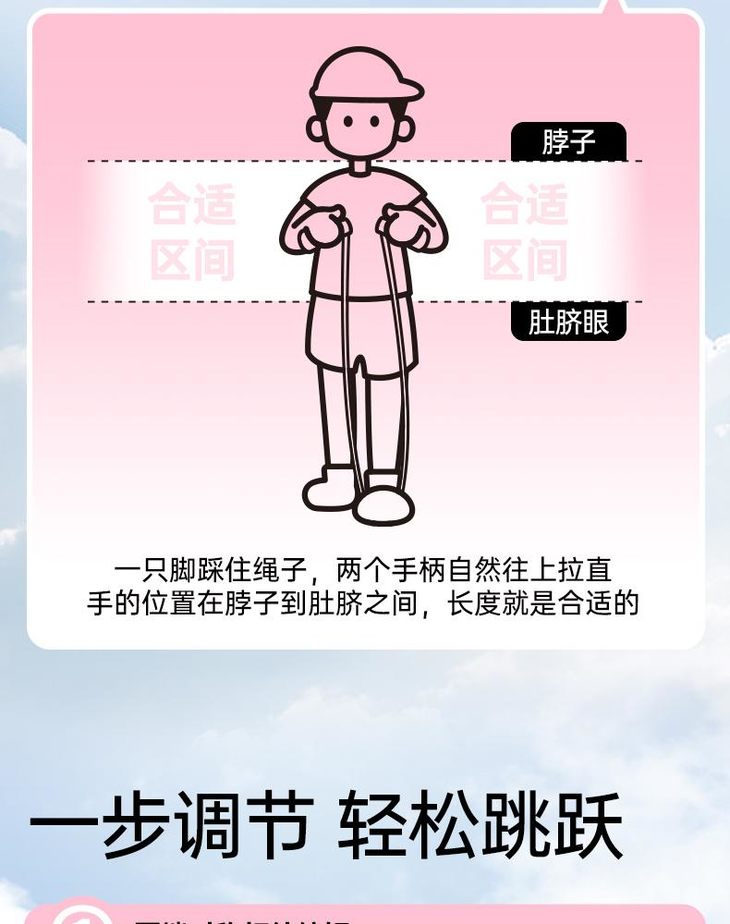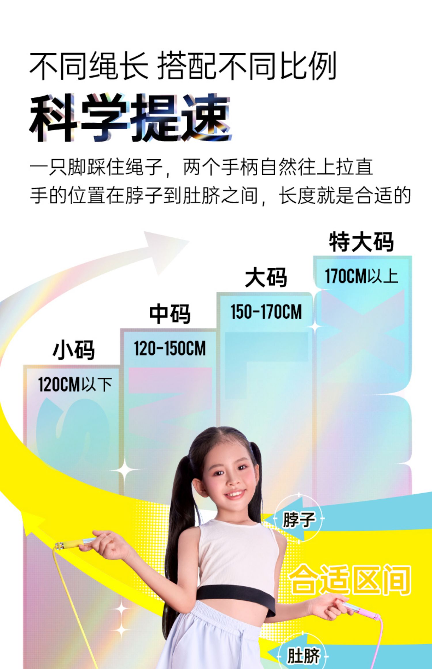 分4个码数,可以根据身高选择,正确调节长度,没有多余的绳子阻碍,用起来轻松不累赘。