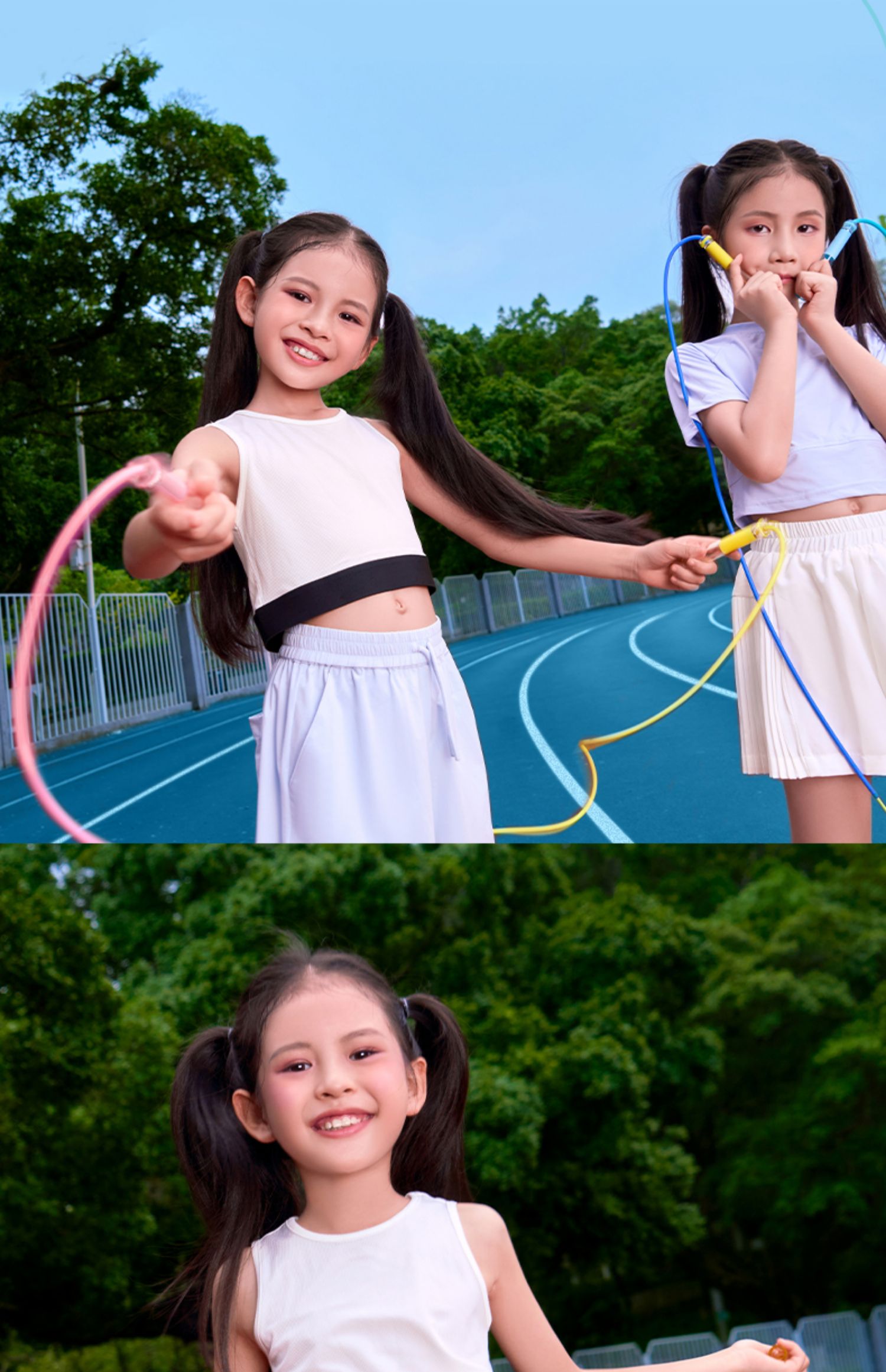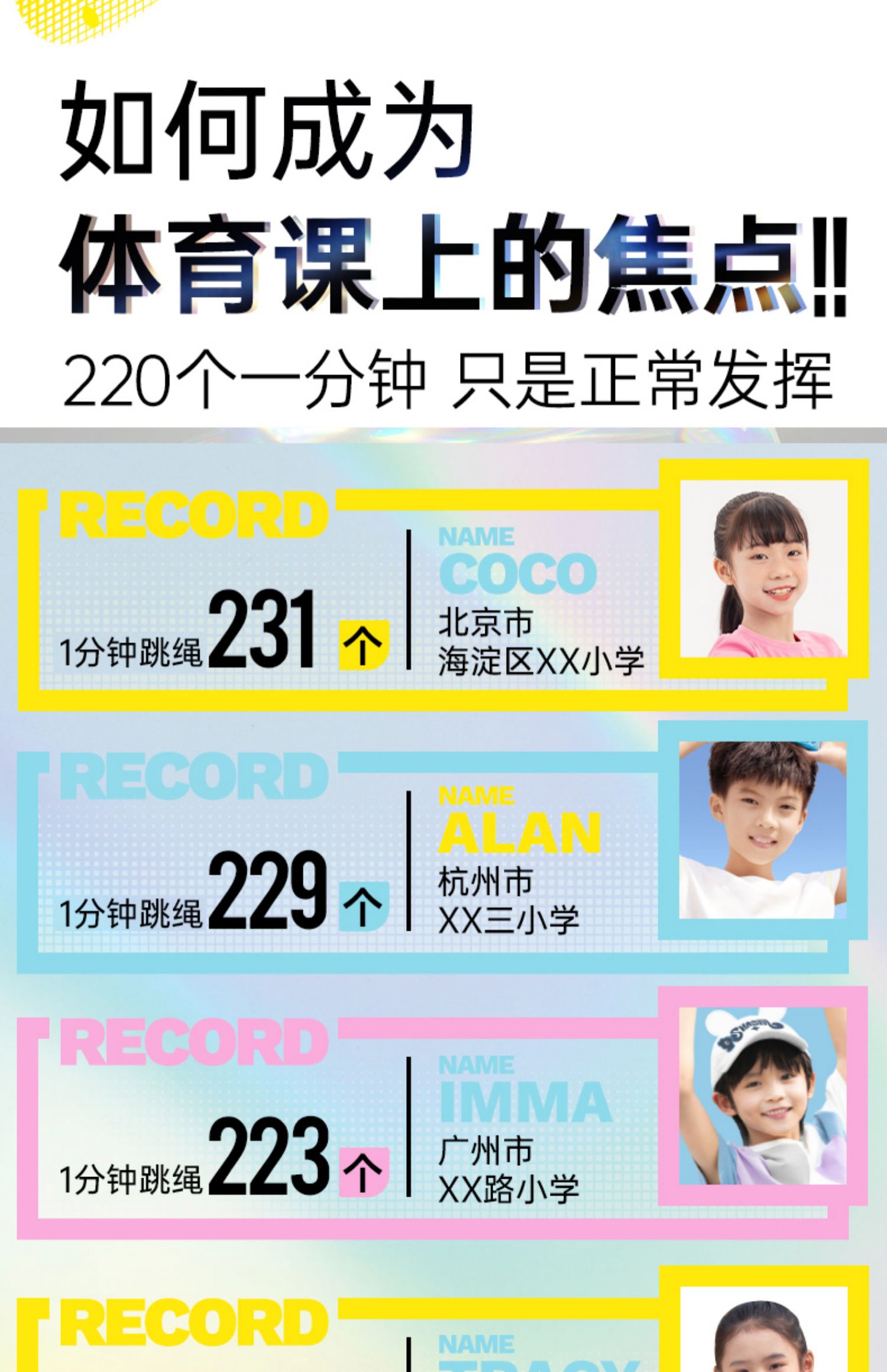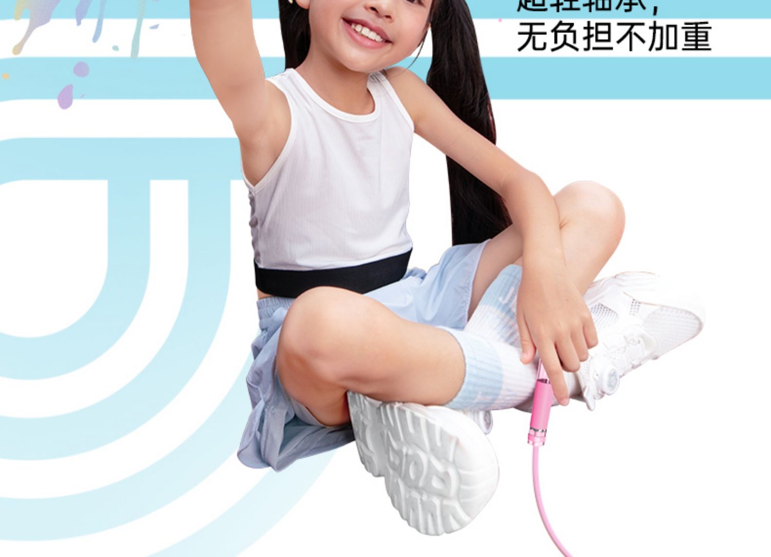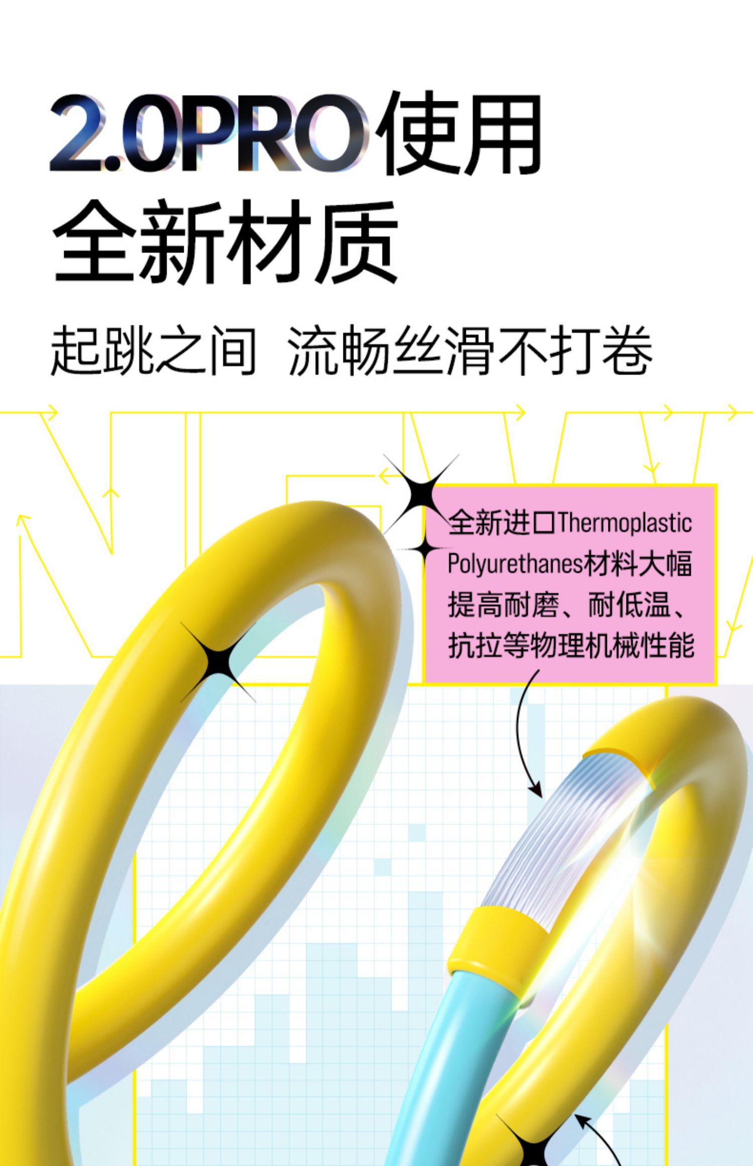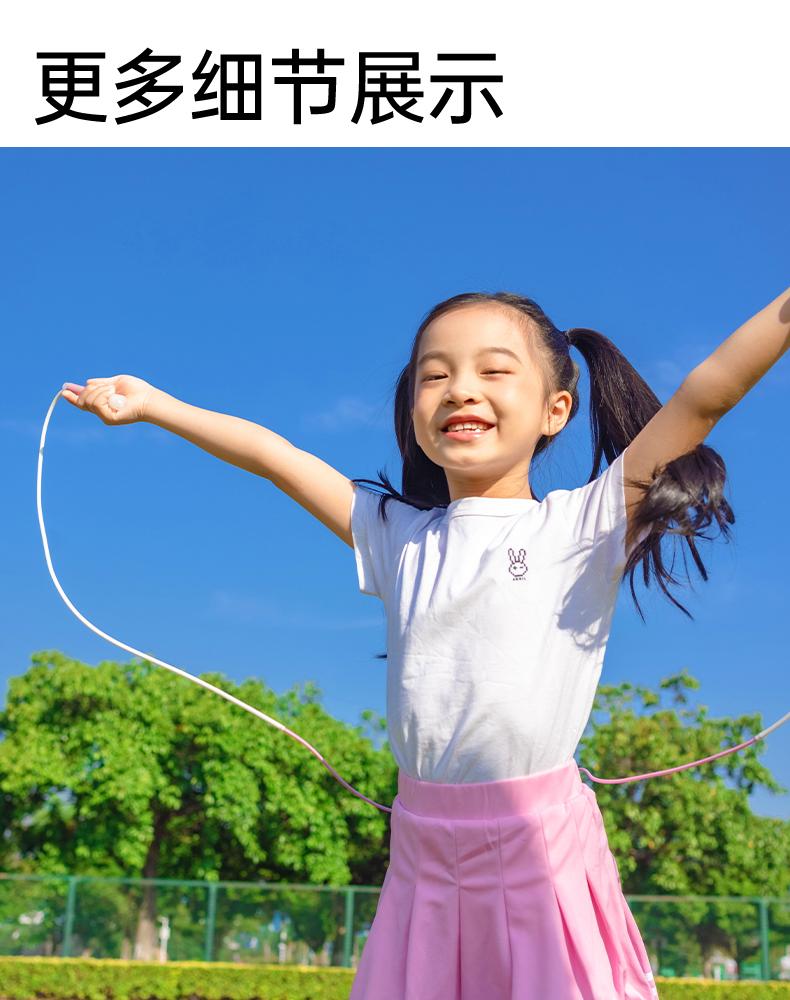 4、2.0PRO的绳体和手柄都大胆采用了撞色的设计。绳体的每次打击都是潮与布的碰撞,让孩子充分享受跳绳的乐趣。