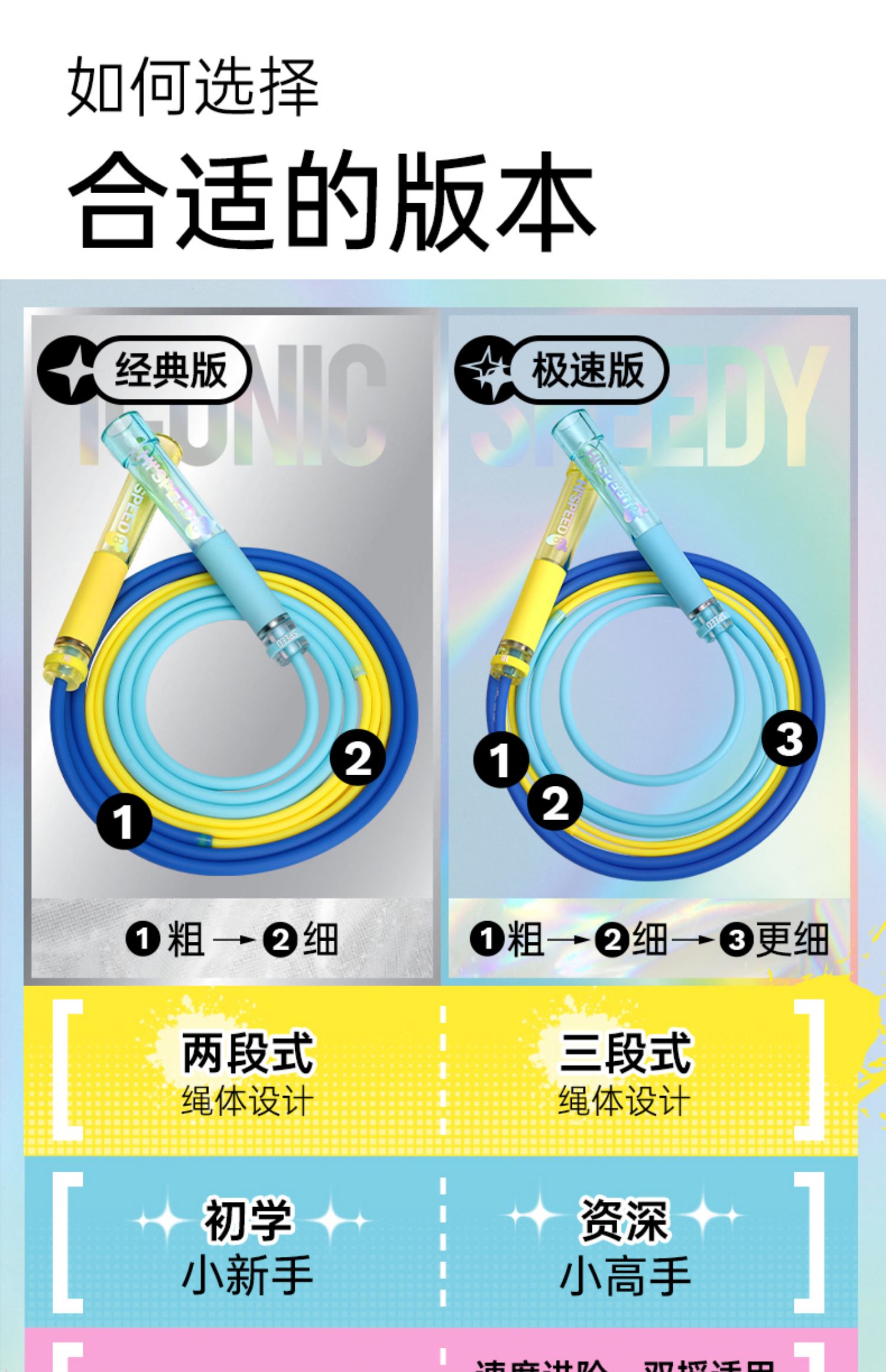 经典款二分段设计,适合日常锻炼、初学者,稳固提高,更容易上手。极速款三分段设计,使用感轻快,适合提速、双飞、进阶,需要有一定的跳绳基础(建议1分钟/130个以上再选择)。