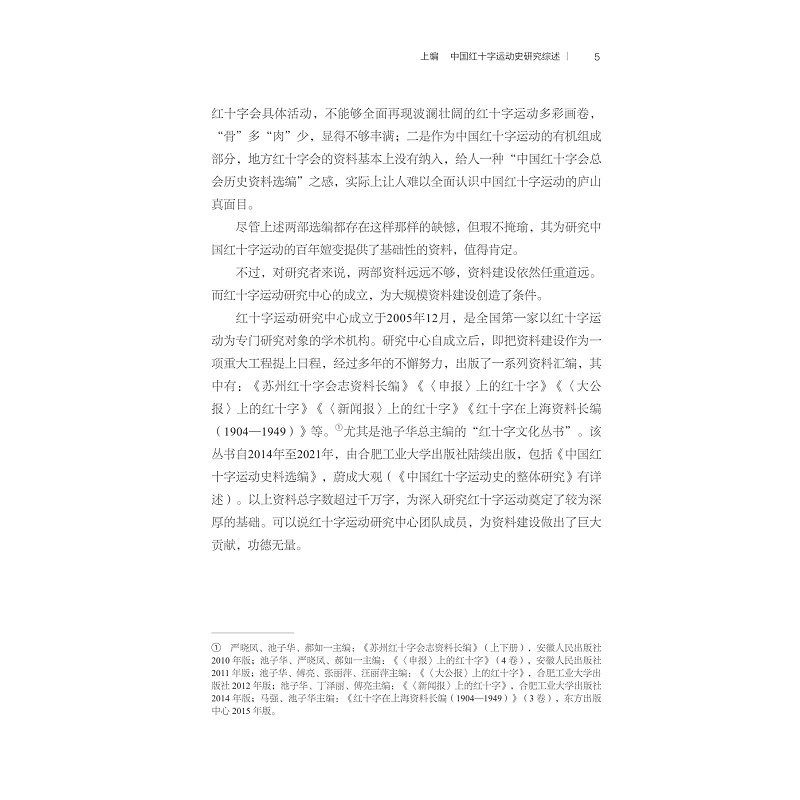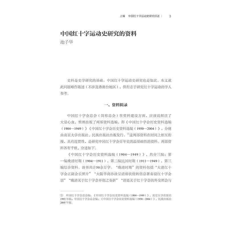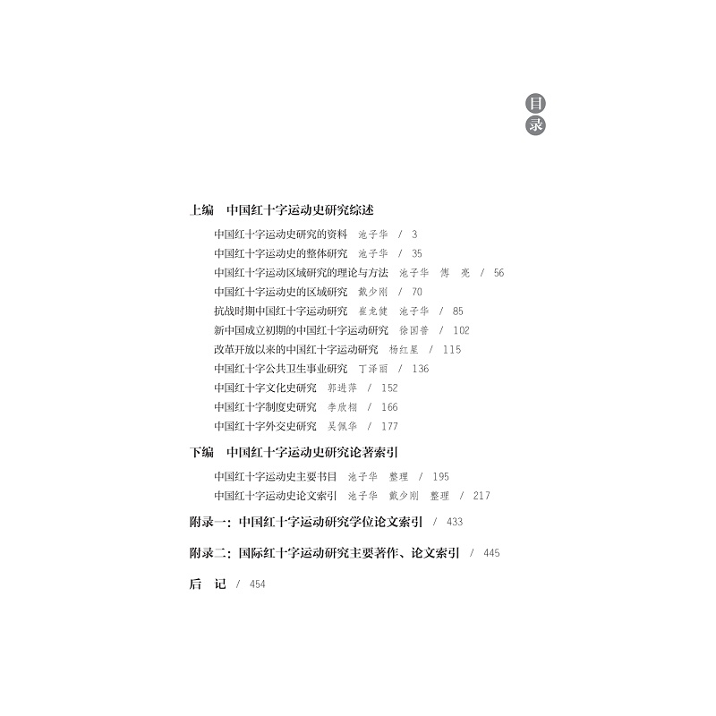 本书内容分上下两编。上编为“中国红十字运动史研究综述”,是研究进程、研究成果的“回顾”,同时“展望”未来,对研究的前景提出一管之见。“综述”是集体劳动的结晶,由11篇文章组成。下编为“中国红十字运动史研究论著索引”,包括“中国红十字运动史主要书目”“中国红十字运动史论文索引”,以及附录(中国红十字运动研究学位论文索引,国际红十字运动研究主要著作、论文索引)。本书是国内第一本系统梳理新时期40多年来中国红十字研究学术发展的著作,既对中国红十字研究的资料、成果做了全面整理,并对该研究领域的理论、方法及专题做了重点阐述。