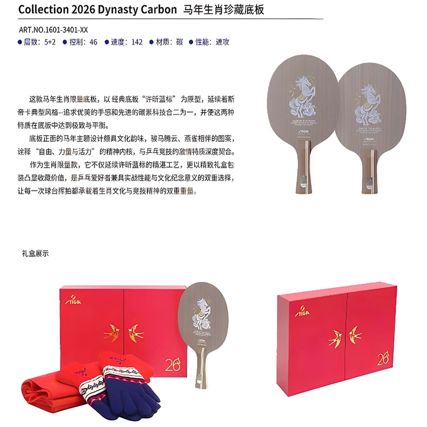 商品名称:【内赠羊绒围巾手套】Stiga斯帝卡斯蒂卡乒乓球拍底板马年纪念生肖限量款许昕蓝标同结构乒乓底板
