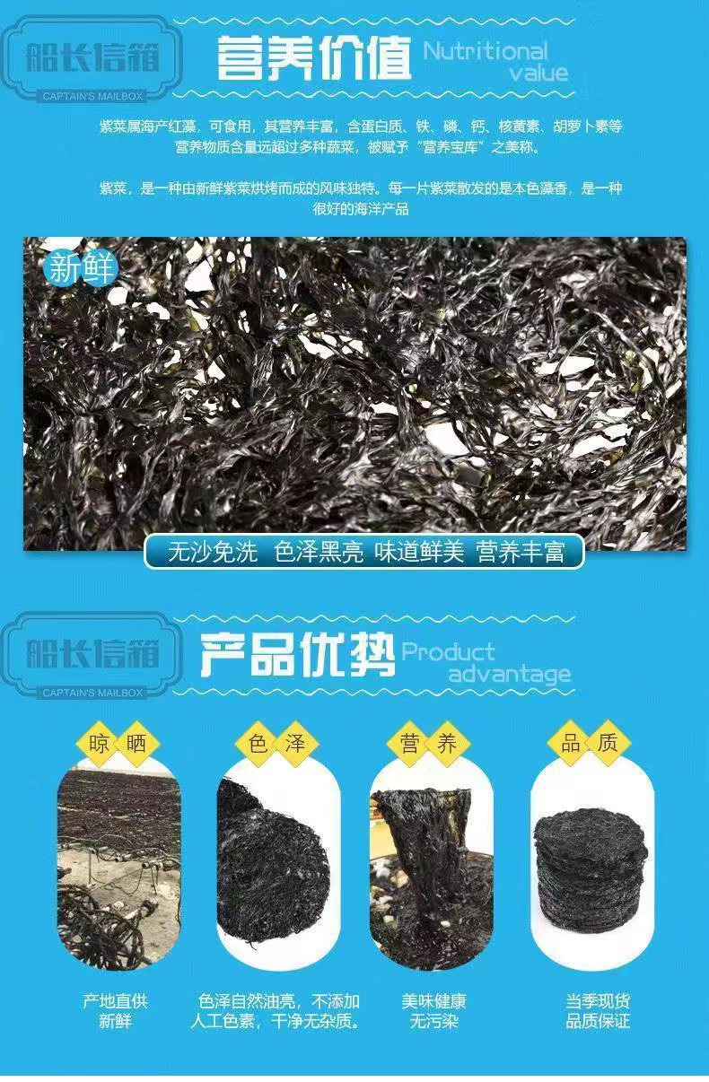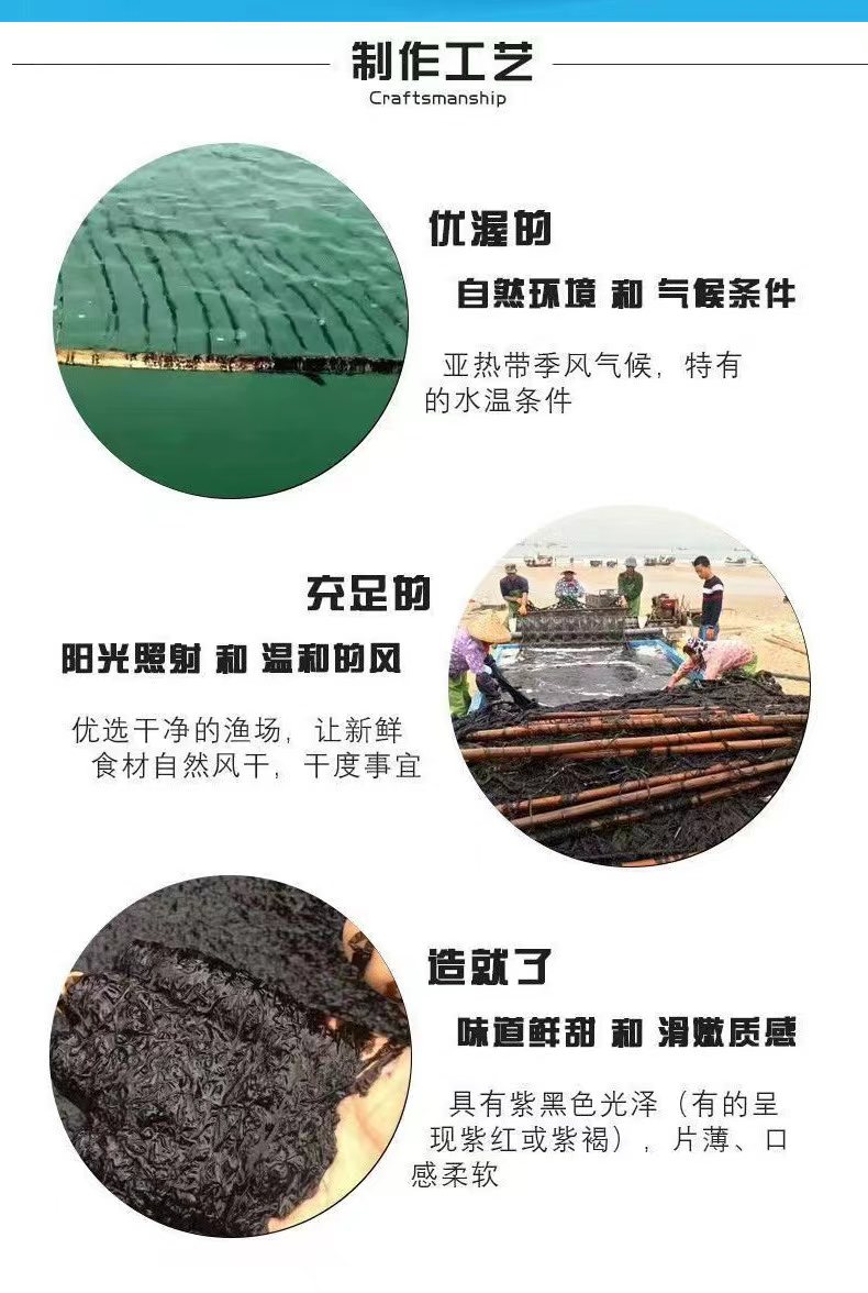 品名:福建六鳌头水紫菜规格:1袋装 (250g/包)包装方式:袋装 快递:中通 运费模板:北京,上海+1元。内蒙古,甘肃,新疆,西藏,青海,宁夏不发货 发货时效:48小时 发货地/产地:福建漳州 保质期:12个月 销售售卖期:长期 周六周天、节假日除外,早上十点之前的订单是48小时发货 ,到货时间约为2-5天,请您耐心等待 |