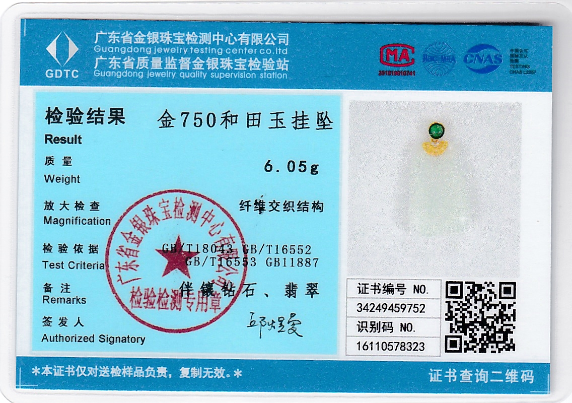 18k古法黄金和田玉(白玉)吊坠